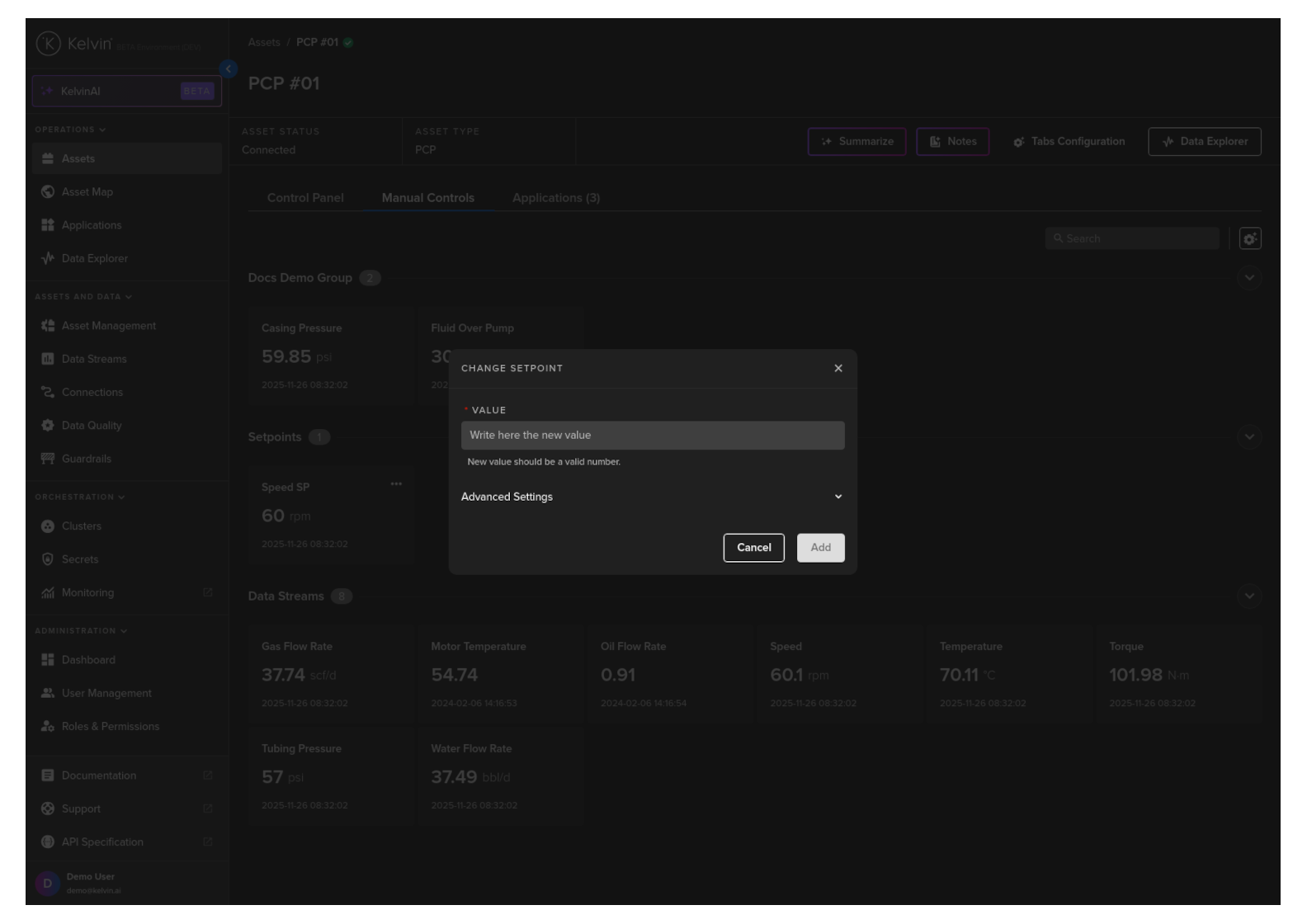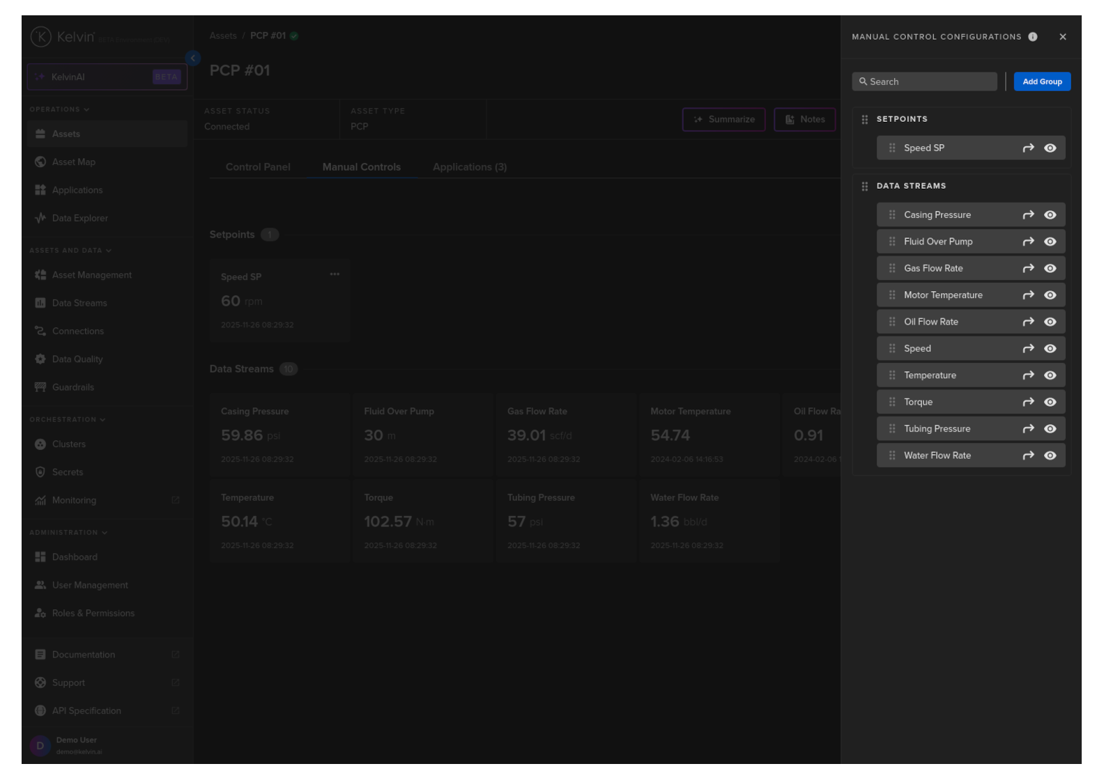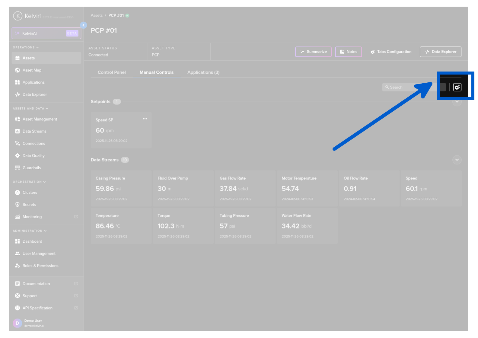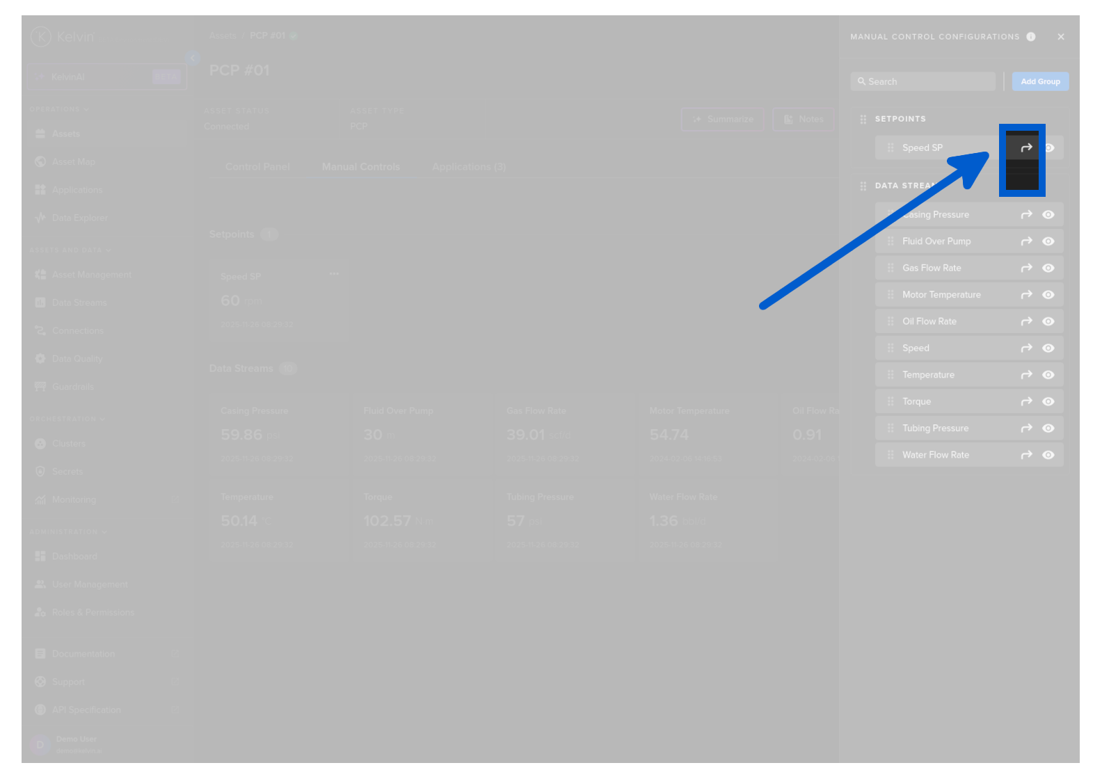 On this page you will learn about monitoring live values and changing values of Data Streams related to the selected Asset in Manual Controls in Kelvin UI.