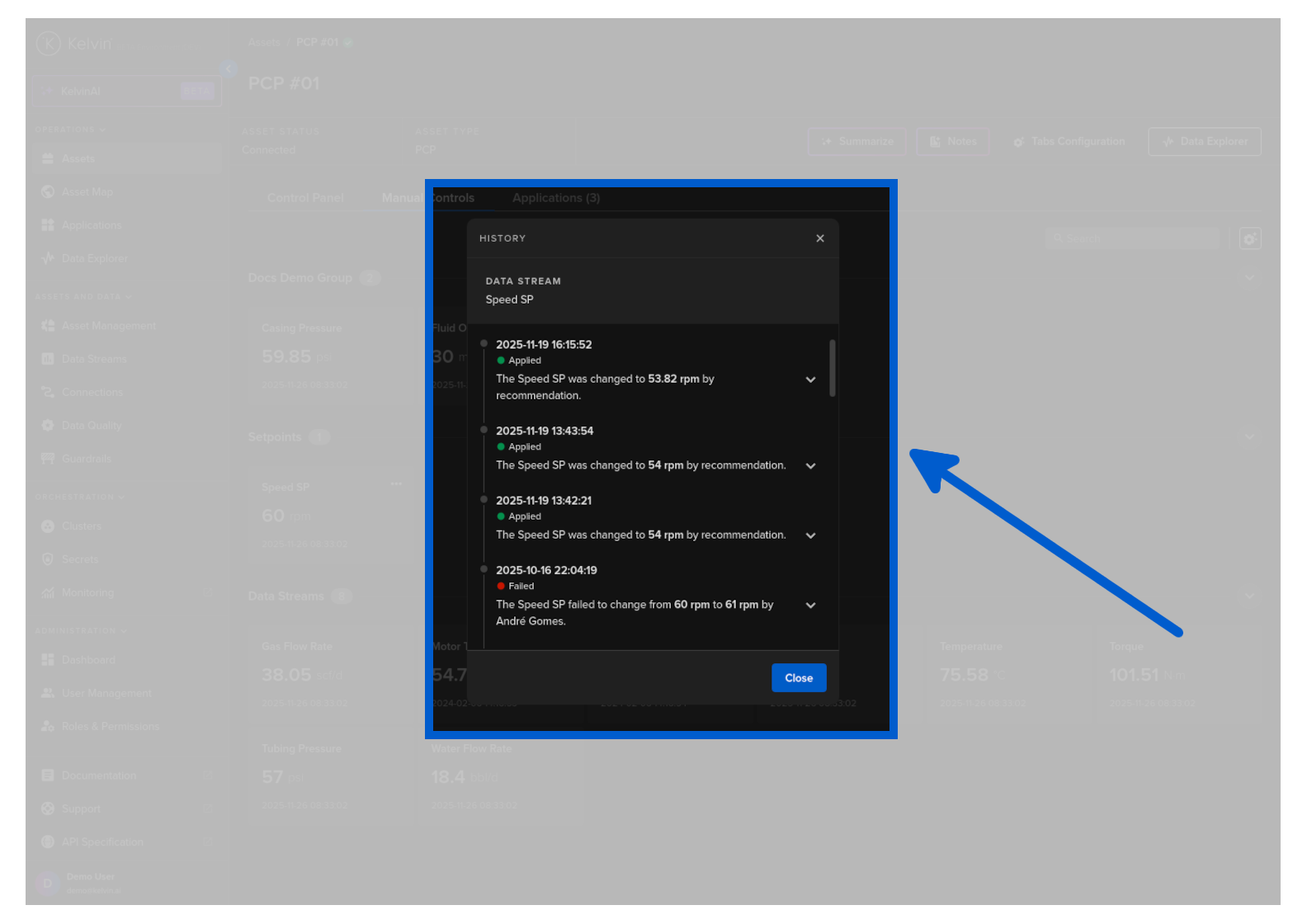 To see the history of Control Changes for a particular Asset / Data Stream pair, click on the hamburger menu in the card containing the data value of interest.