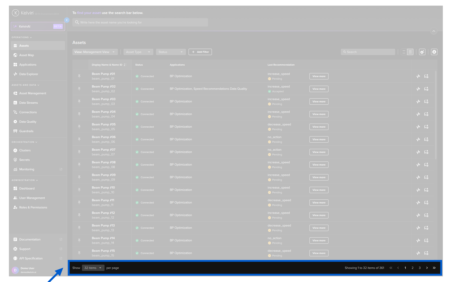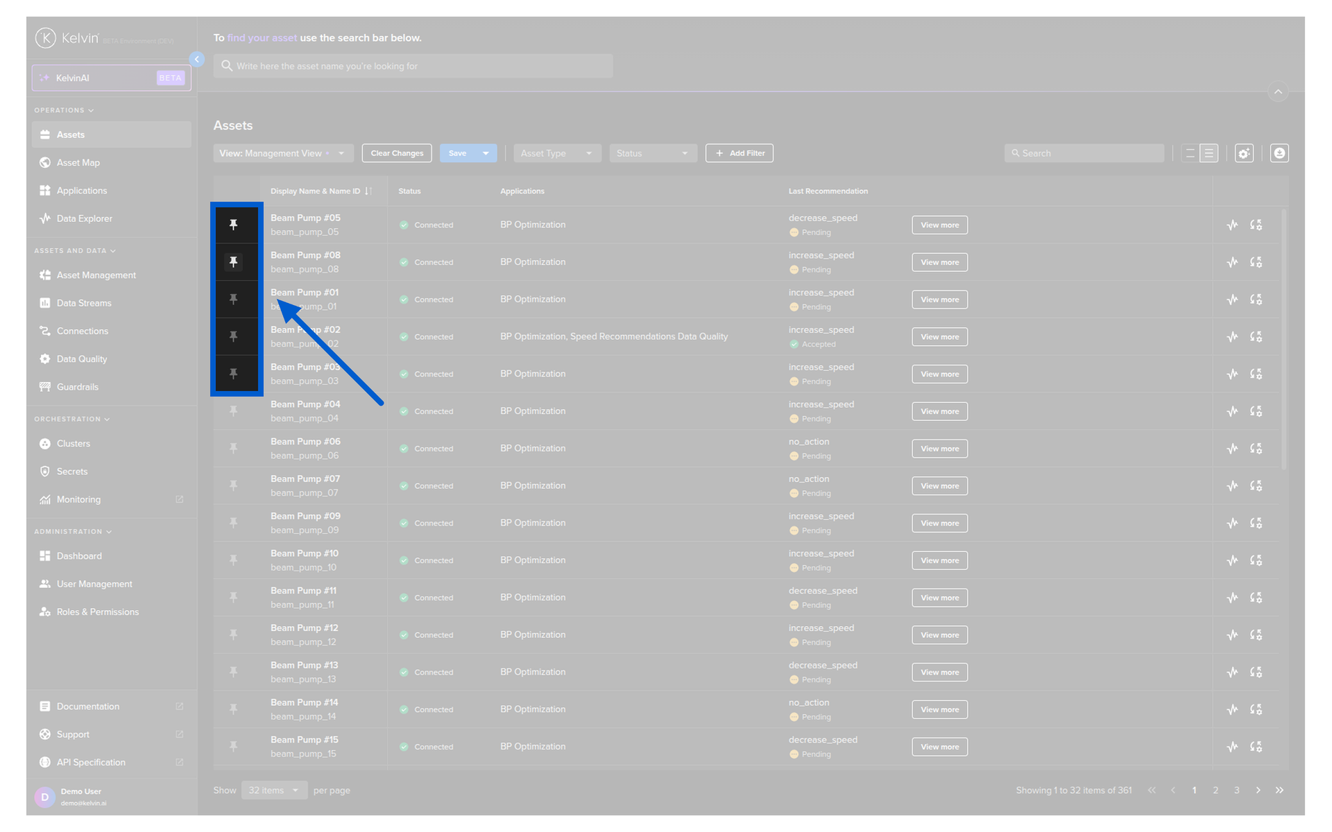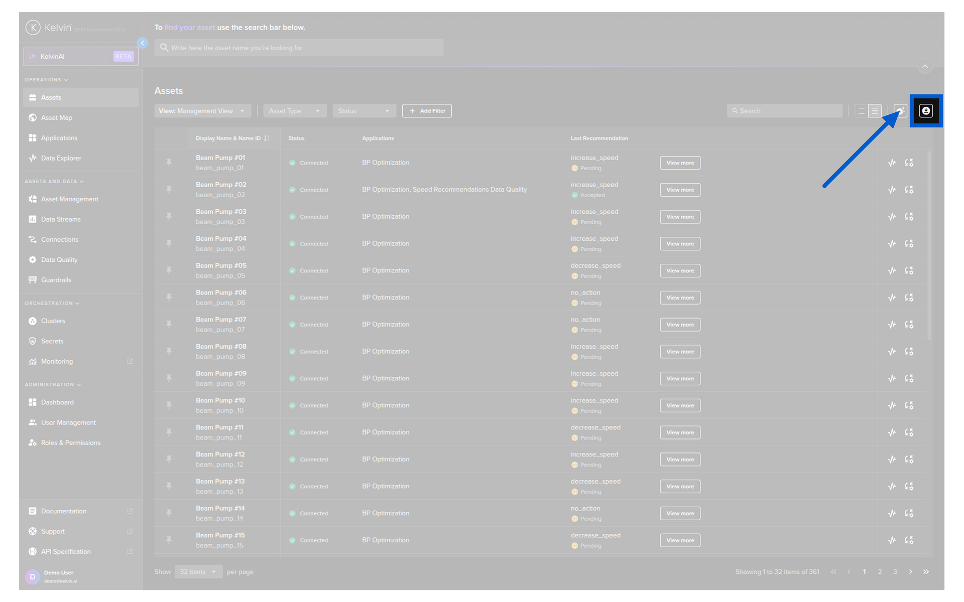 Here you have a list of all Assets registered in Kelvin. From here you can see the Assets and associated information.