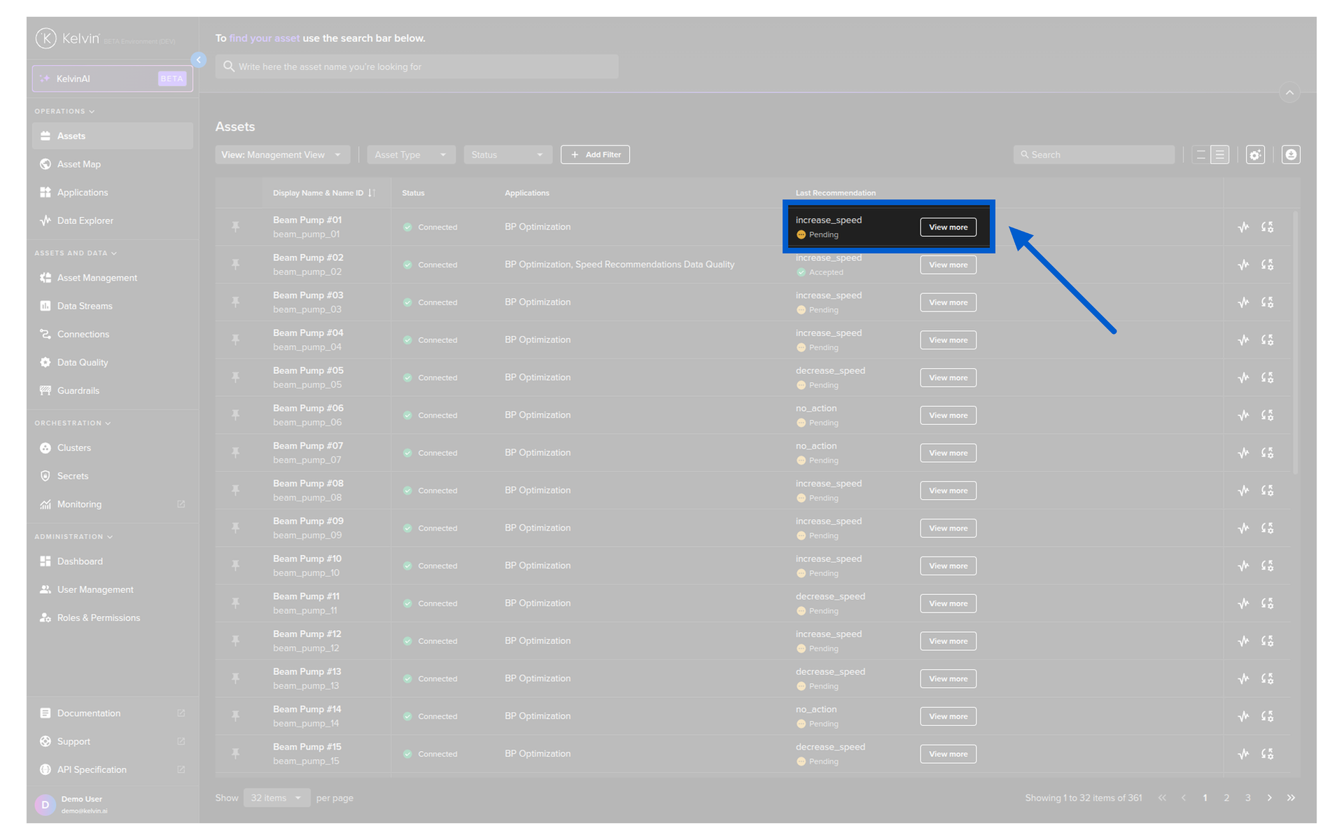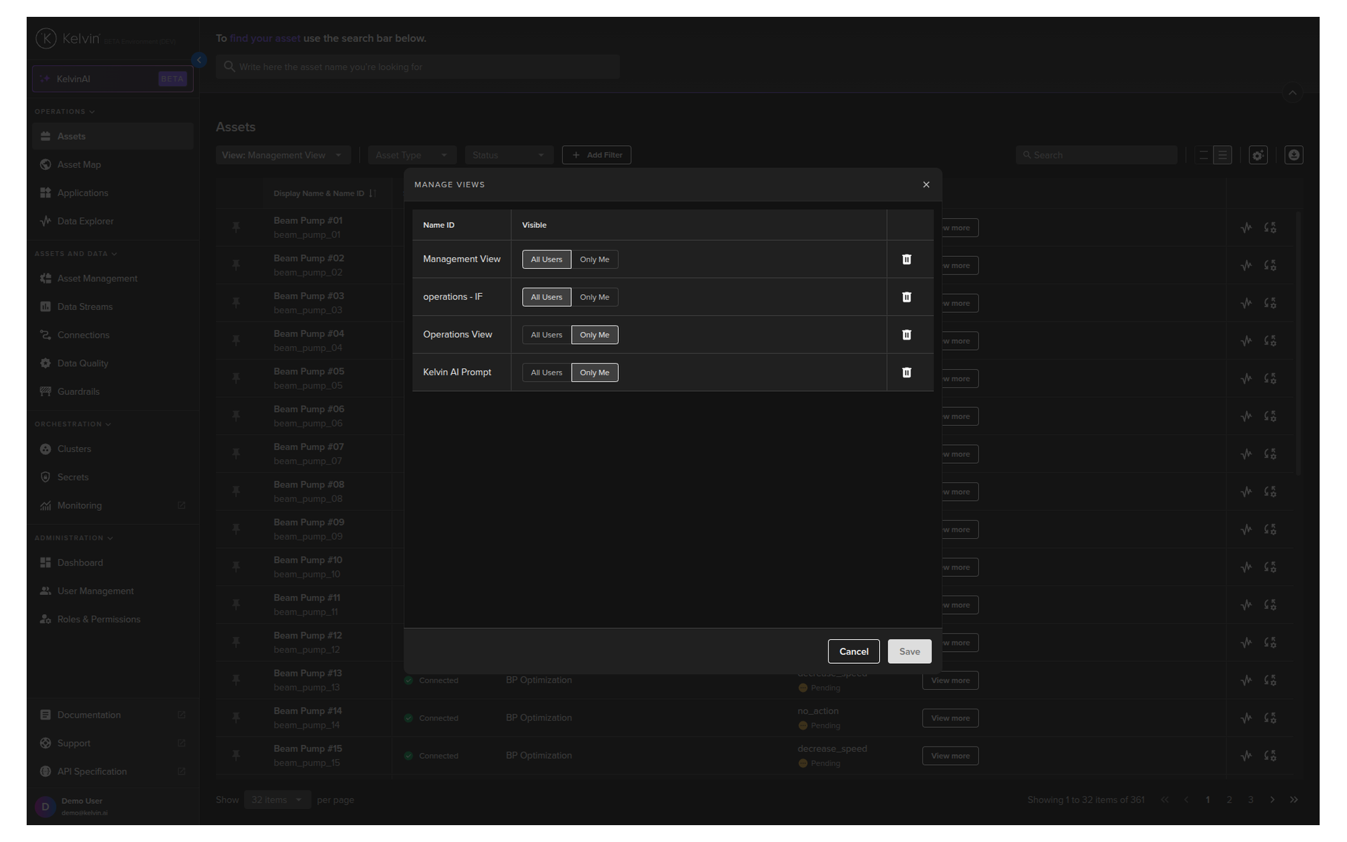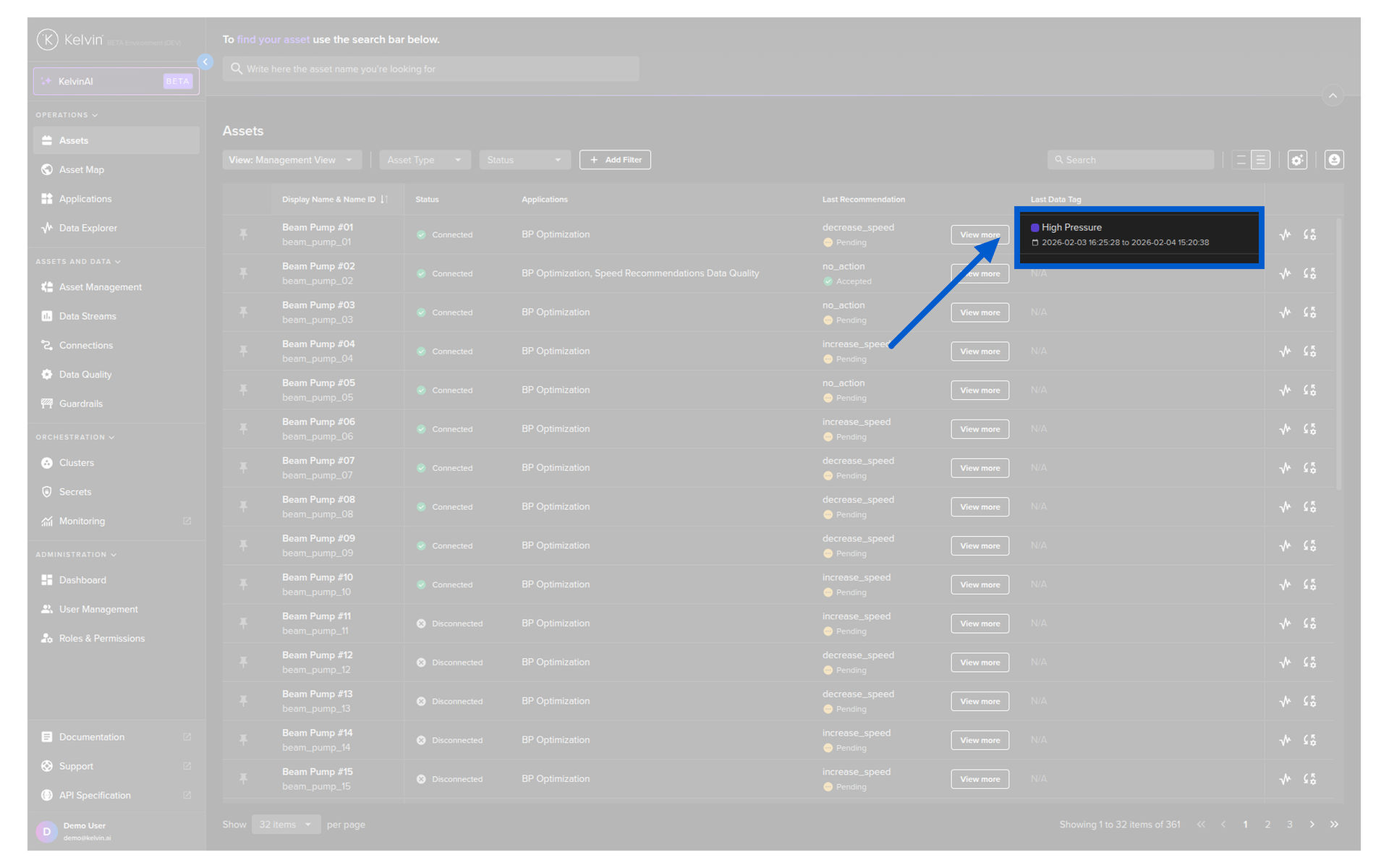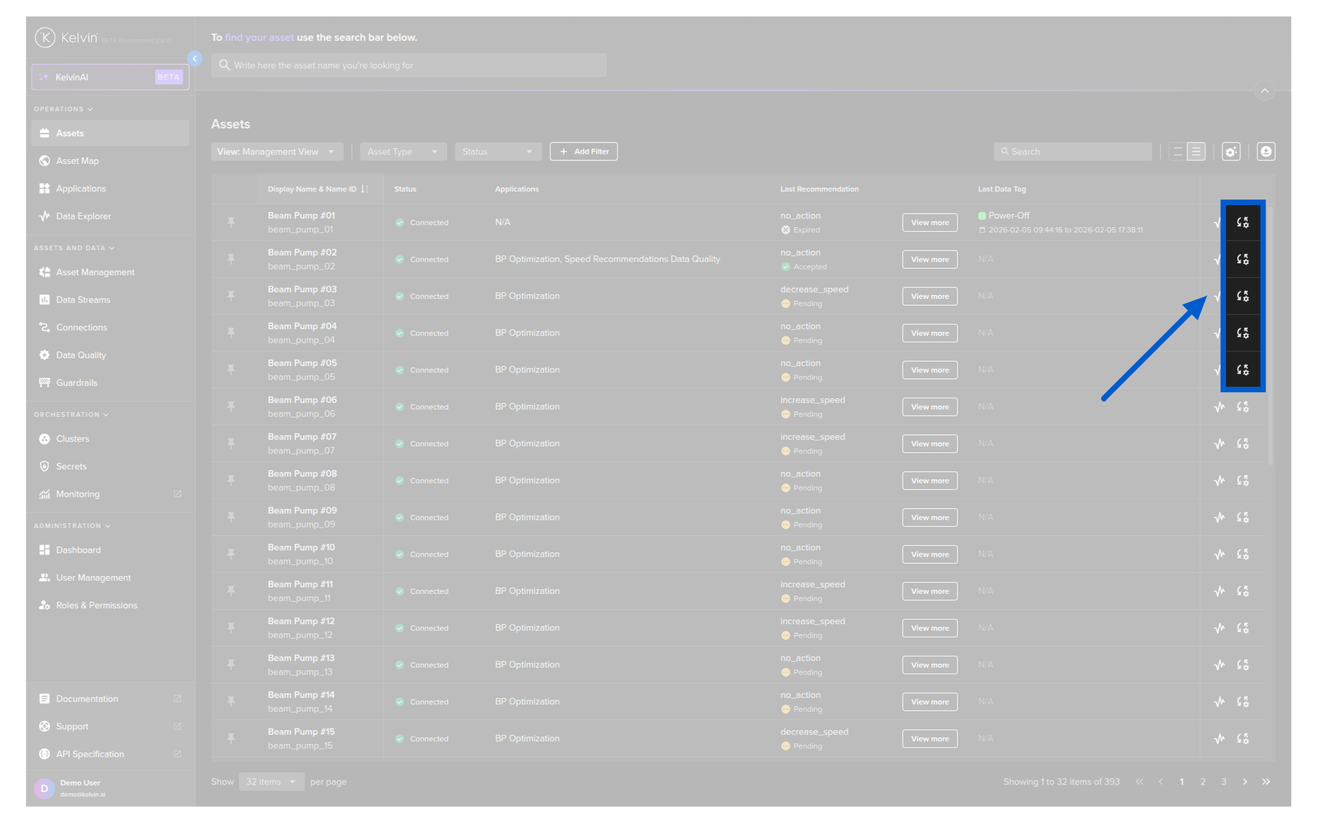 Here you have a list of all Assets registered in Kelvin. From here you can see the Assets and associated information.