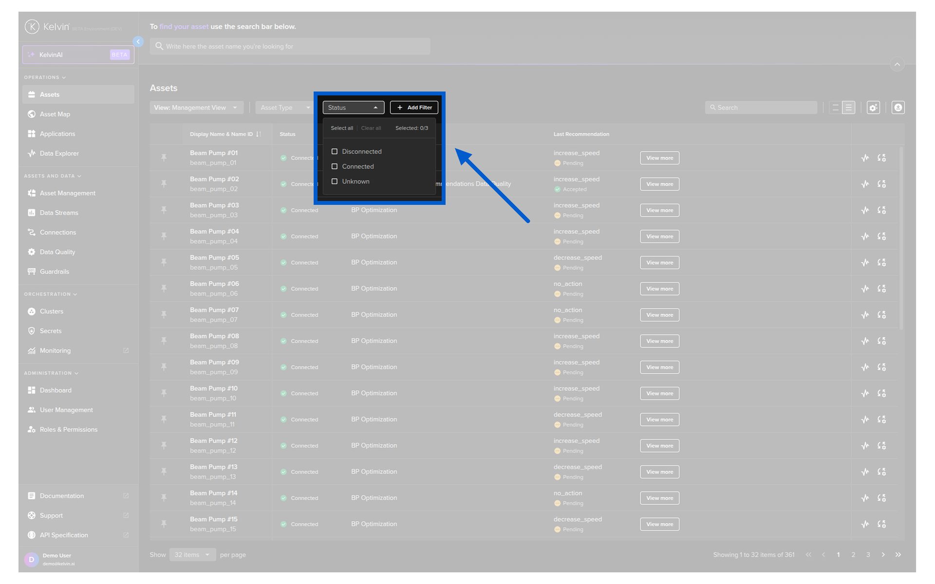 For example, if you filter only Connected Assets, running in Open Loop mode in Kelvin SmartApps™, then you will not see any Disconnected Assets even if they are running in Open Loop mode.