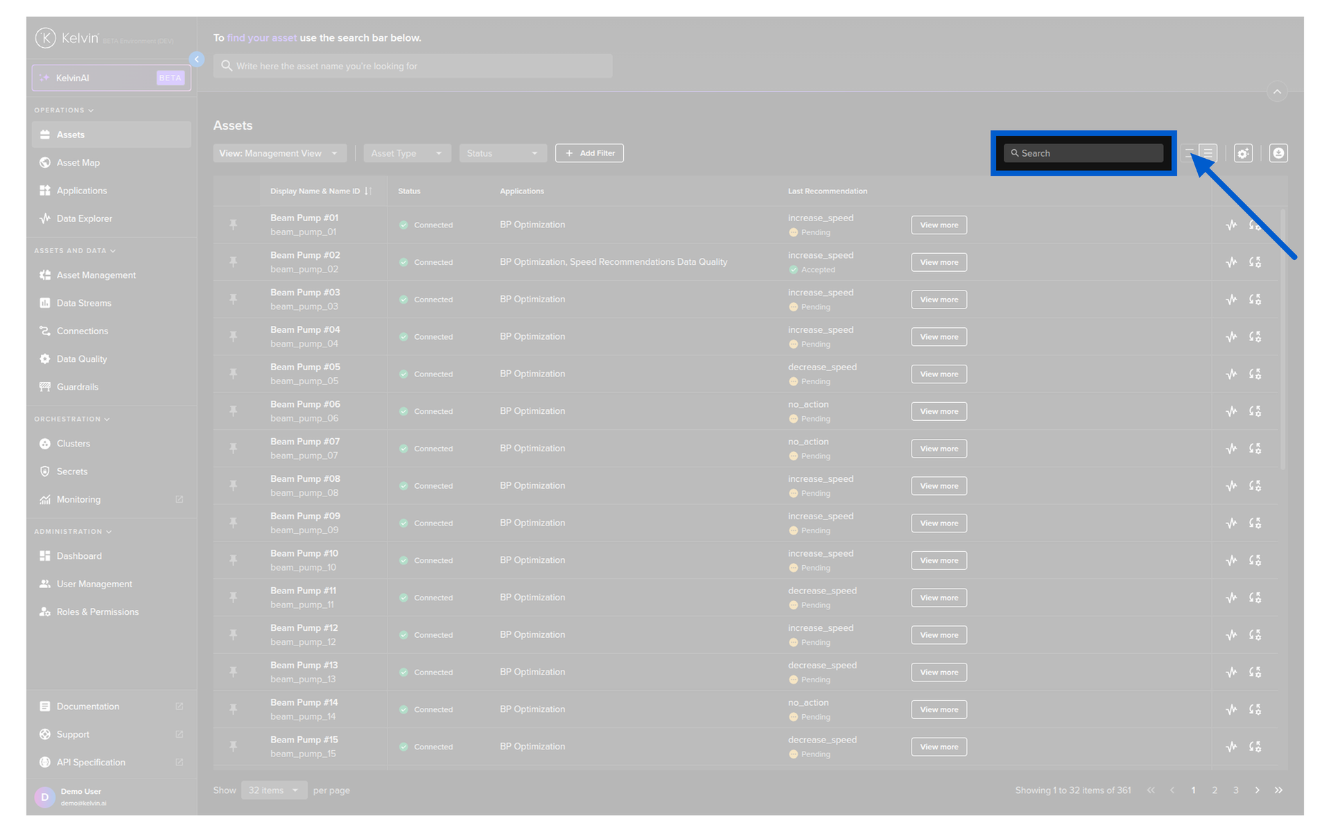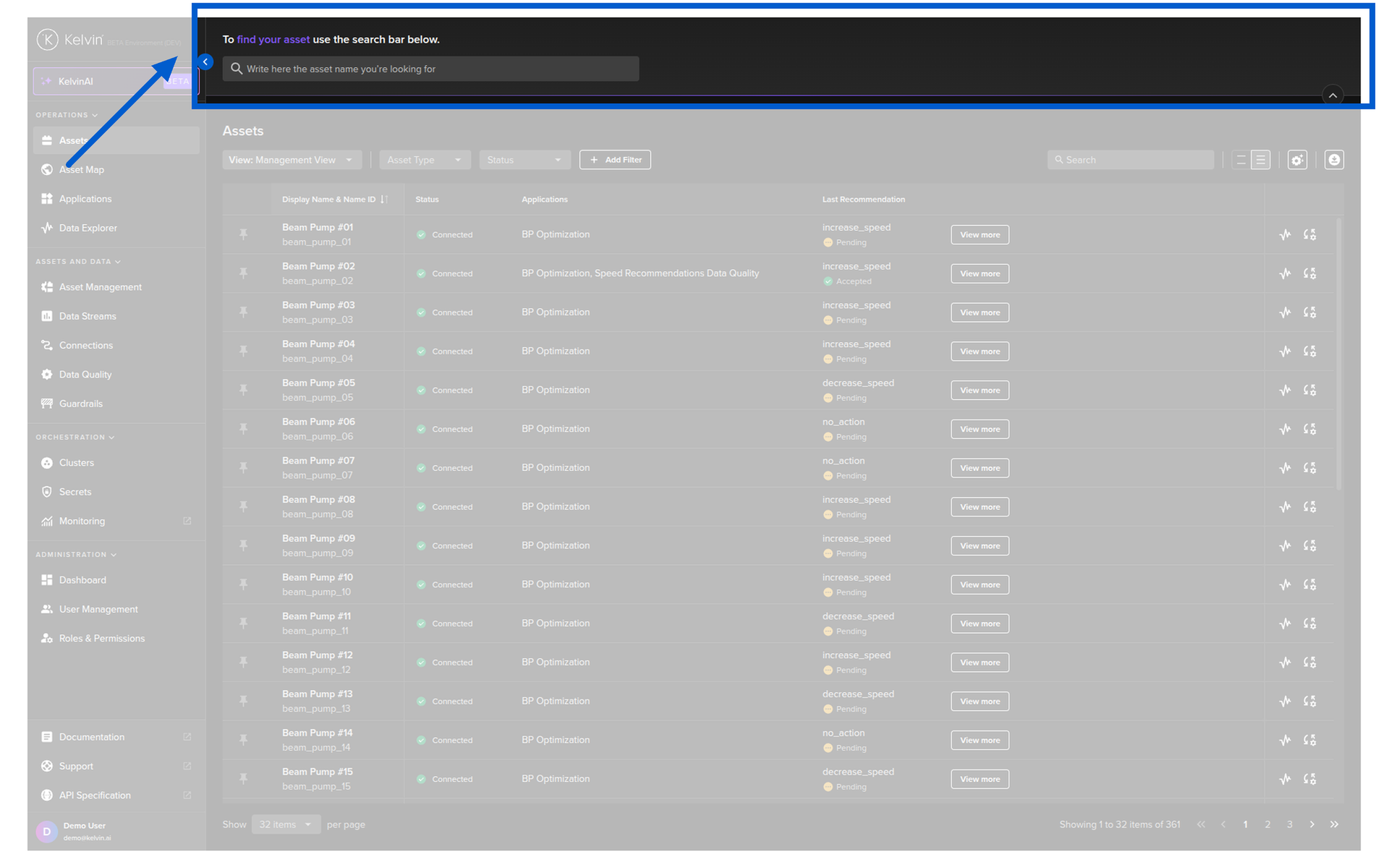 For example; if you have an Asset called Demo Asset and you type in this fuzzy search bar deo where you accidentally forgot the letter m, it will still show up in the list.