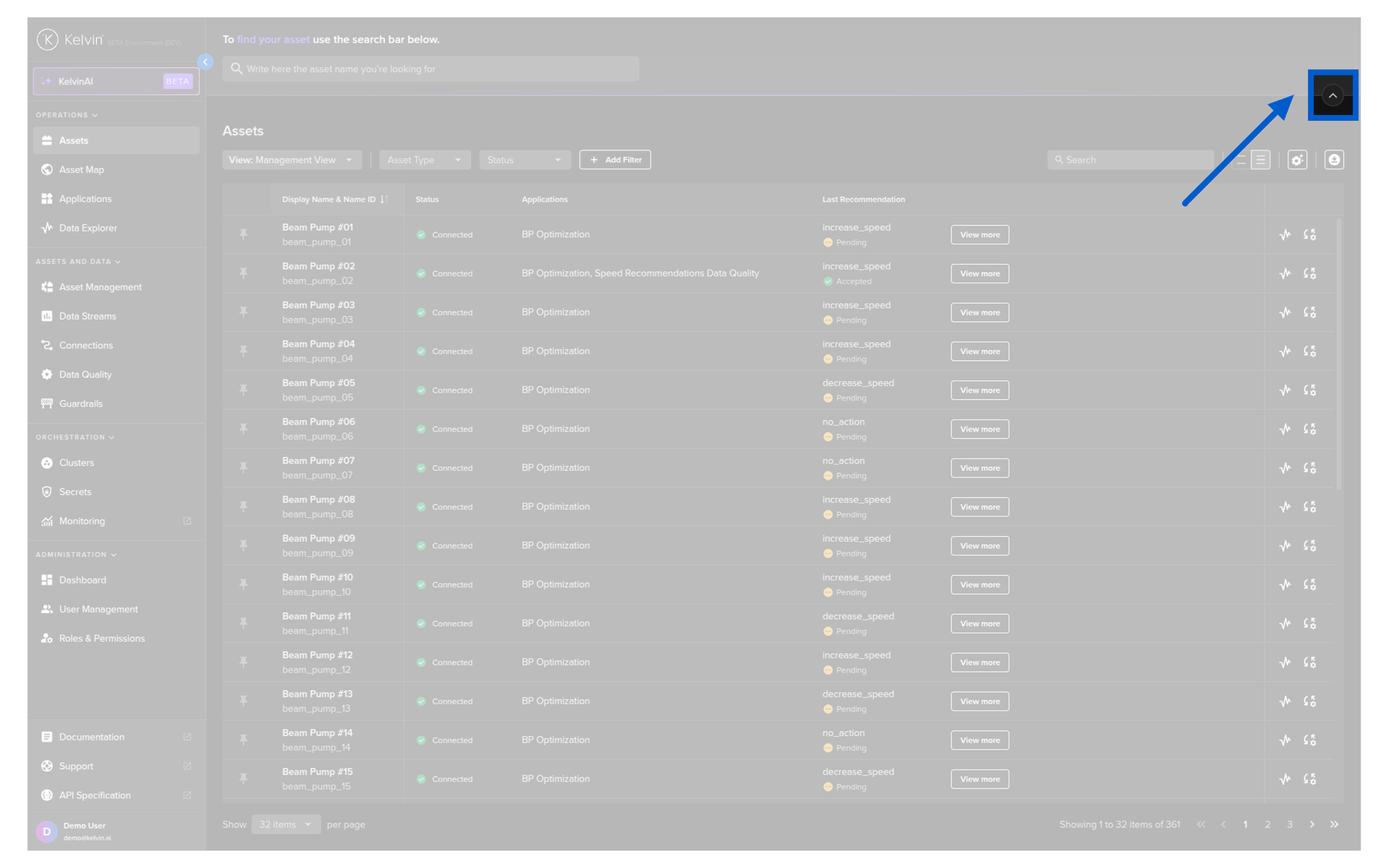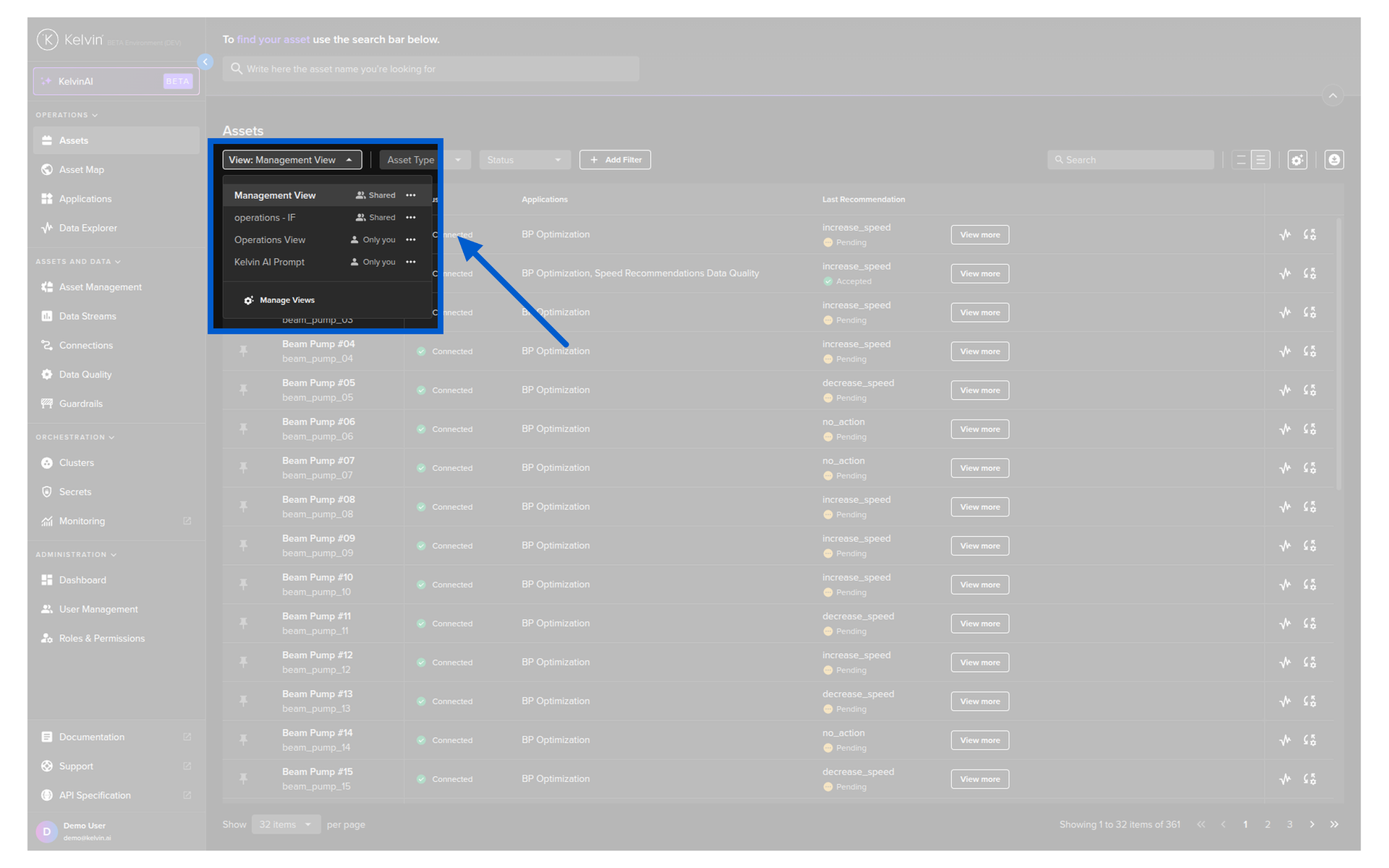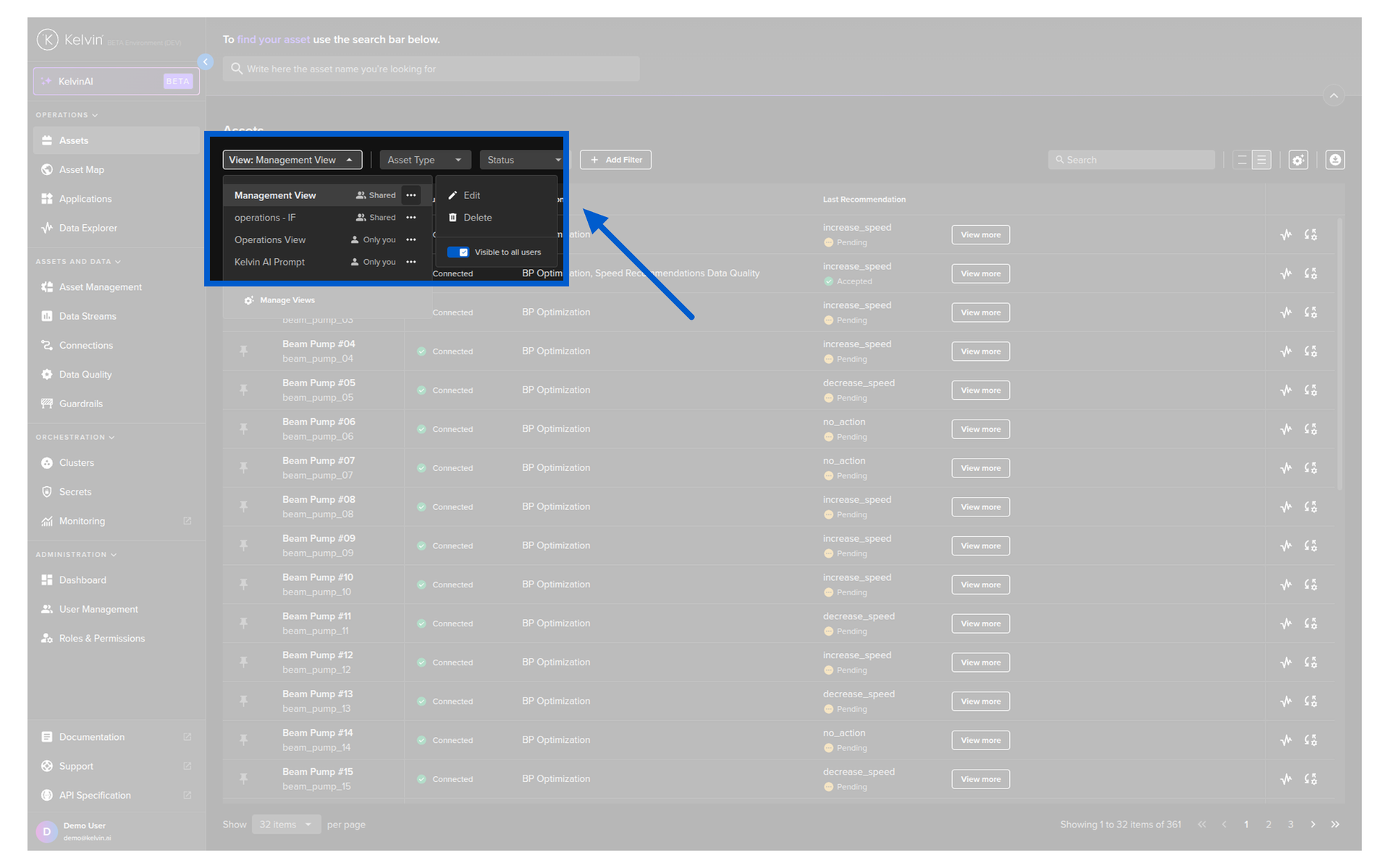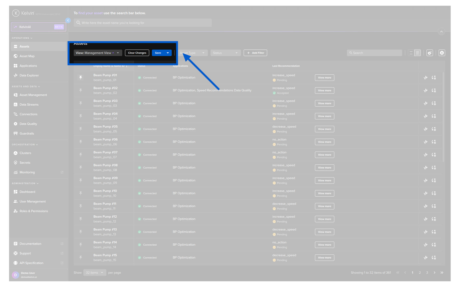 On this page you get an overview of all Assets being managed by Kelvin. You can build custom views for the overview by using information like Data Streams, Kelvin SmartApps™ configurations, Recommendations, actions like last Control Change and more.