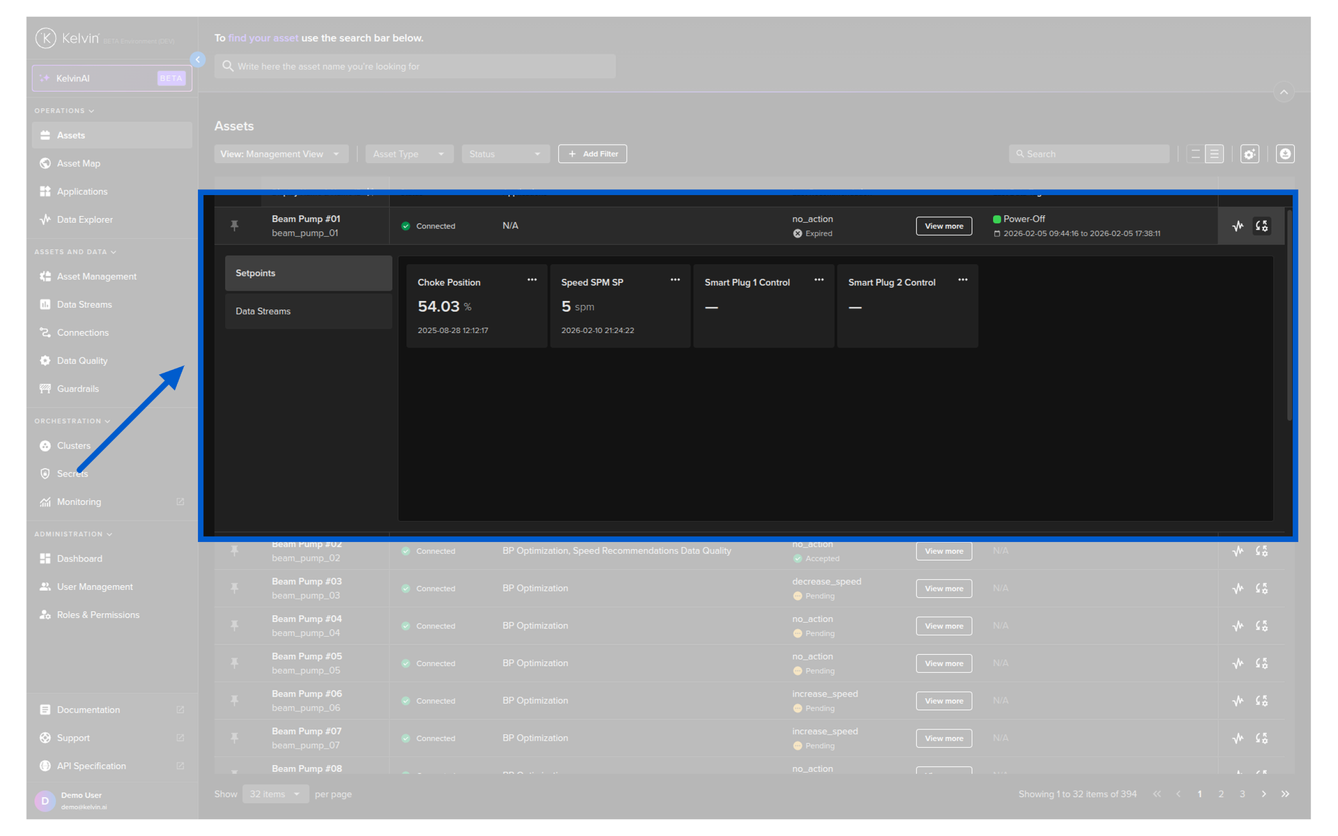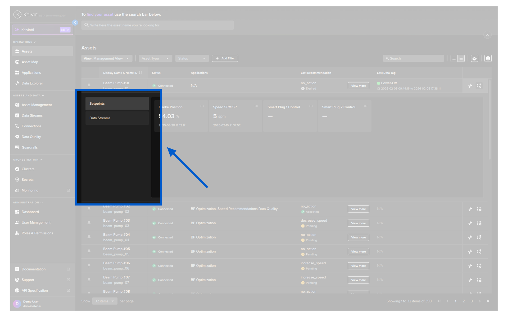 You can quickly see the Manual Controls and Data Streams in the table for an Asset without having to switch back and forth to the Asset details page.