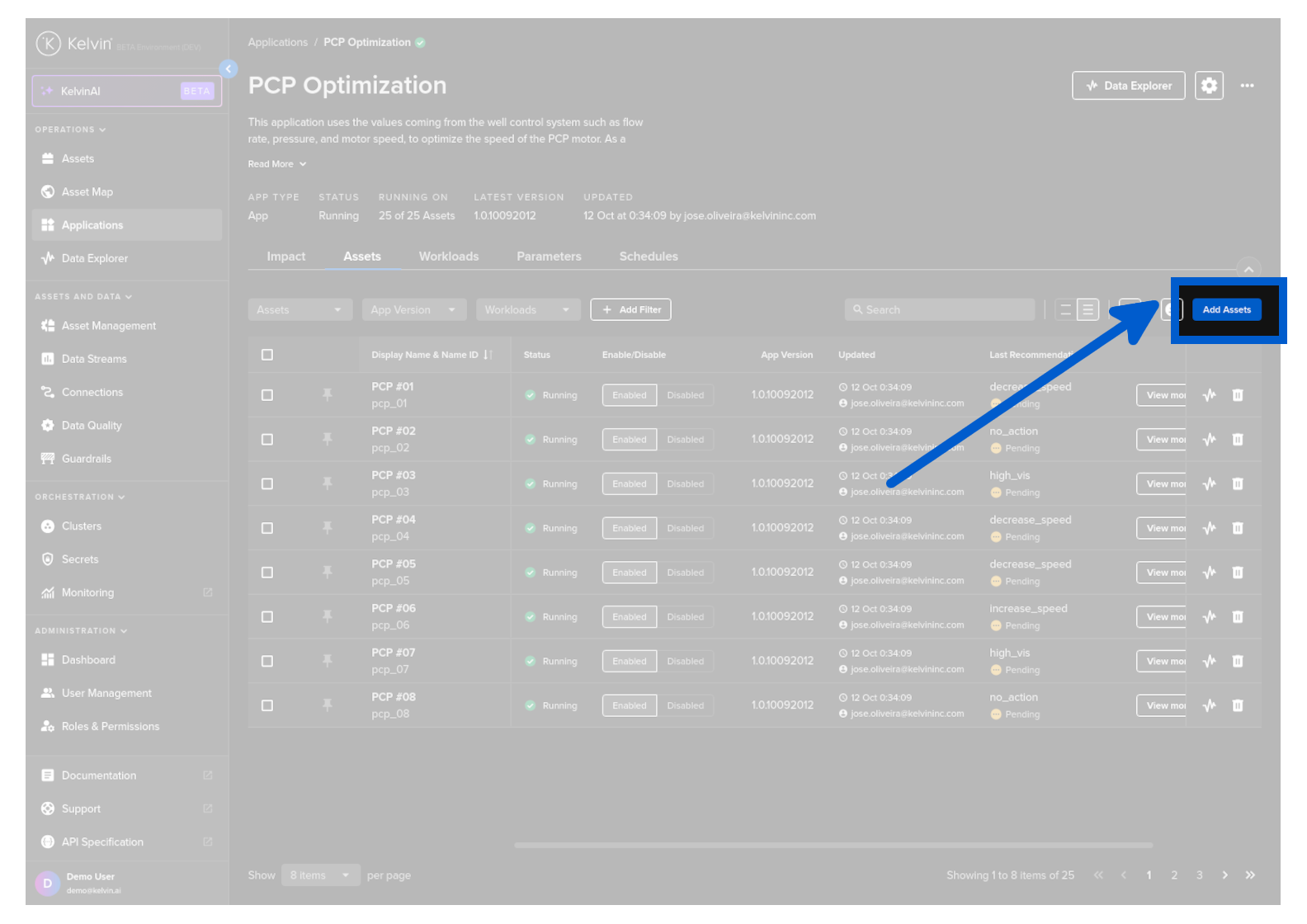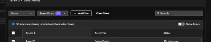If any Assets have missing requirements such as no associated Data Streams that are required for the Application, then an alert will appear between the filters and the Asset list.