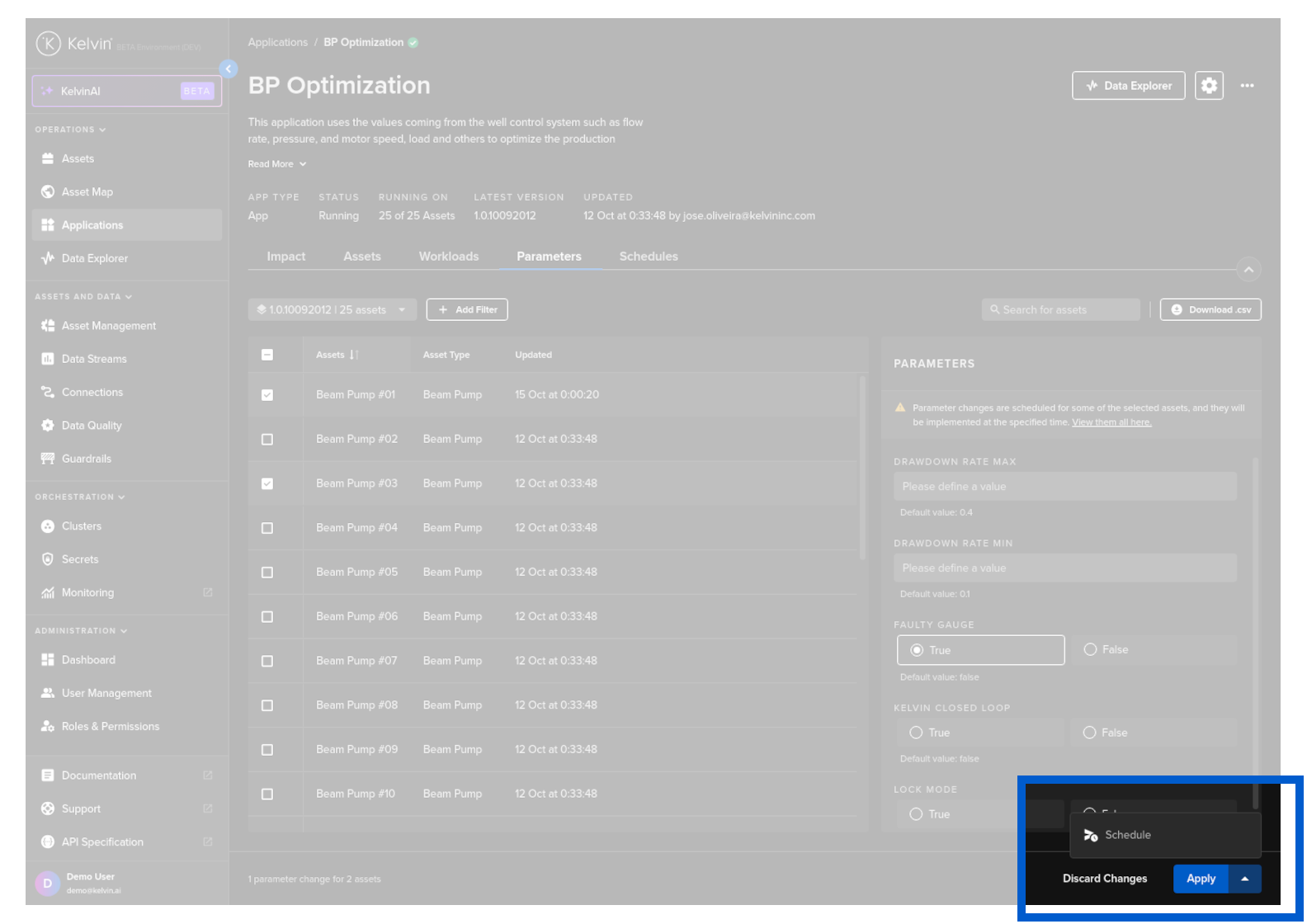If you only select one Asset, then the current App Parameter values will be shown in the Parameters section.