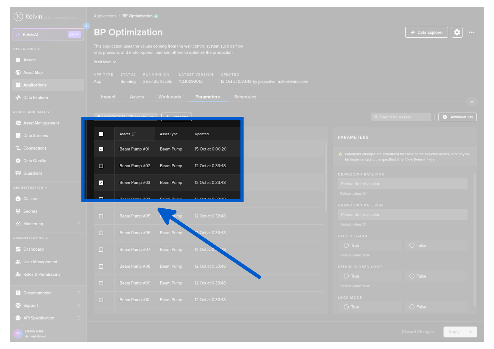 To update any of the App Parameter values, select one or more Assets.