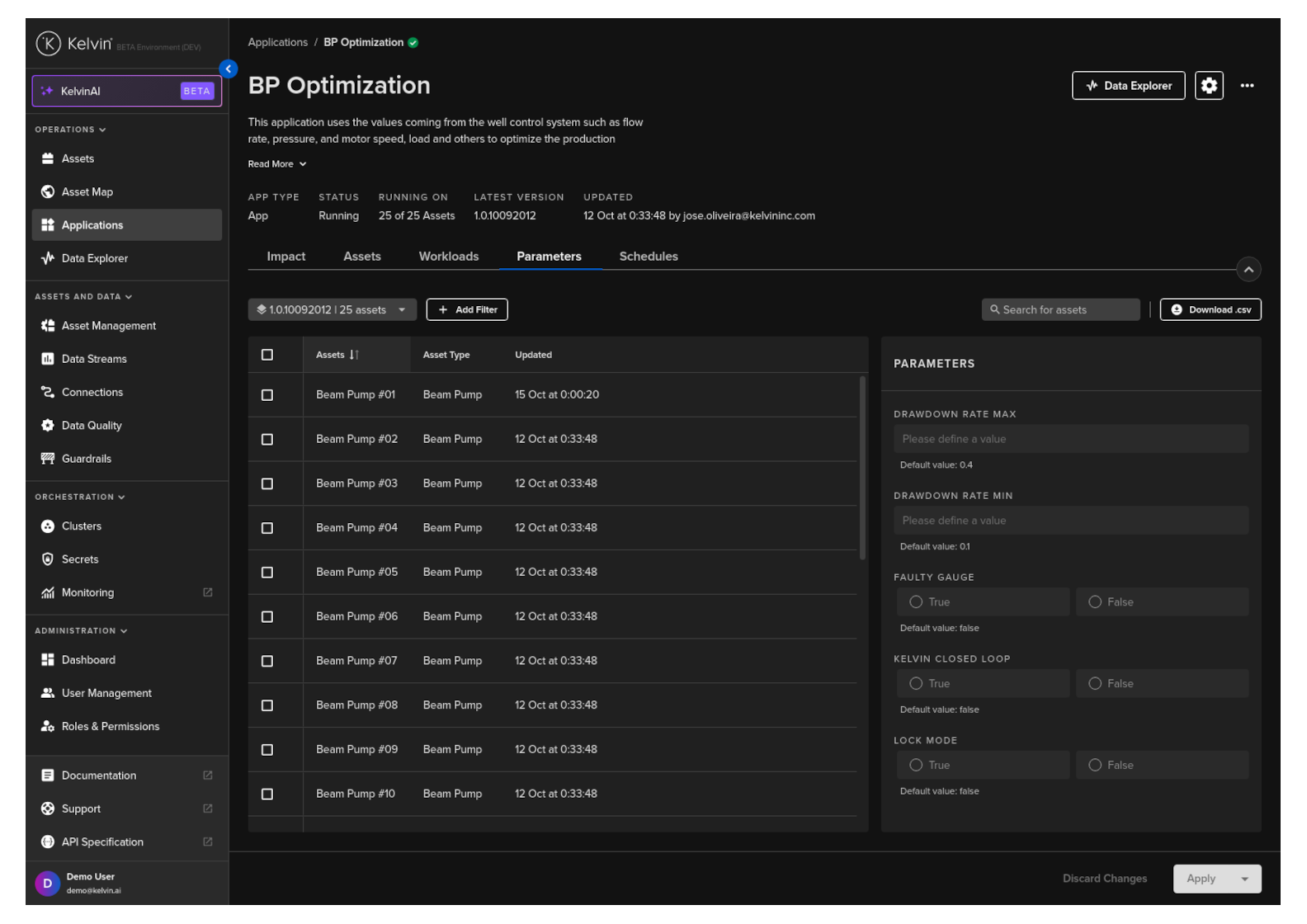 Click on the App Parameters tab, and you can see a list of Assets and the App Parameter options for Kelvin SmartApps™.