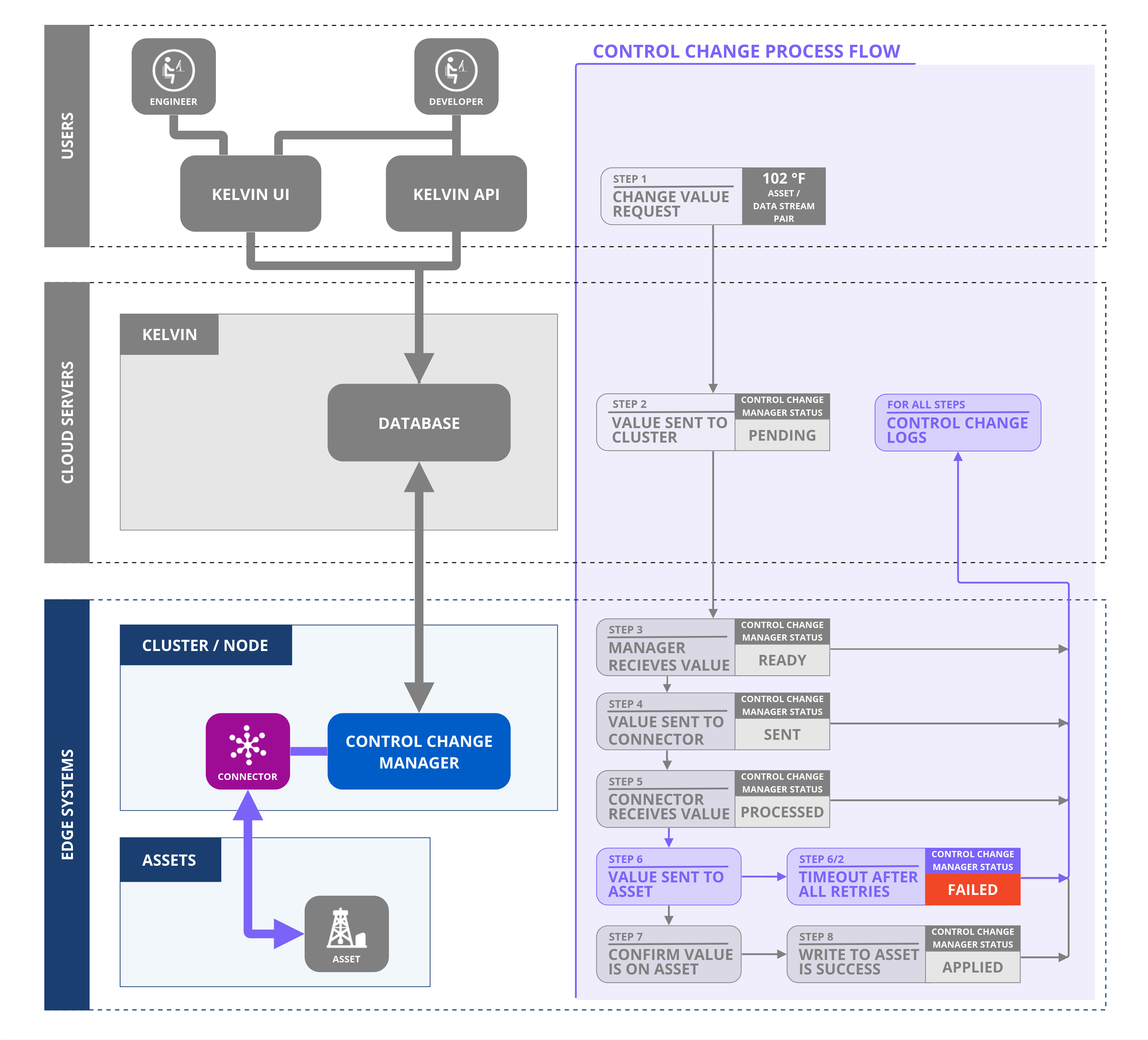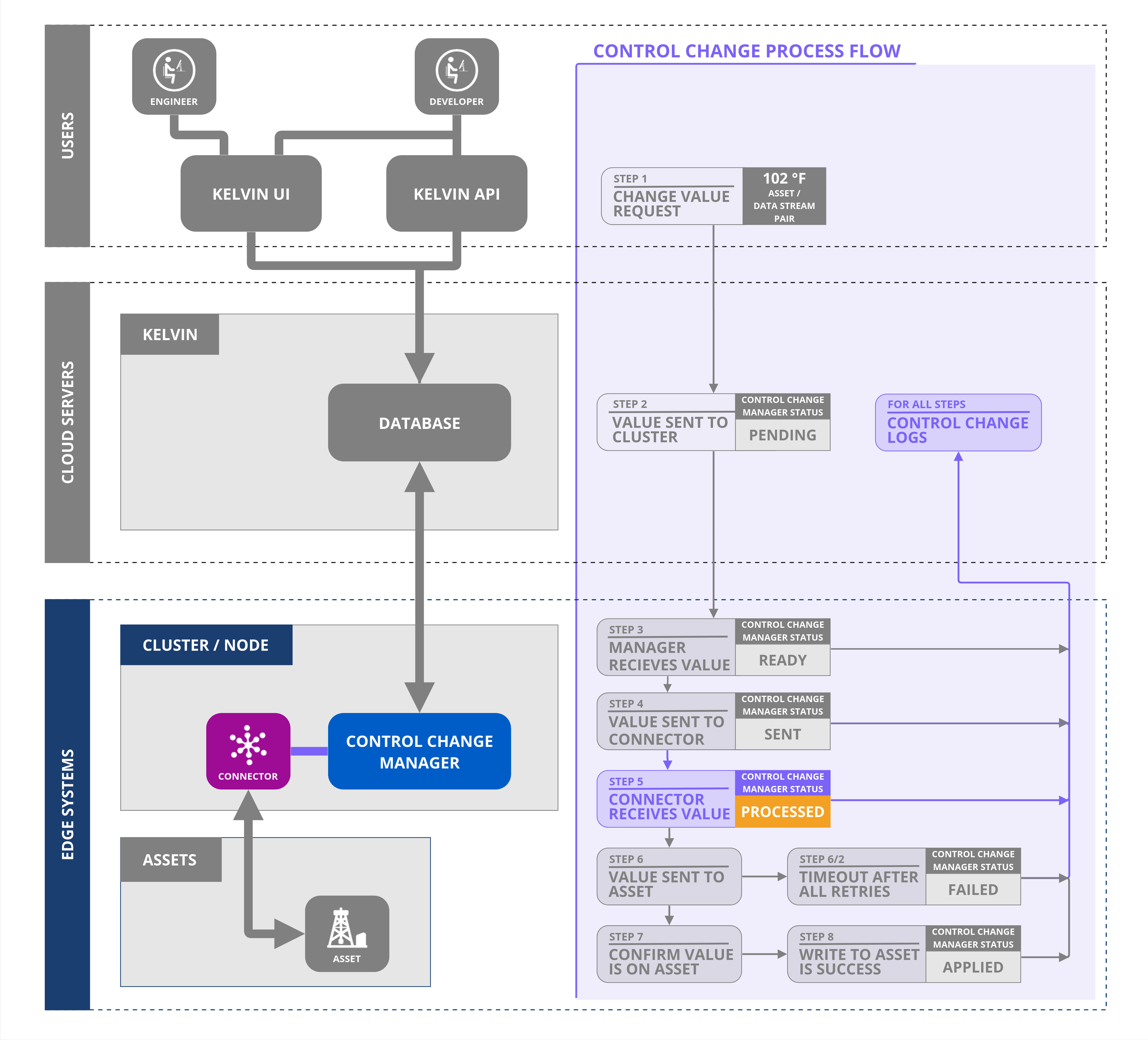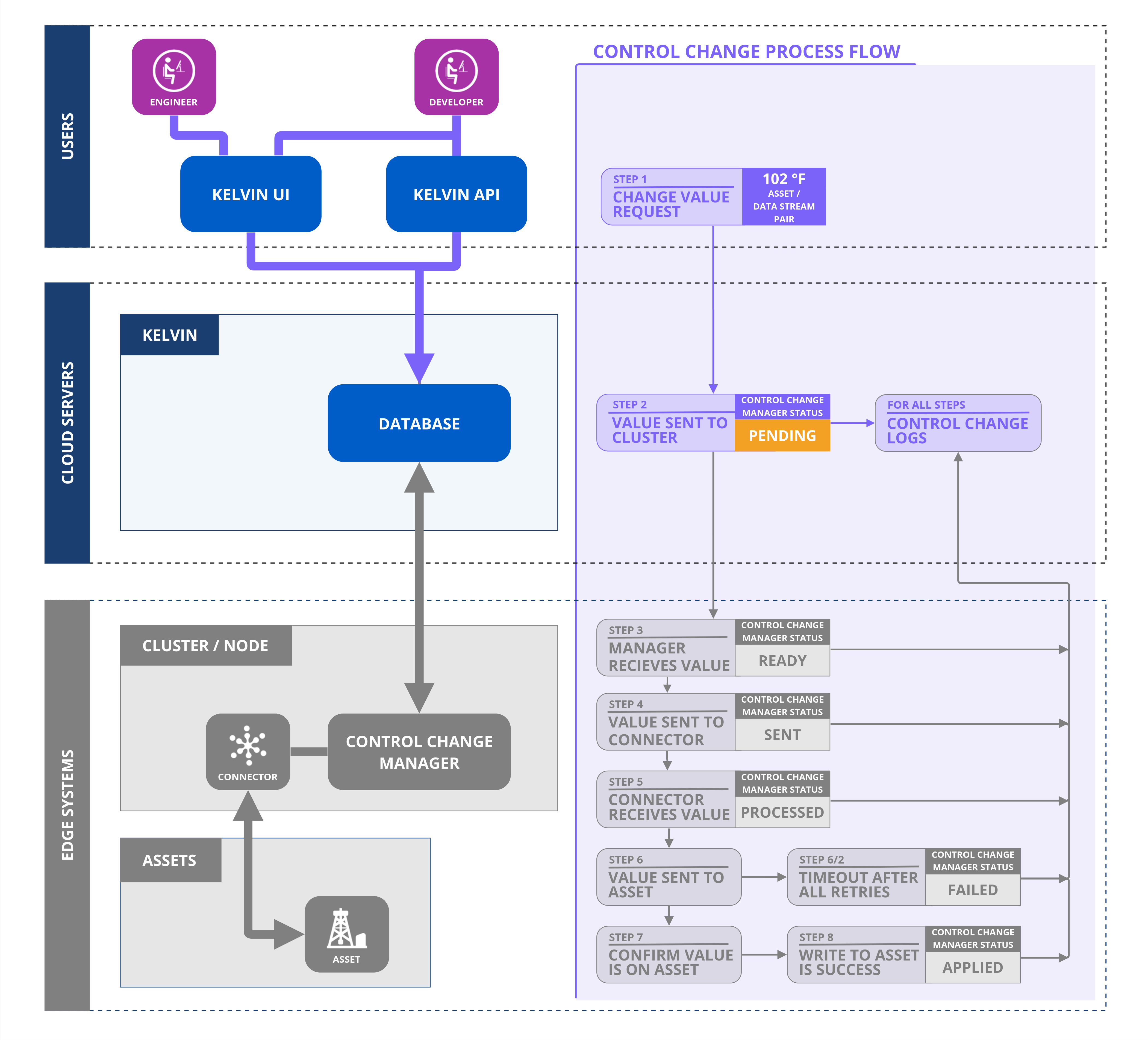 Let's follow the journey of a Control Change initiated by a user on a computer through an API call or using the Kelvin UI.