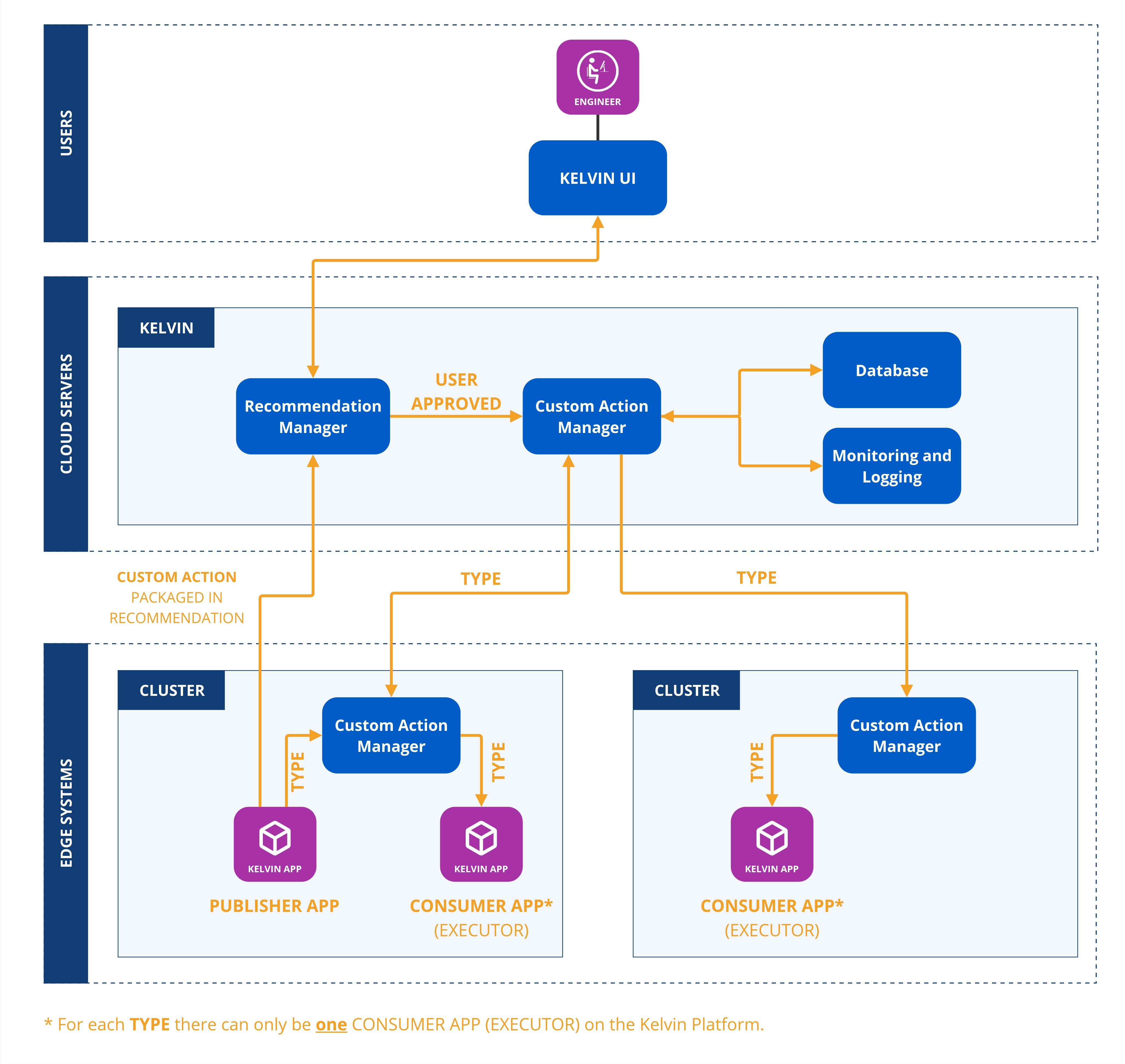 - Consumer Application (Executor): A specific Kelvin SmartApp™ that will receive the custom action and performs predefined actions on the payload data