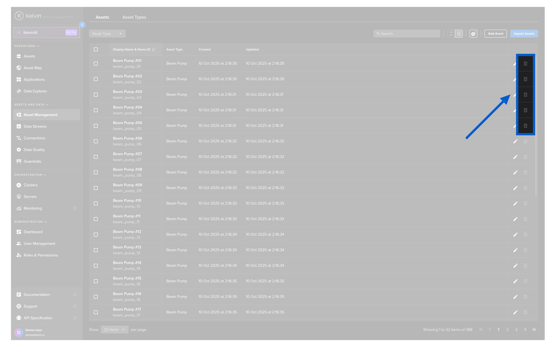 To make life easier, you can copy the Asset Name from the Kelvin UI in Operations → Assets. Hover over the Asset Name below the Asset Title in the table, then click on the copy icon that will appear to the right of the name.