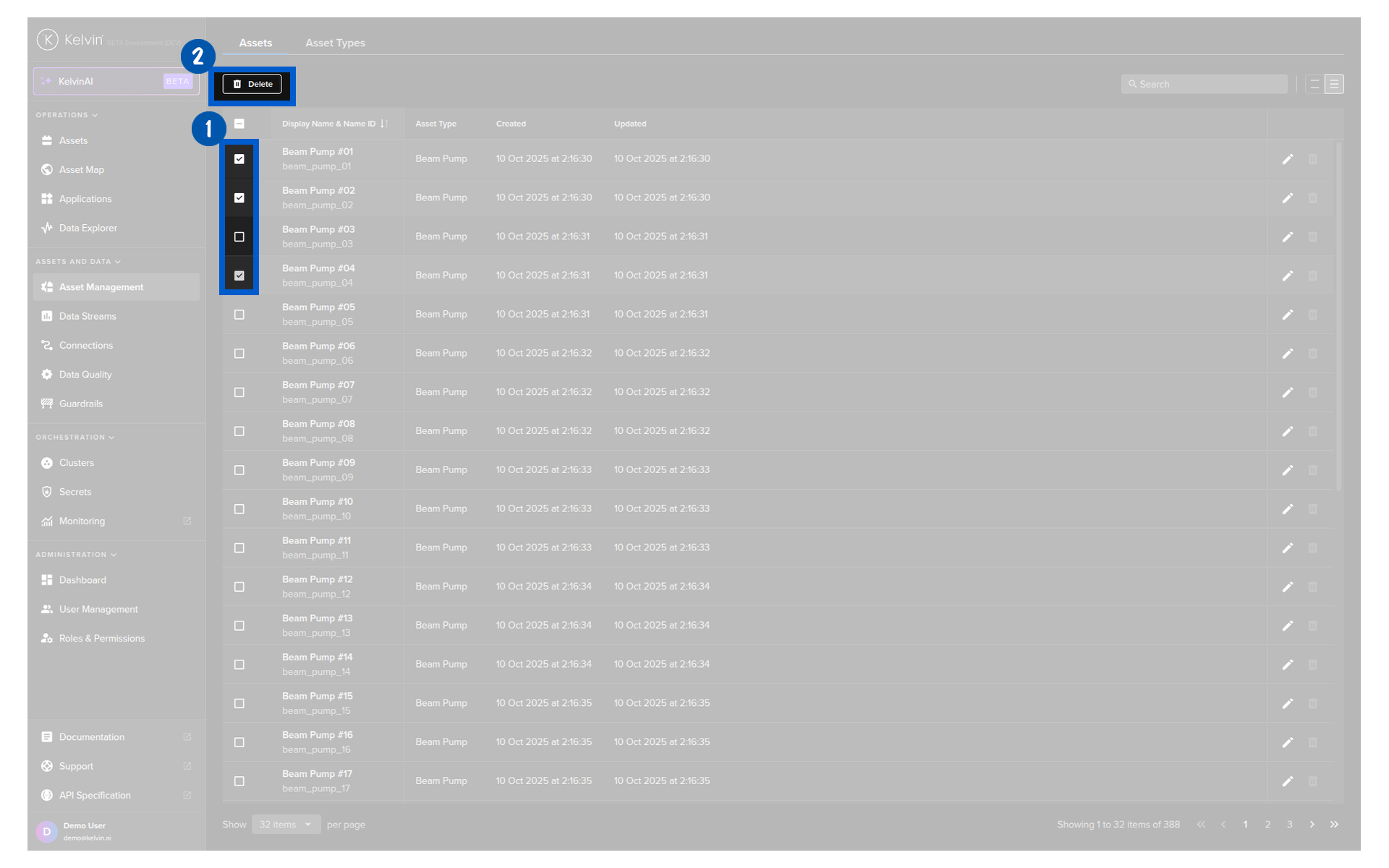 To delete an Asset, check multiple Assets and a Delete button will appear above the table. When ready click on the button to delete the selected Assets.