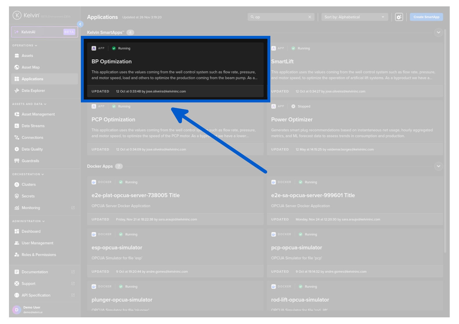 To see a full list of Assets running a certain , go to SmartApps™ dashboard page and select the Kelvin SmartApp™.