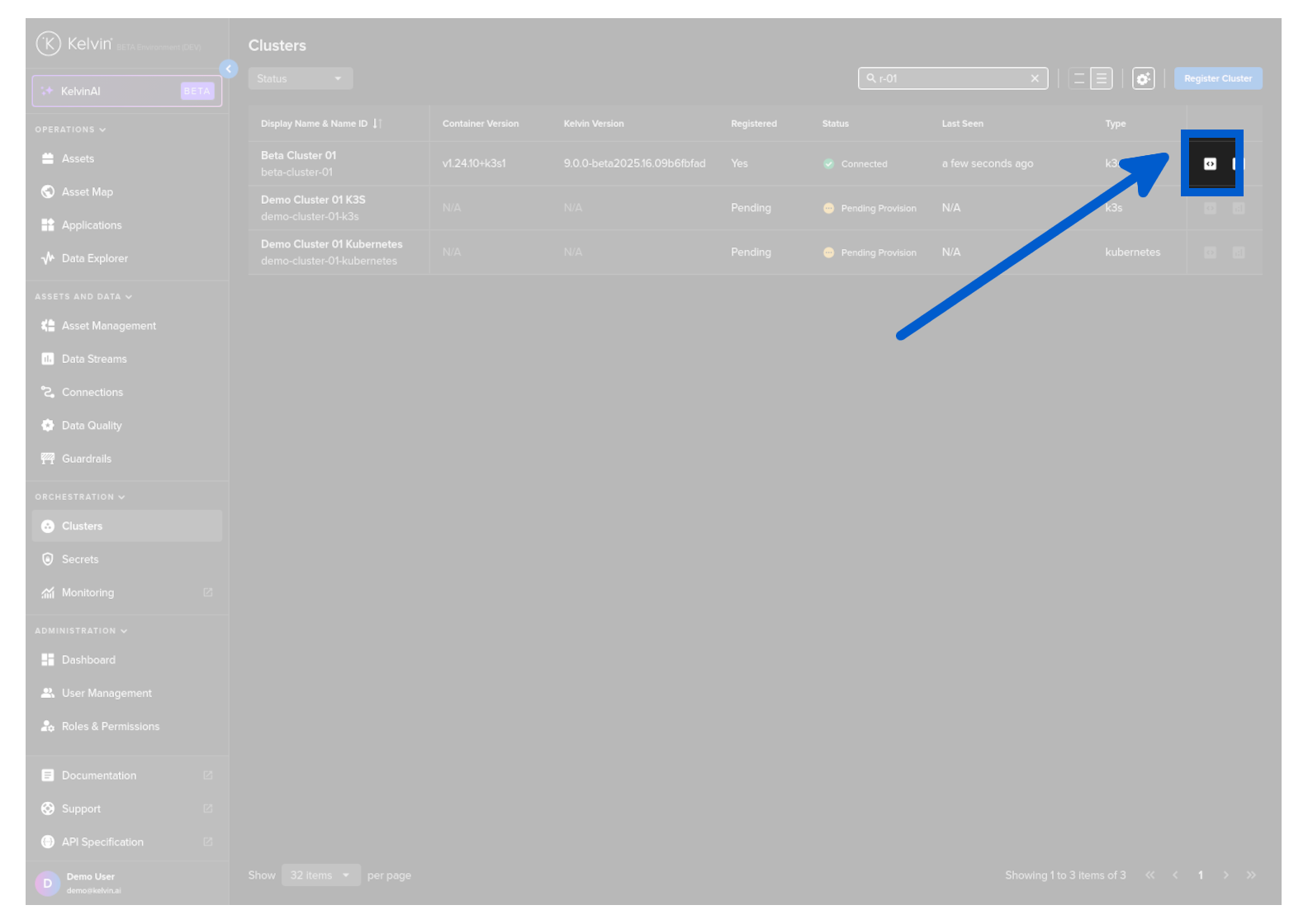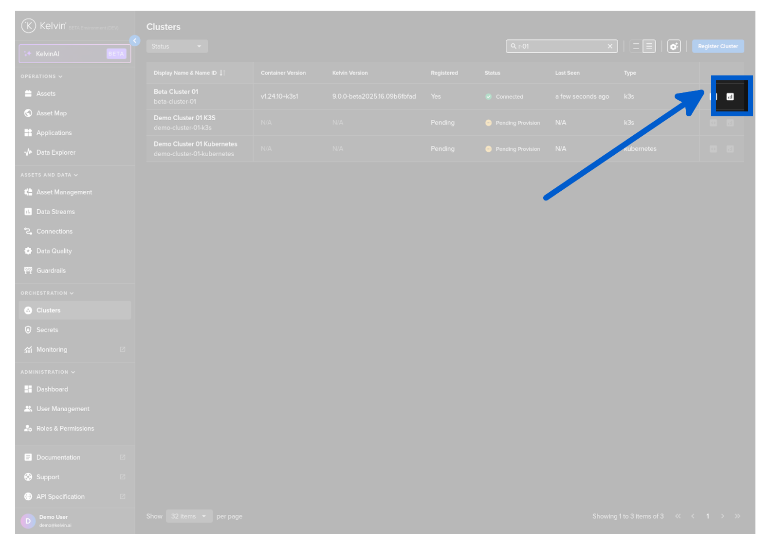 From Clusters menu find the Cluster row and click on the telemetry icon to the right hand side of the row.