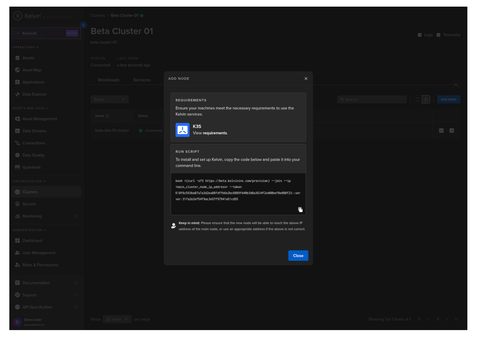 You only need to do this if you have chosen the Main Node in the Cluster to be k3s installation by Kelvin. If you manage your own Kubernetes cluster, then follow your providers instructions and Kelvin will automatically find and configure the new Nodes.