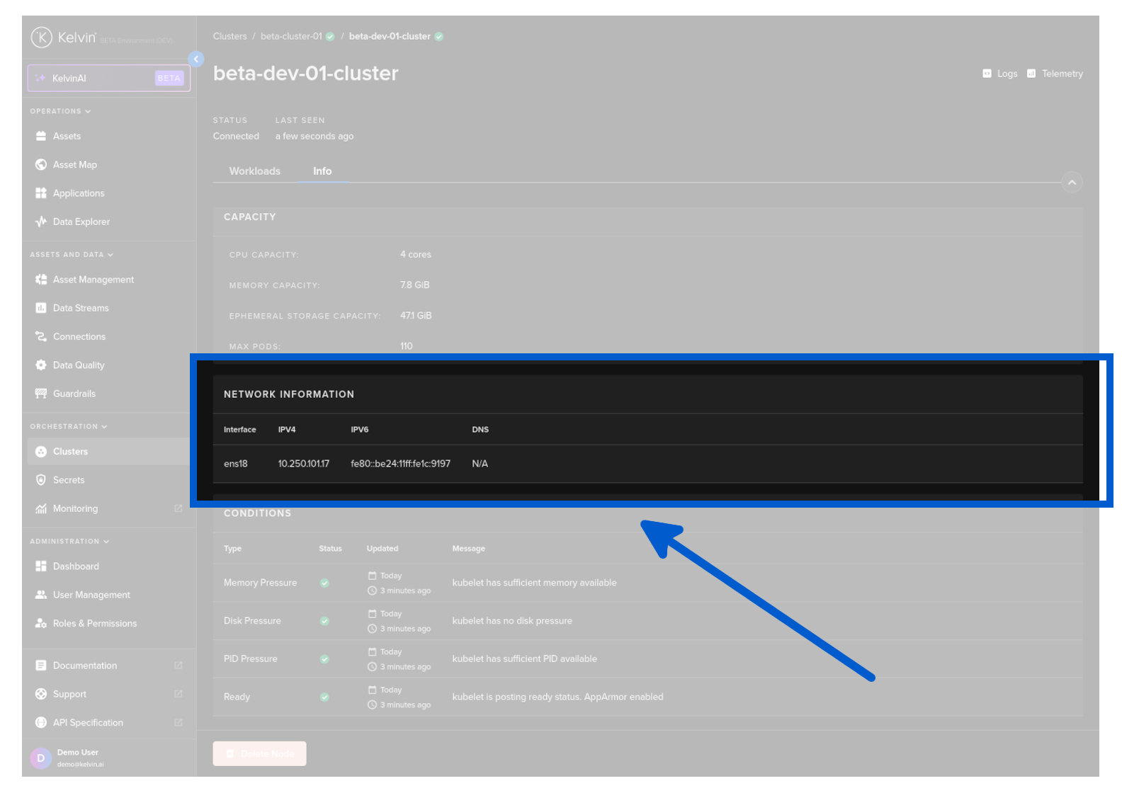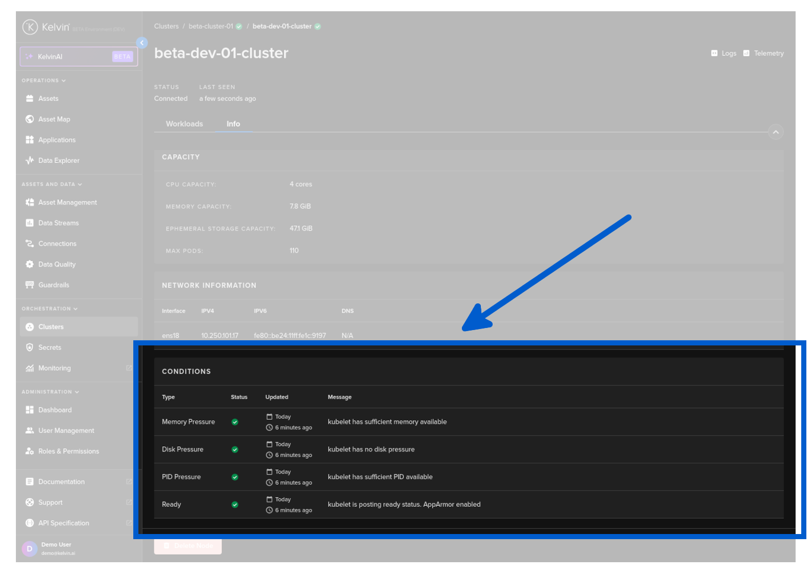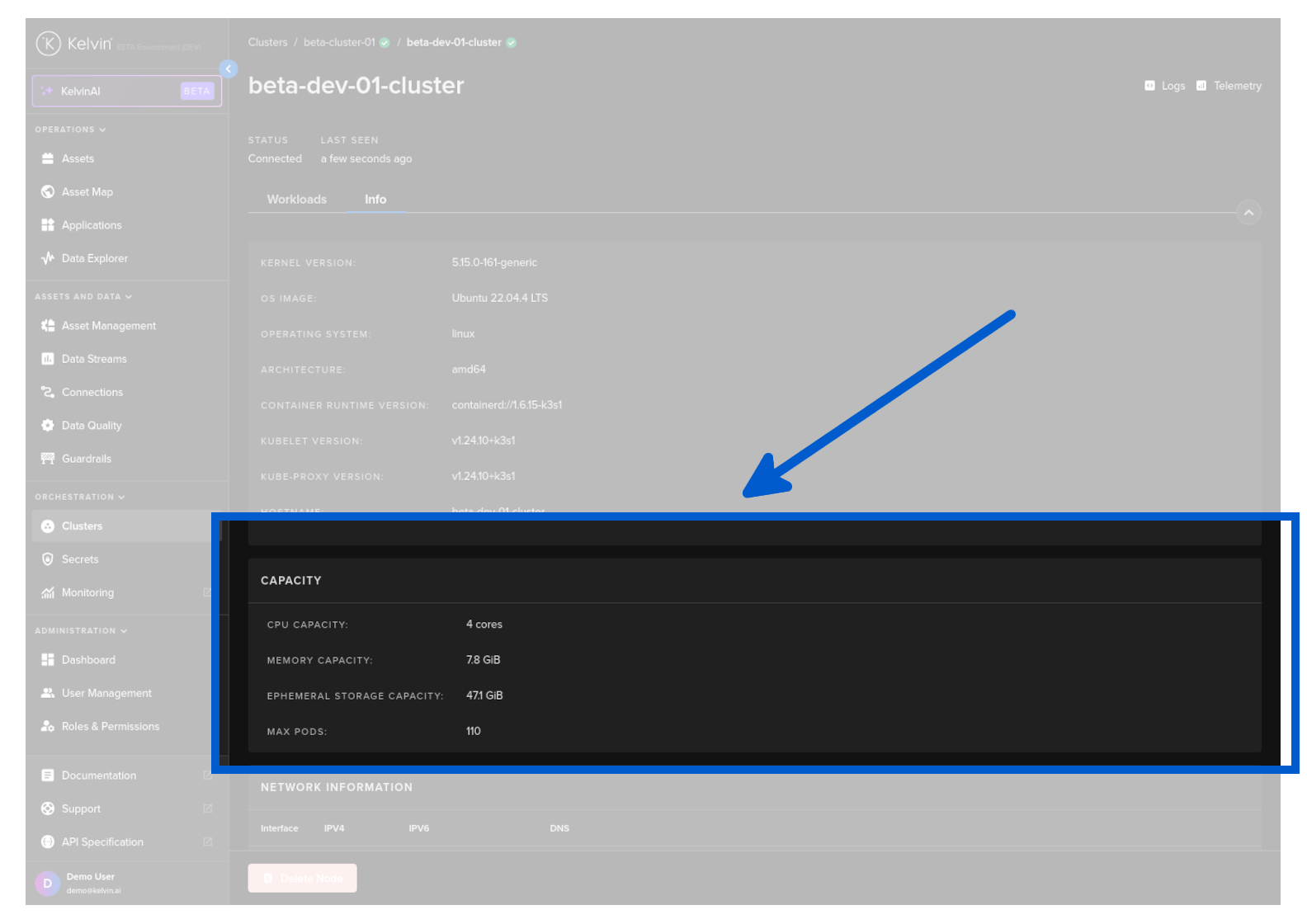 The top card has the general information about the Node, its operating system and Kubernetes versions.