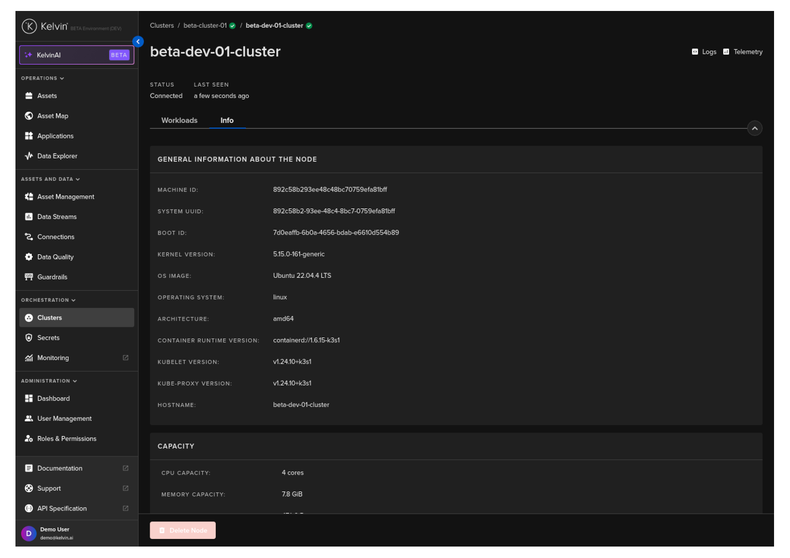 The Nodes dashboard gives you information about the local Node and the Workloads that are running on it.