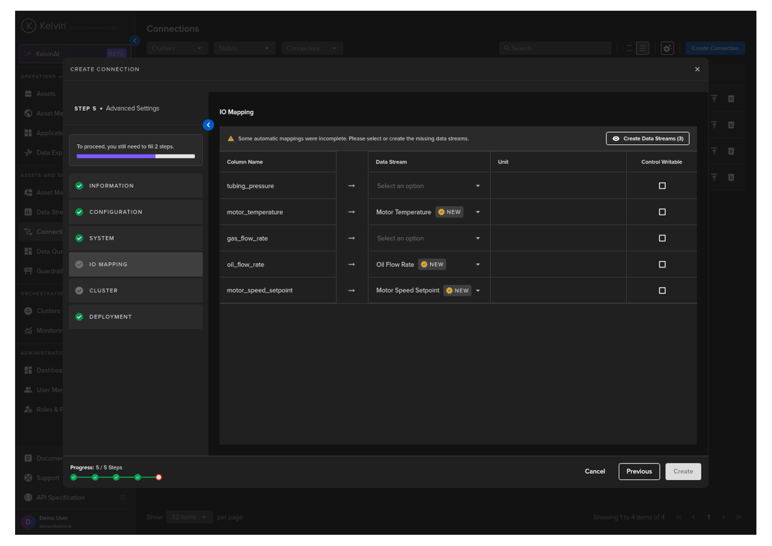 For each Data Stream column name in the uploaded file, select the Data Stream on the Kelvin Platform where the data in the rows will be sent.