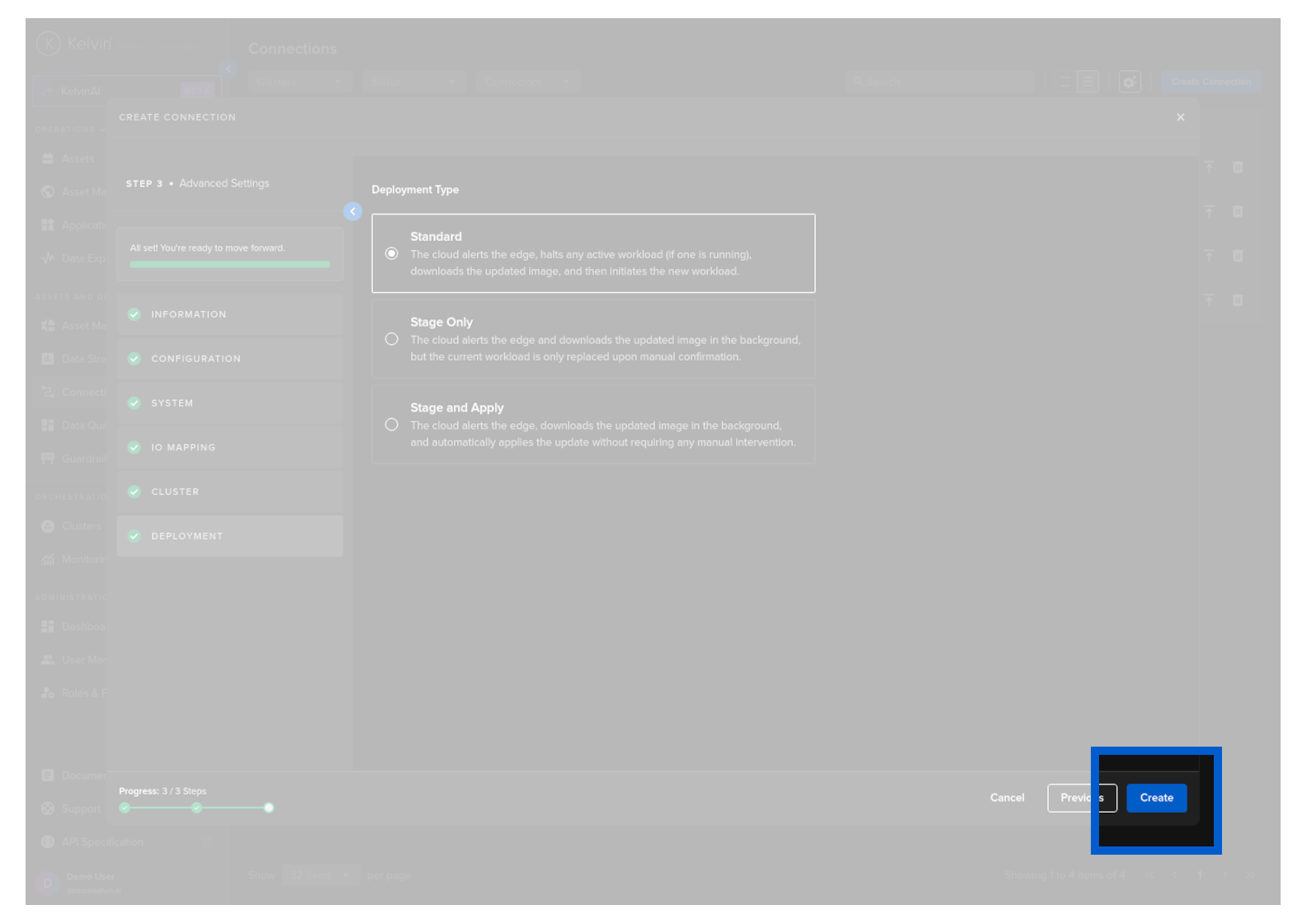 You can even create and deploy the Connection if the Cluster is offline. It will be placed in a queue with a status of Pending and will be automatically deployed when the Cluster comes back online.