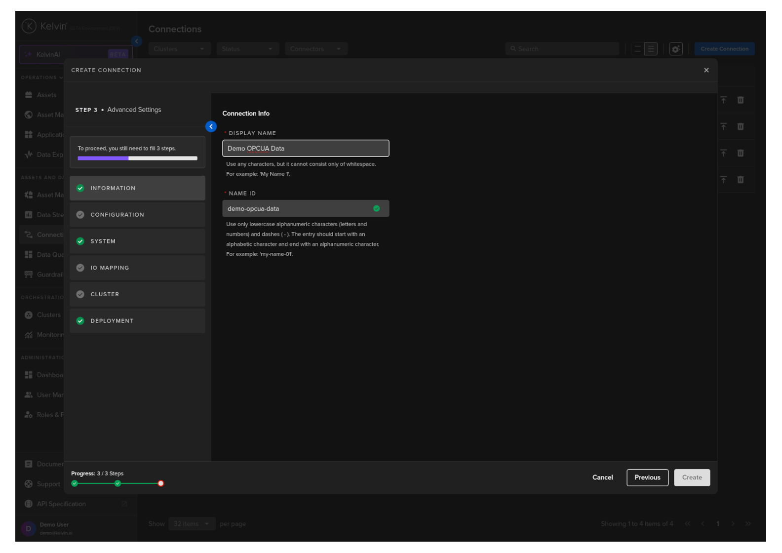 You can then see the status of the Connection in the Connections list going from Pending, Deploying to Running. It will start automatically, connect to the asset and start collecting data.