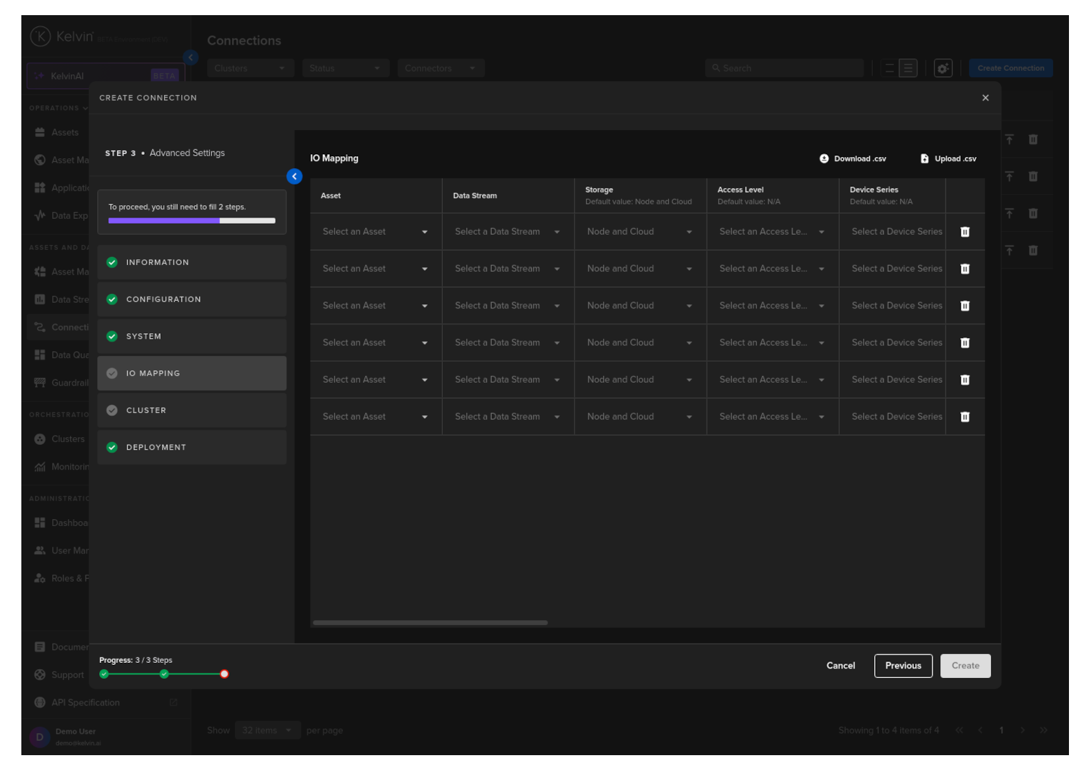 If you have many connection IO to fill in, you can save time with the download/upload csv file option in the top right hand corner of the popup.