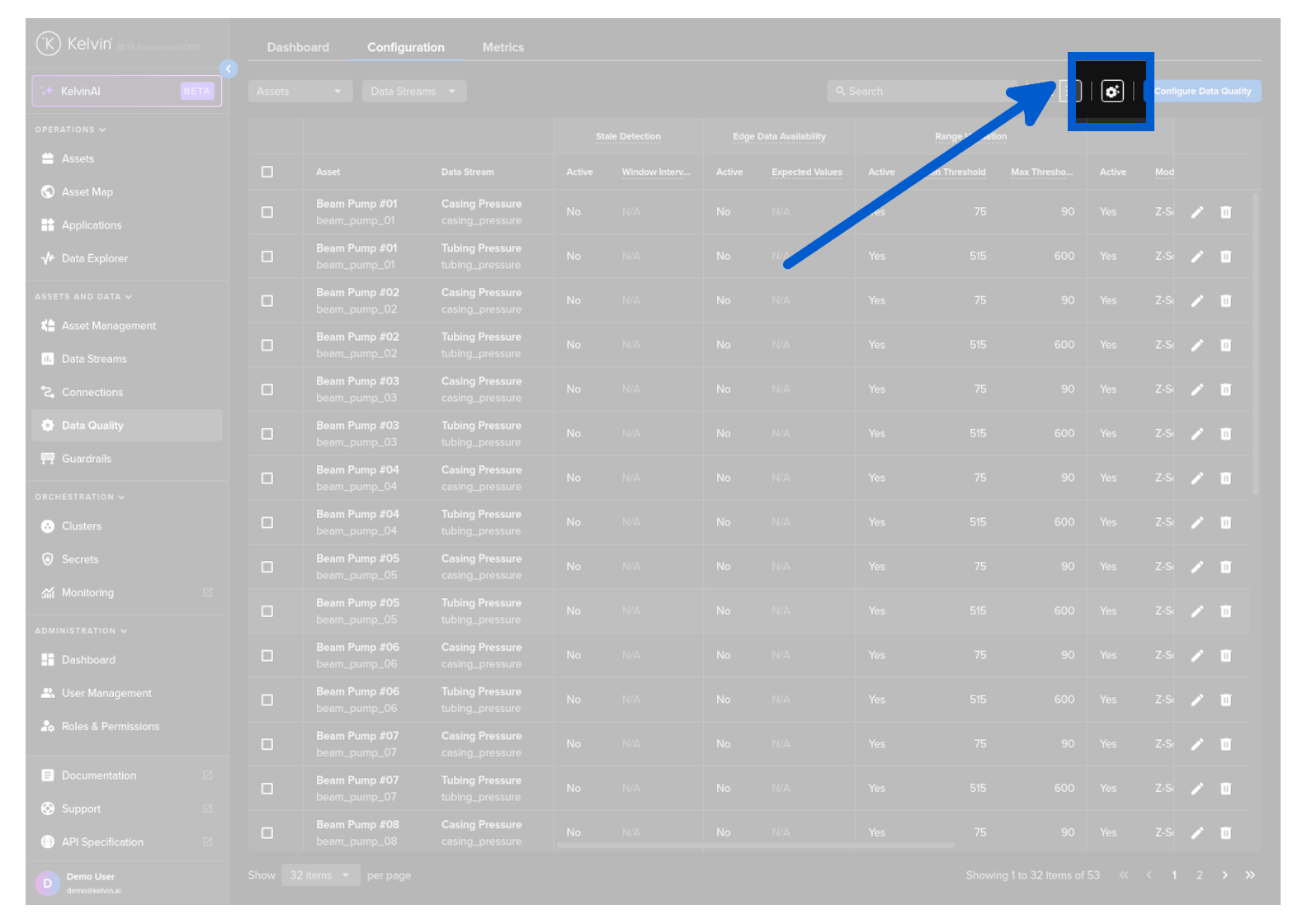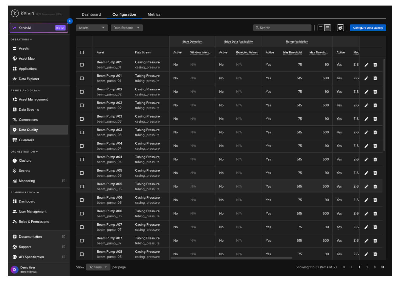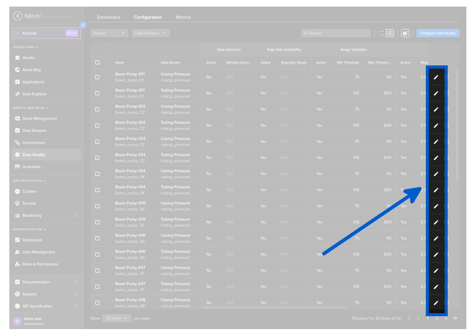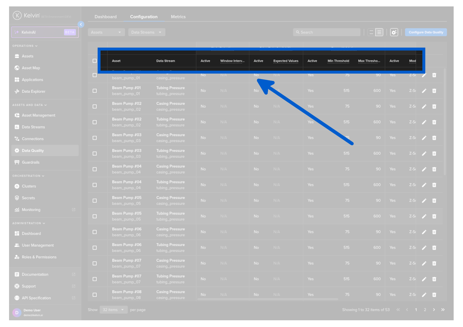 You will then see the Configure Data Quality screen where you can edit the metric settings for each Asset / Data Stream pair.