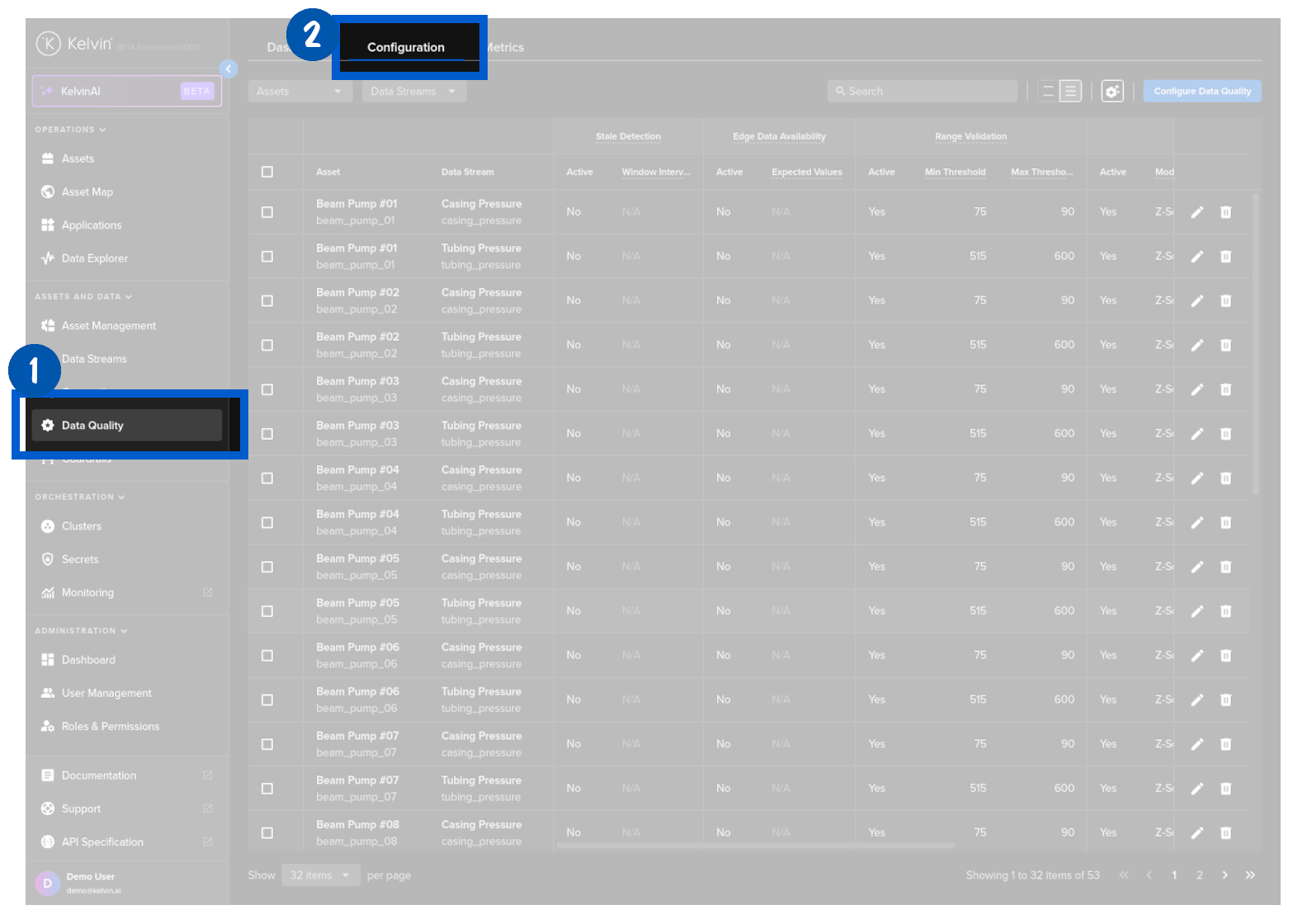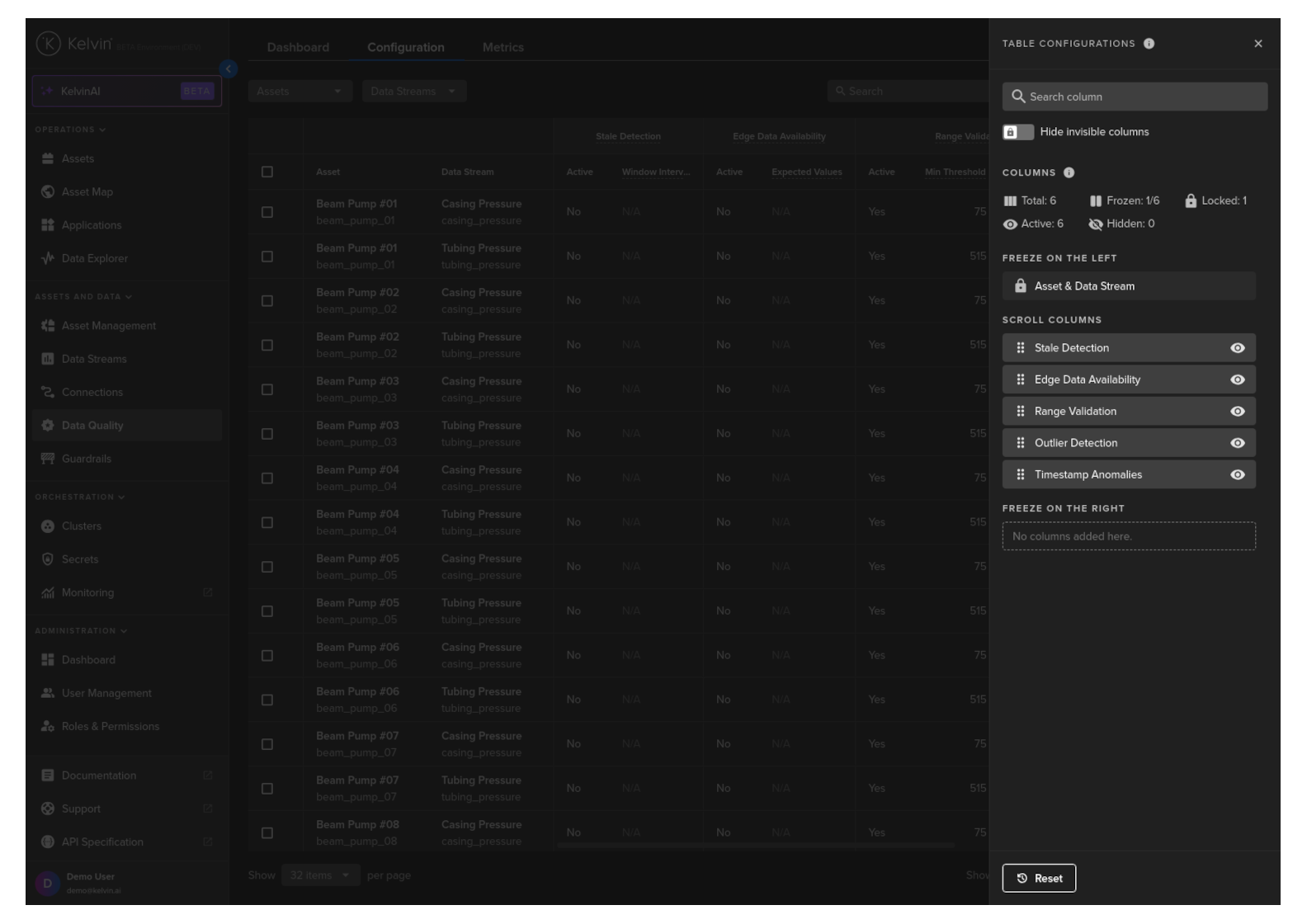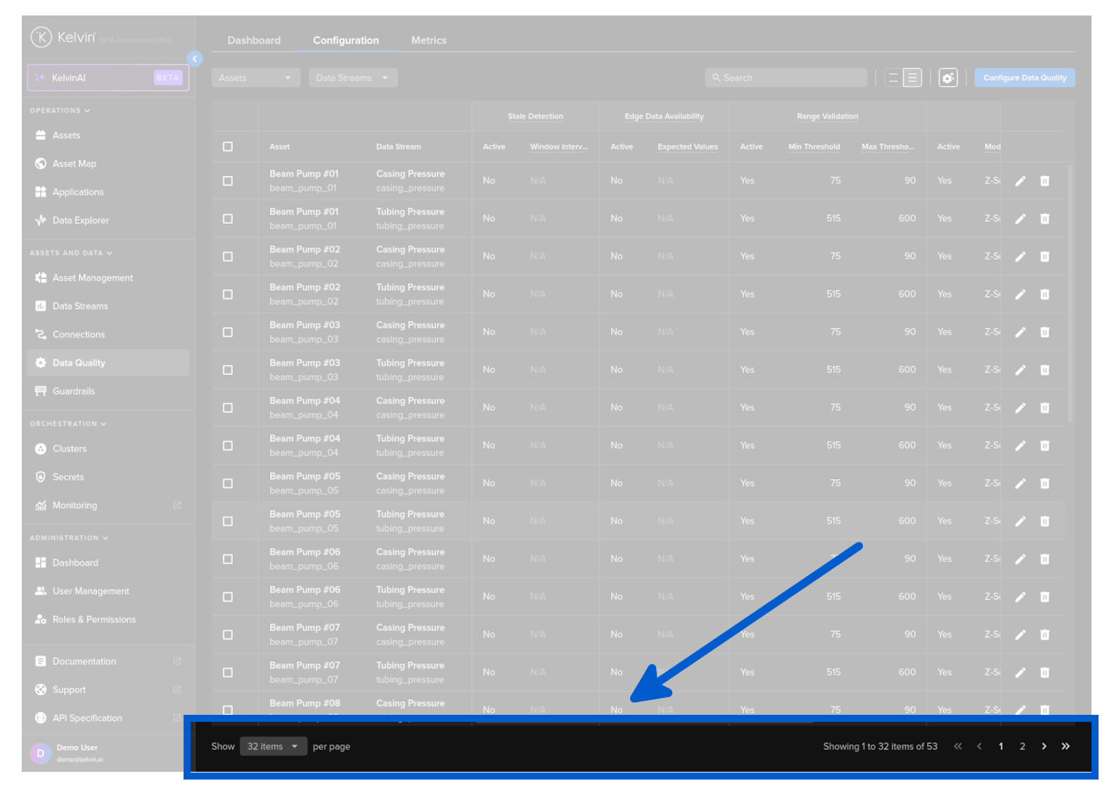 You will then see the Configure Data Quality screen where you can edit the metric settings for each Asset / Data Stream pair.