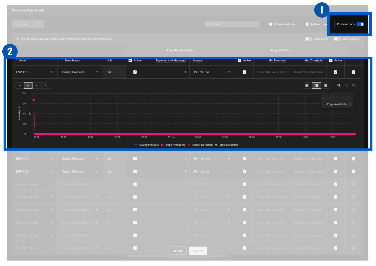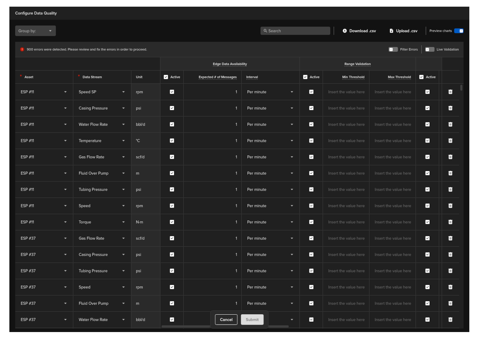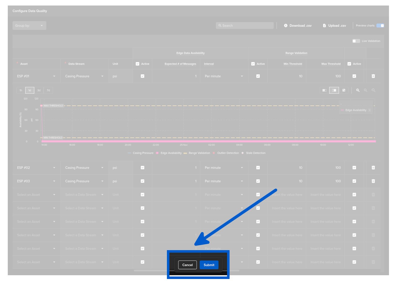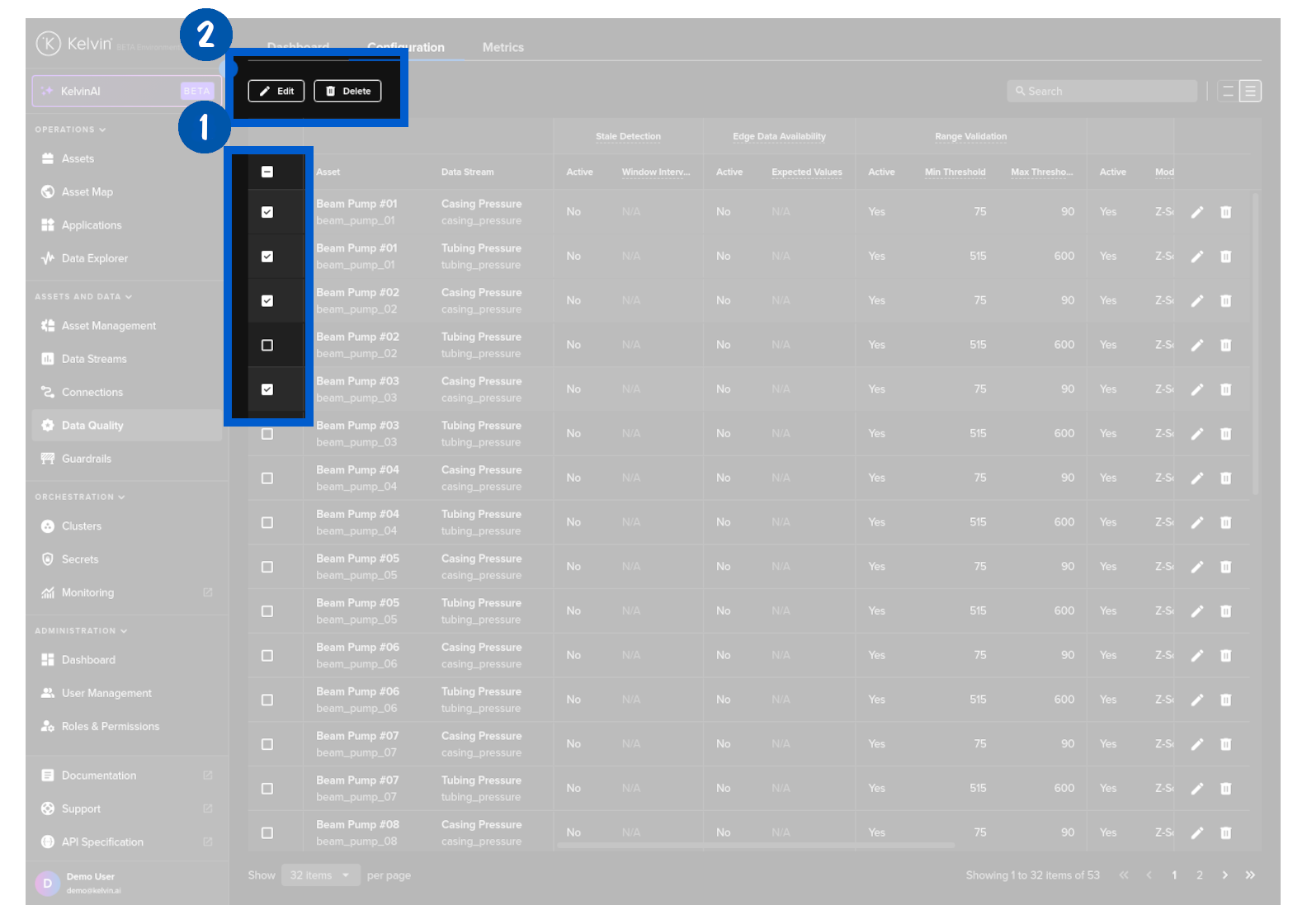 You will then see the Configure Data Quality screen where you can edit the metric settings for each Asset / Data Stream pair.
