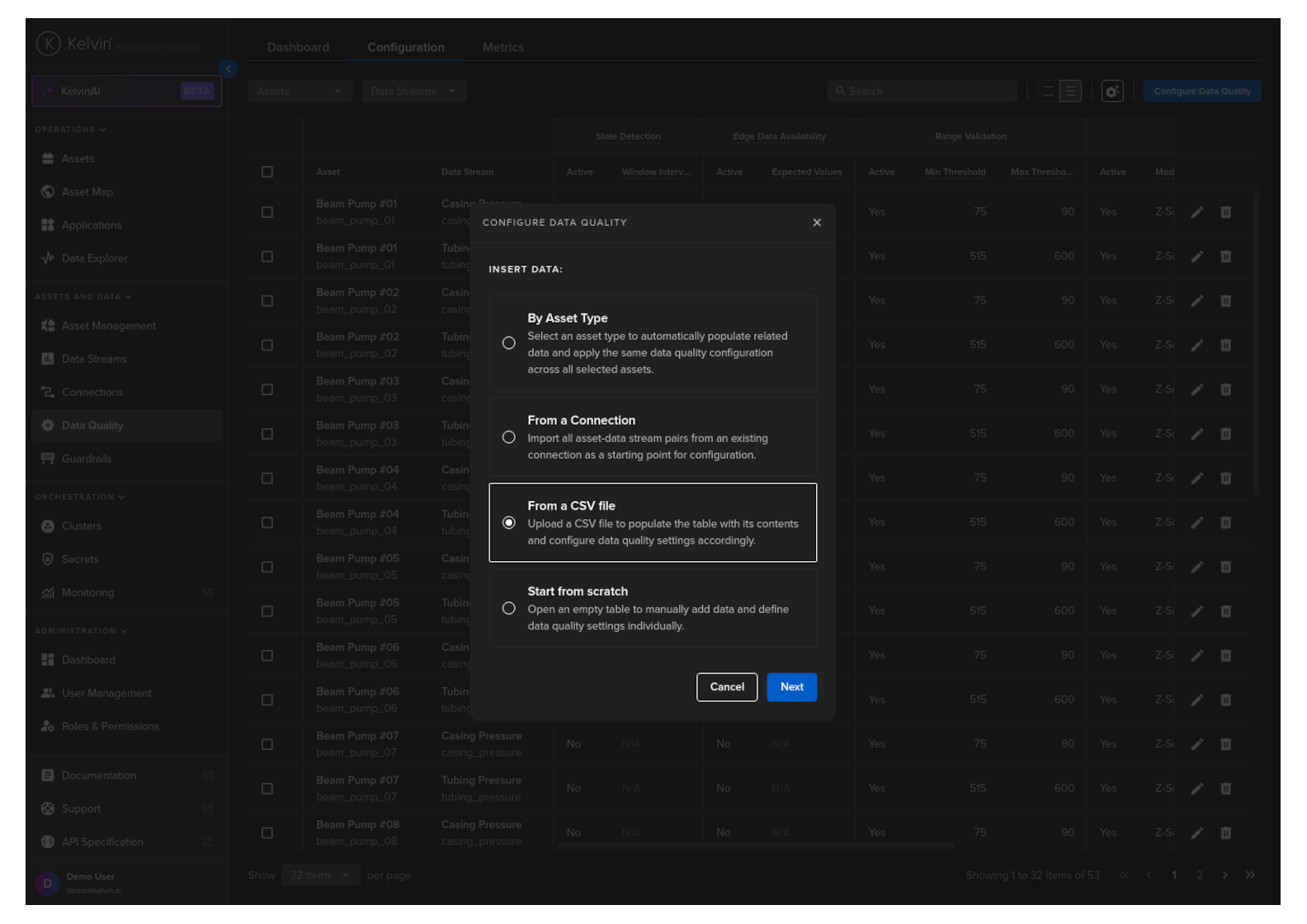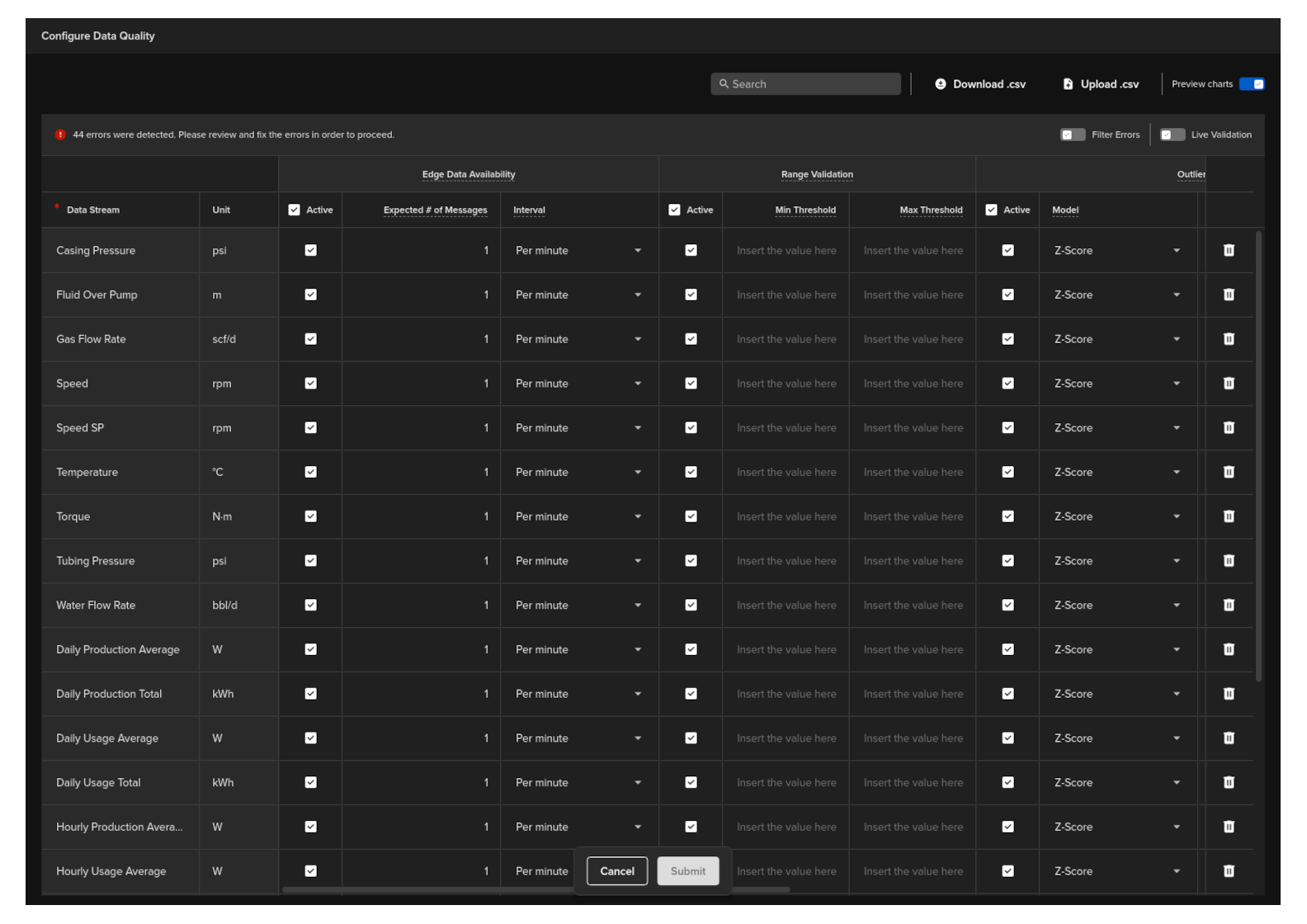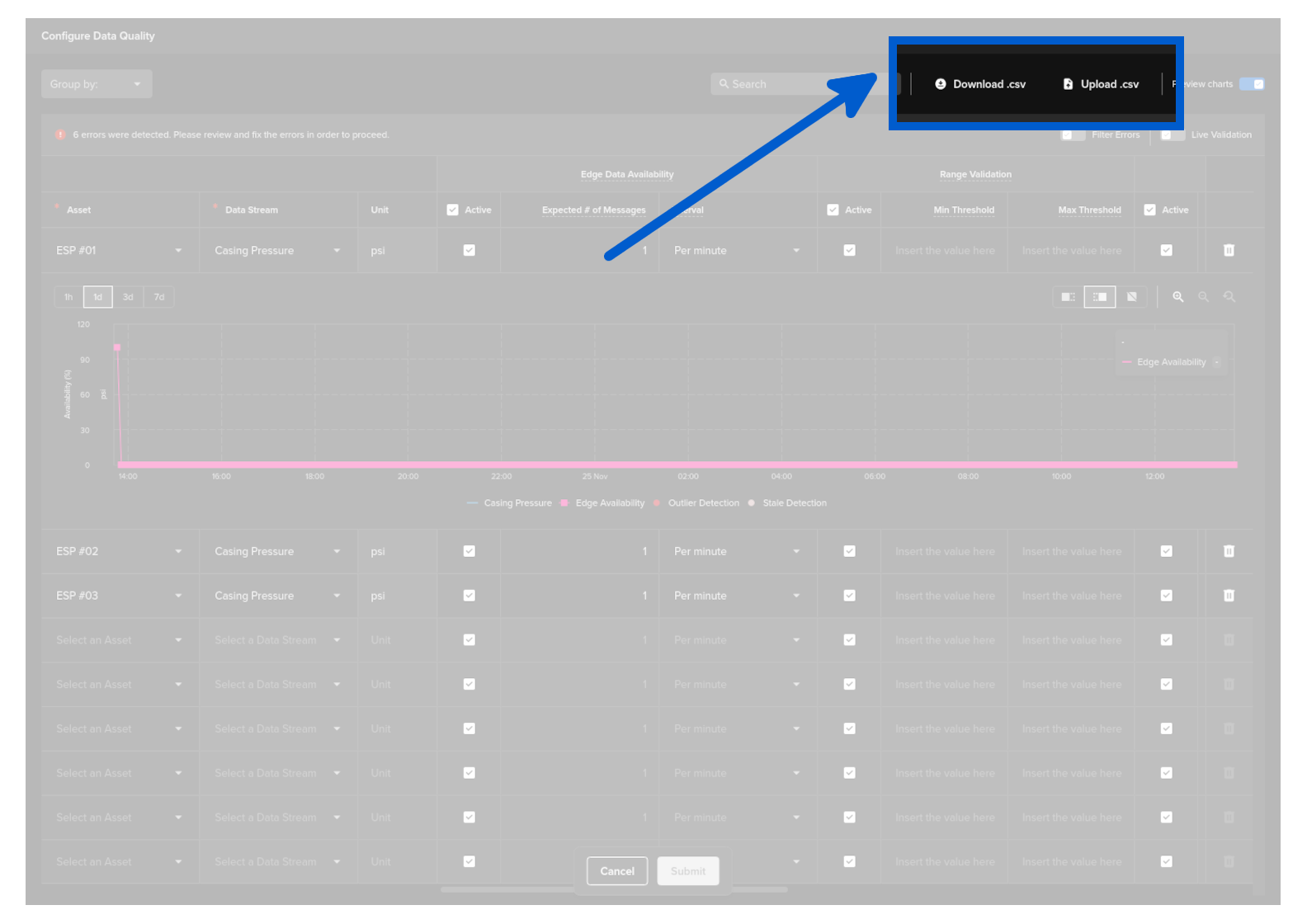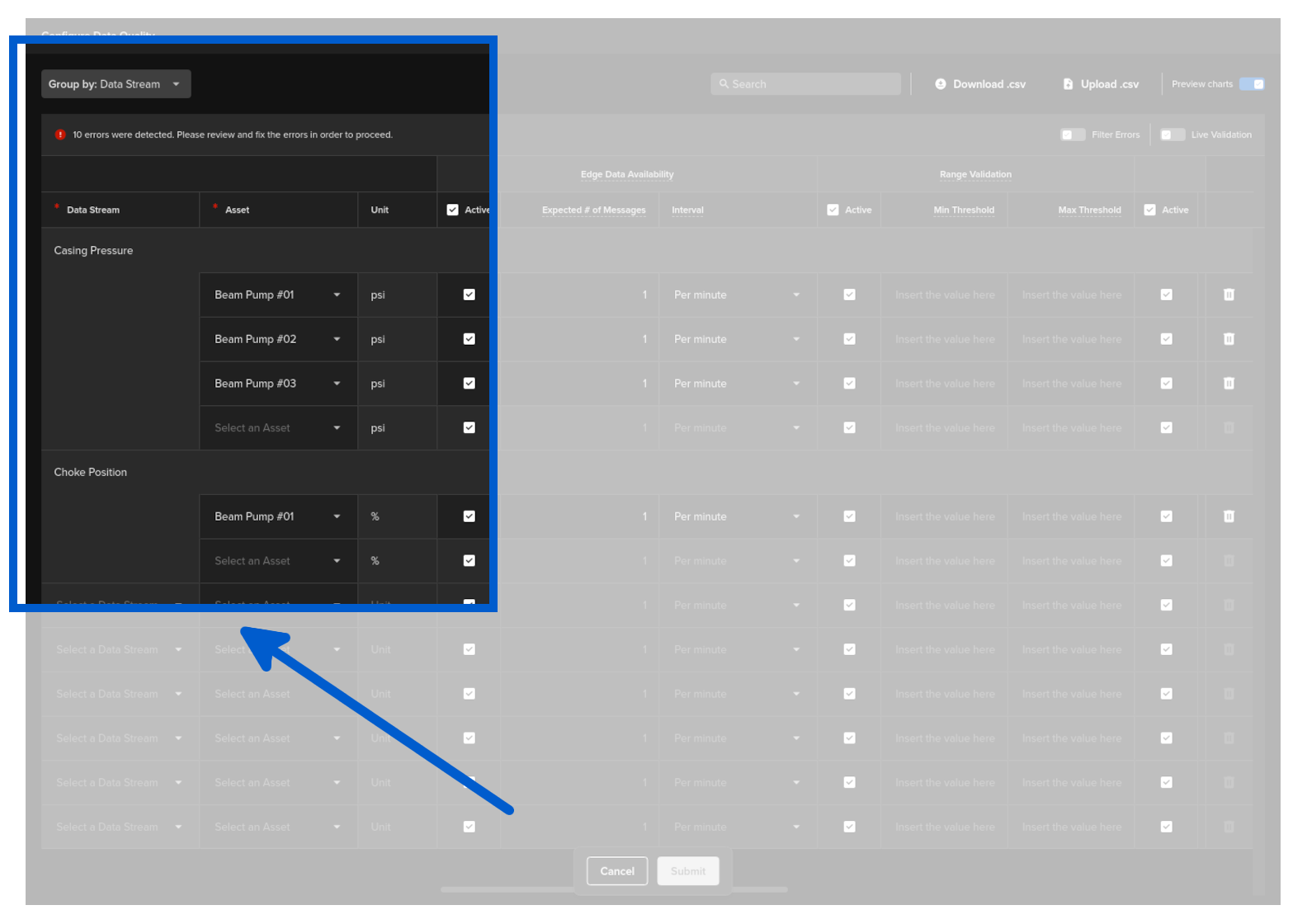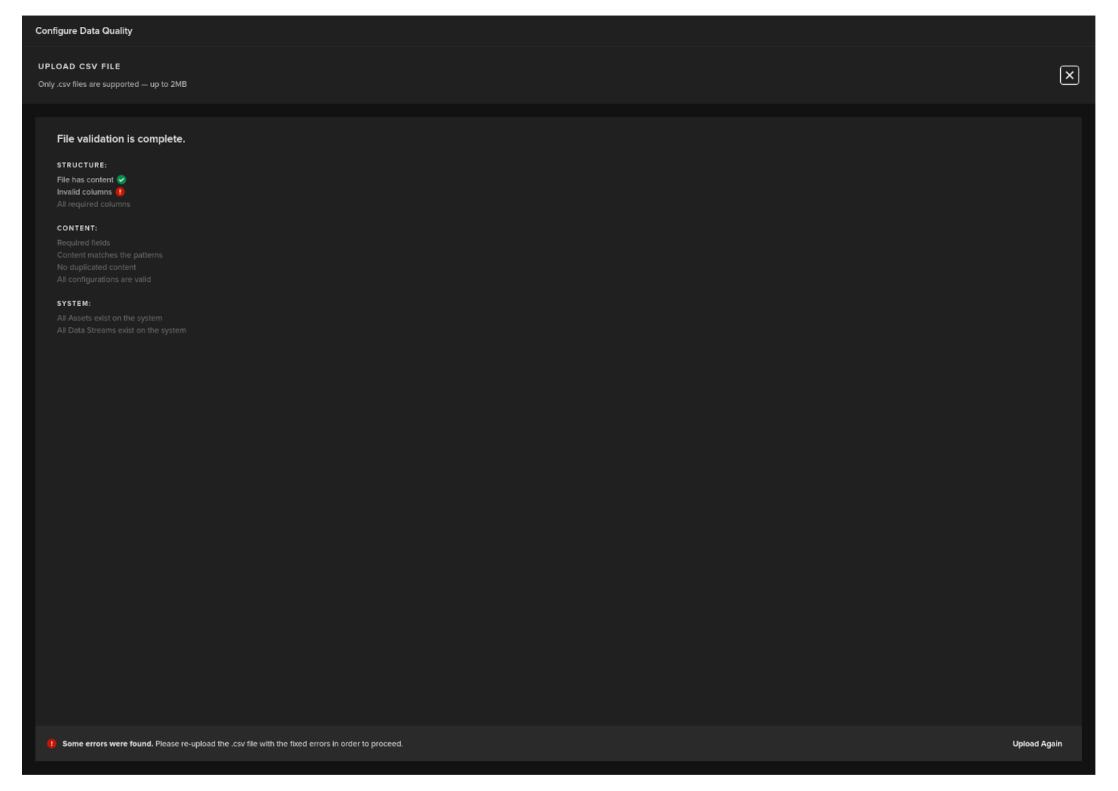 When finished you can upload it back into the table. While uploading, Kelvin will validate the file for errors in the CSV file format before processing.