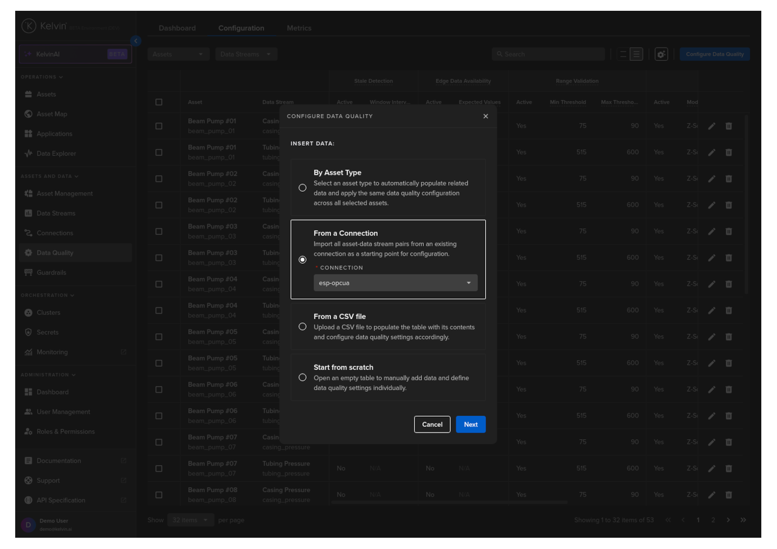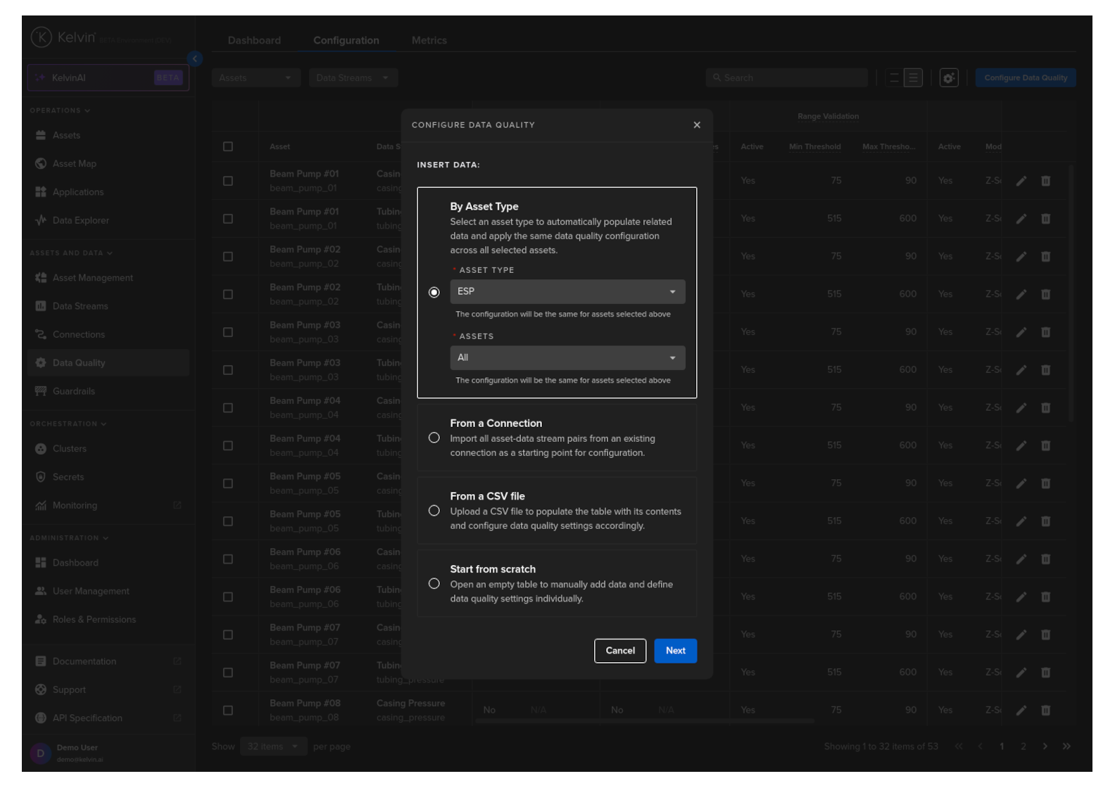 Details of how the Configure Data Quality screen will look is explained above in the Select Assets chapter.