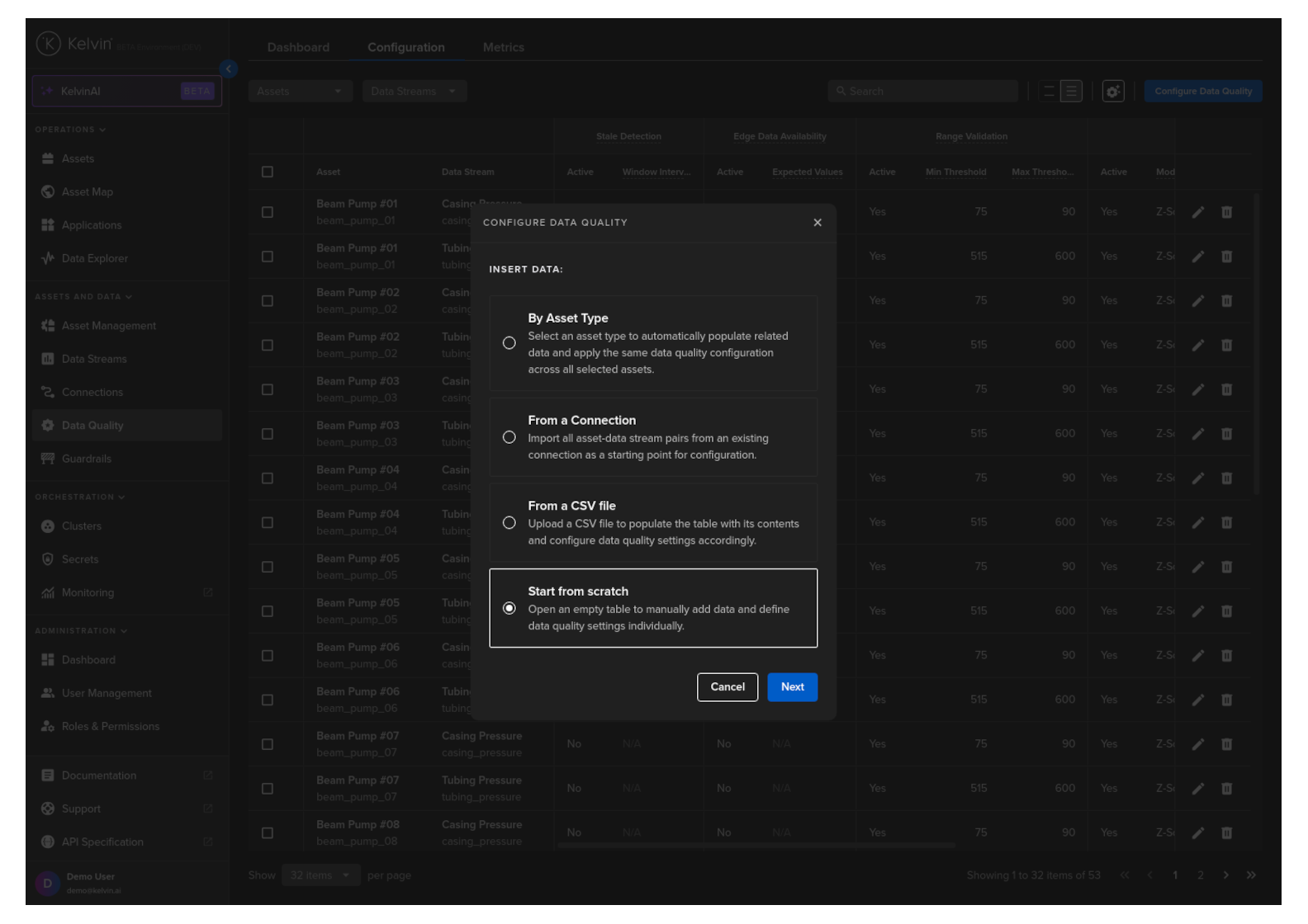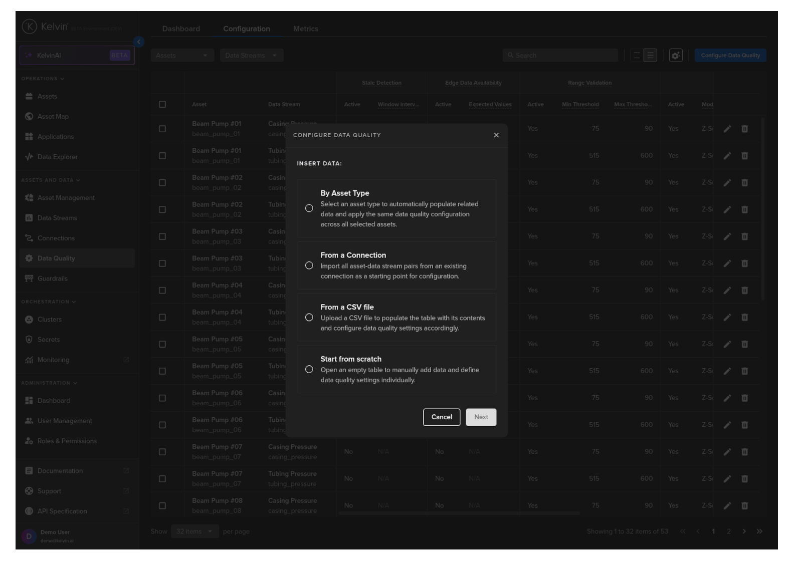 You will then see the Configure Data Quality screen where you can add Asset / Data Stream pairs and edit the metric settings.