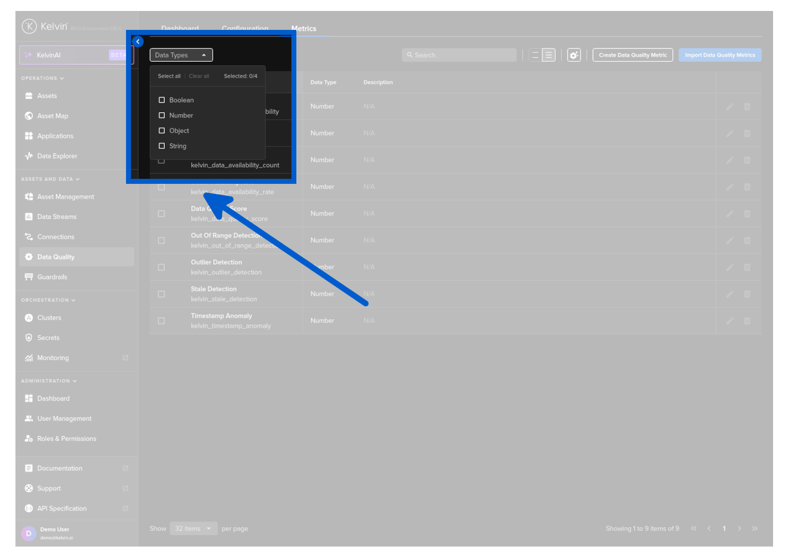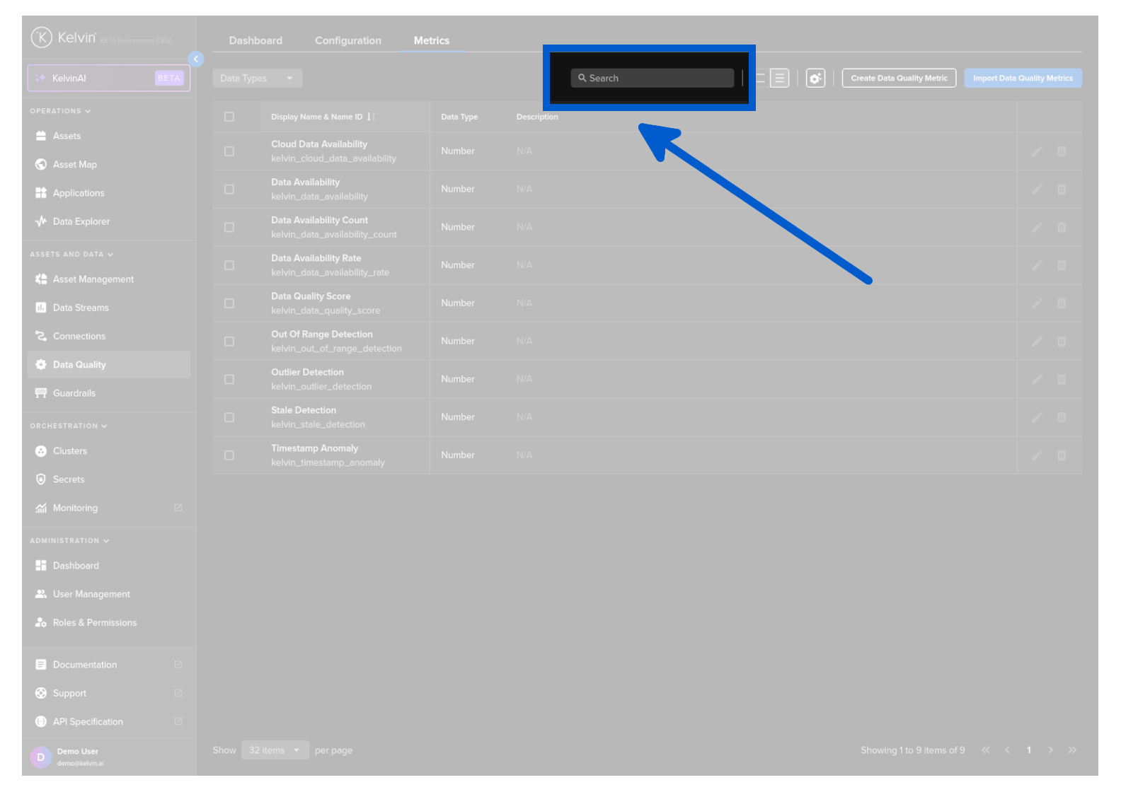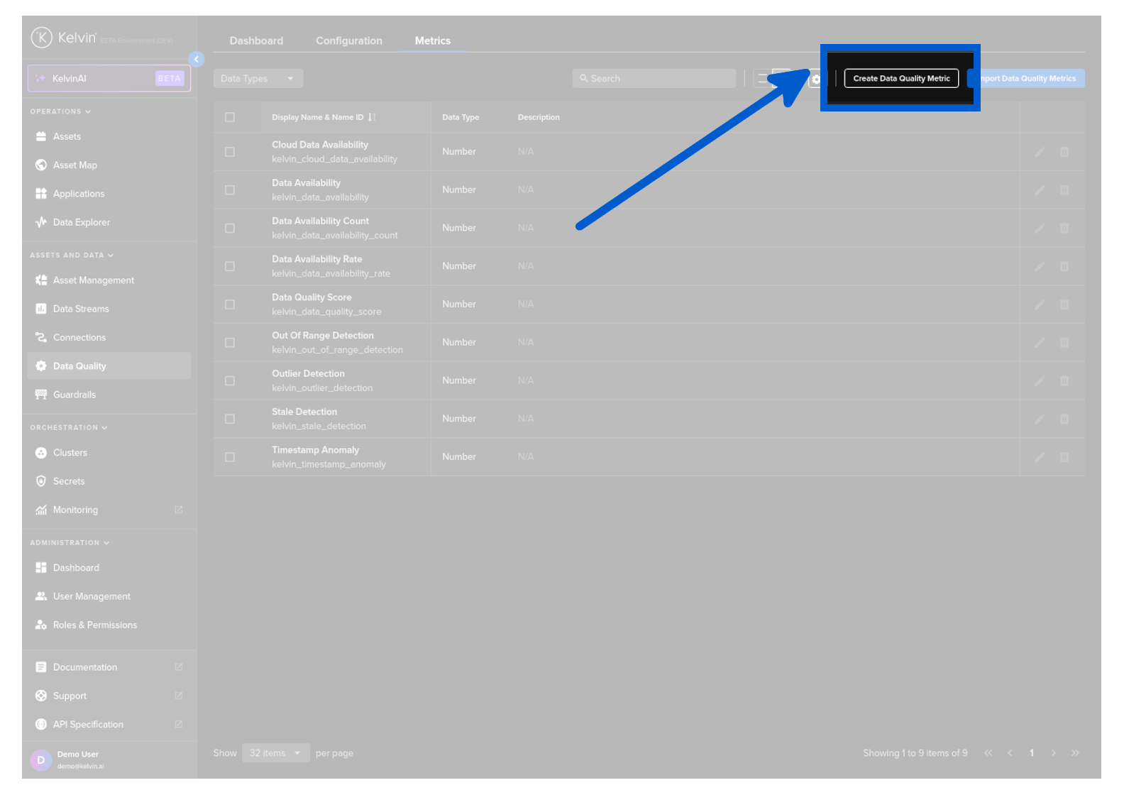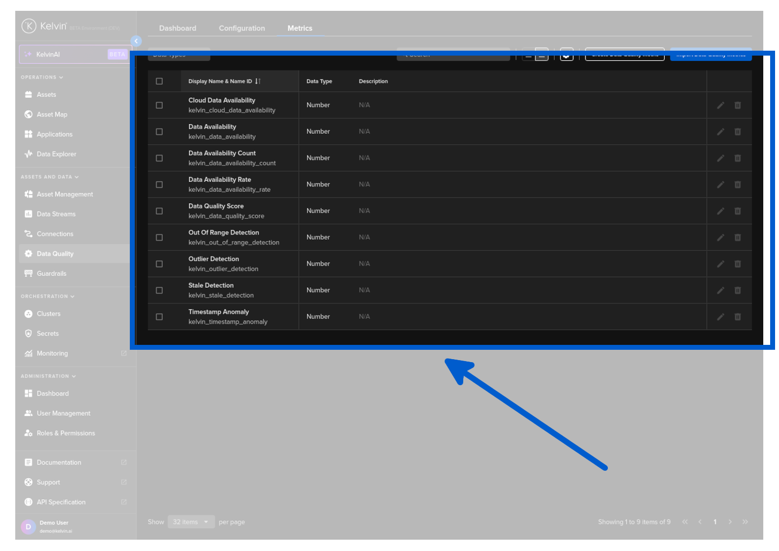 To see the list of Metrics, click on the Data Quality menu item and then the Metrics tab.