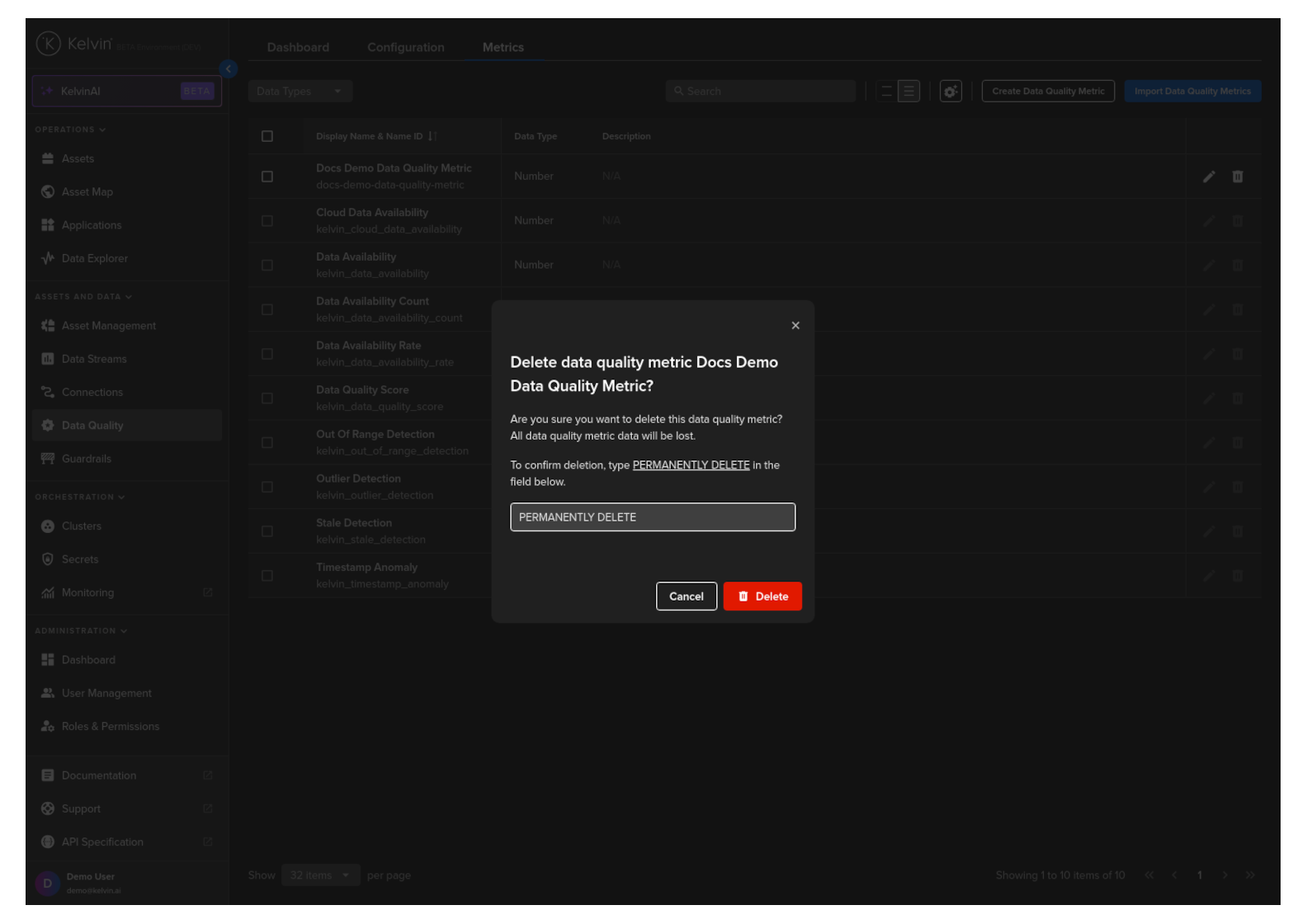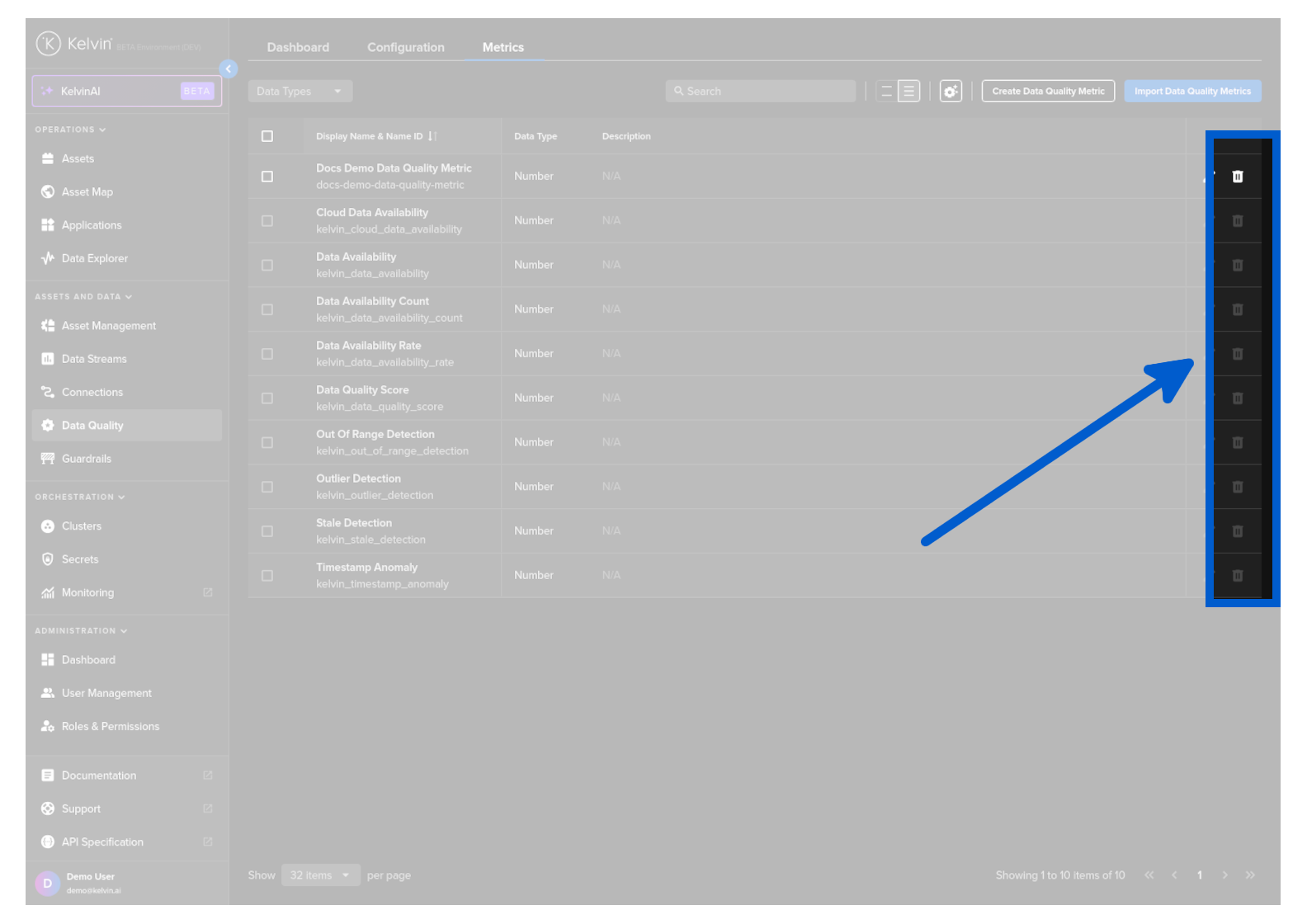 To delete a Data Quality Metric, click on the Delete icon .