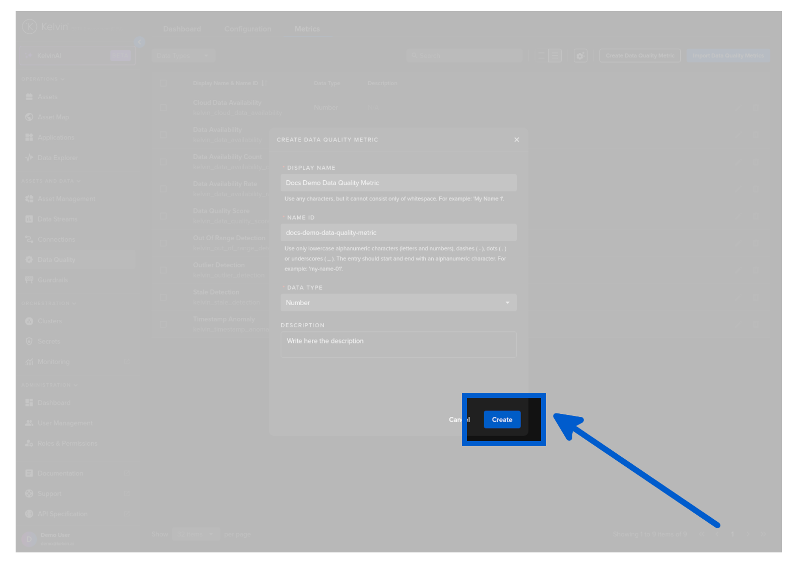 Click on the Create Data Quality Metric button in the top right corner.