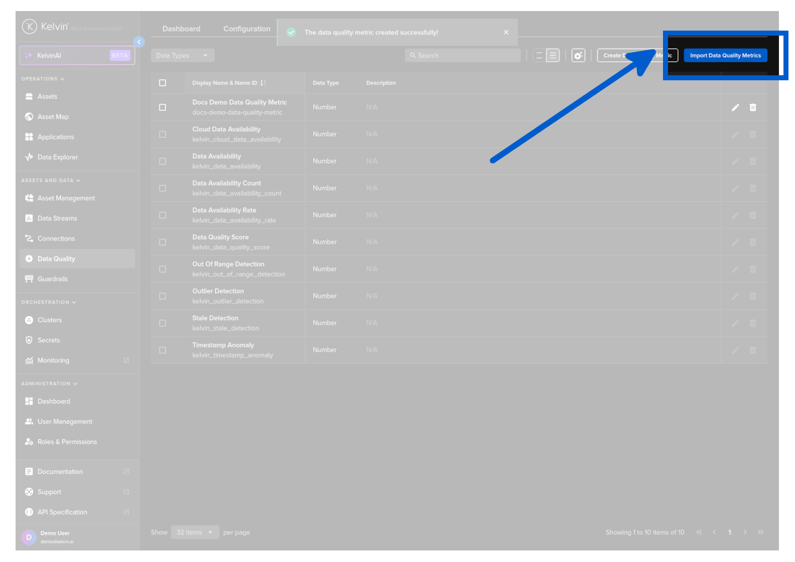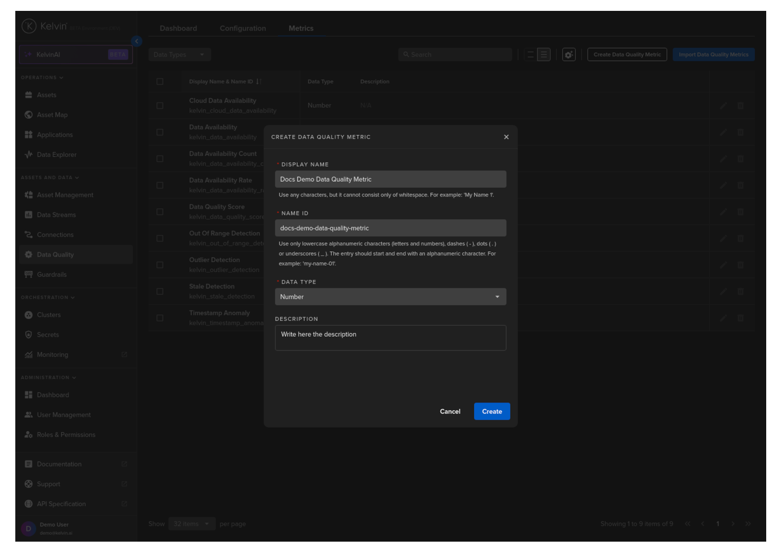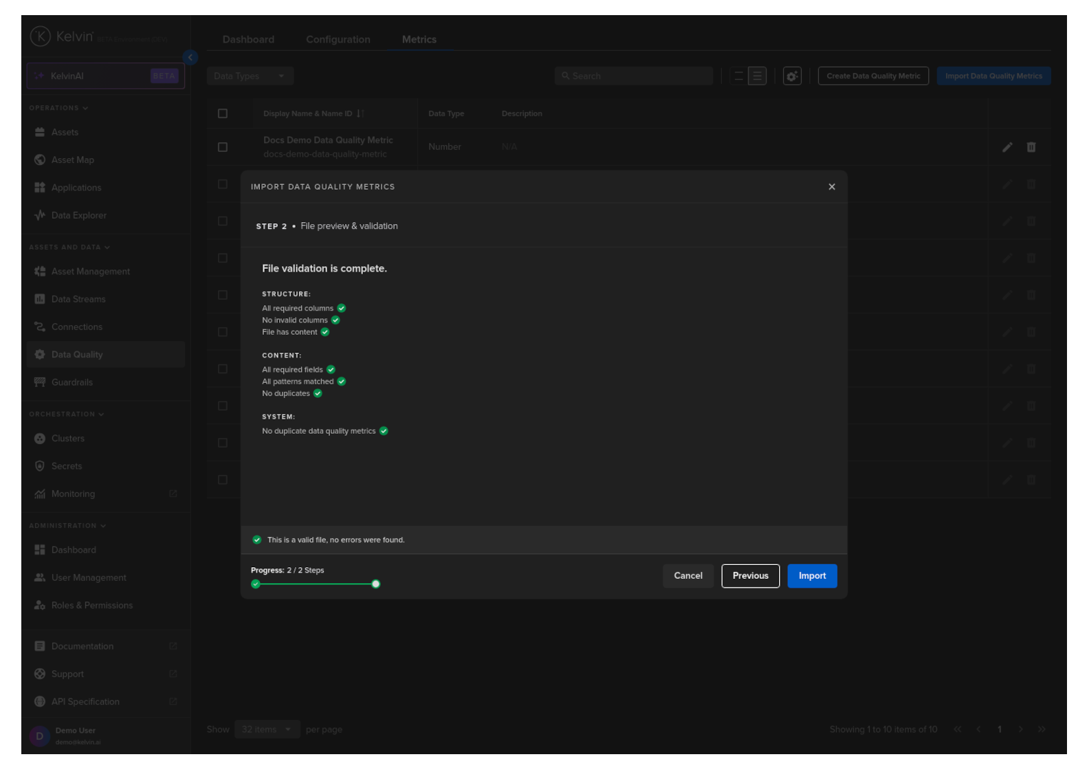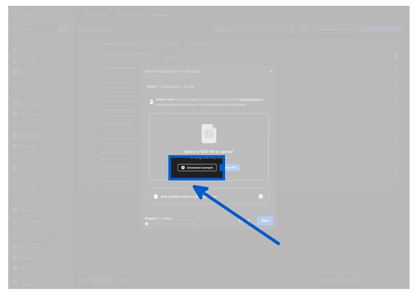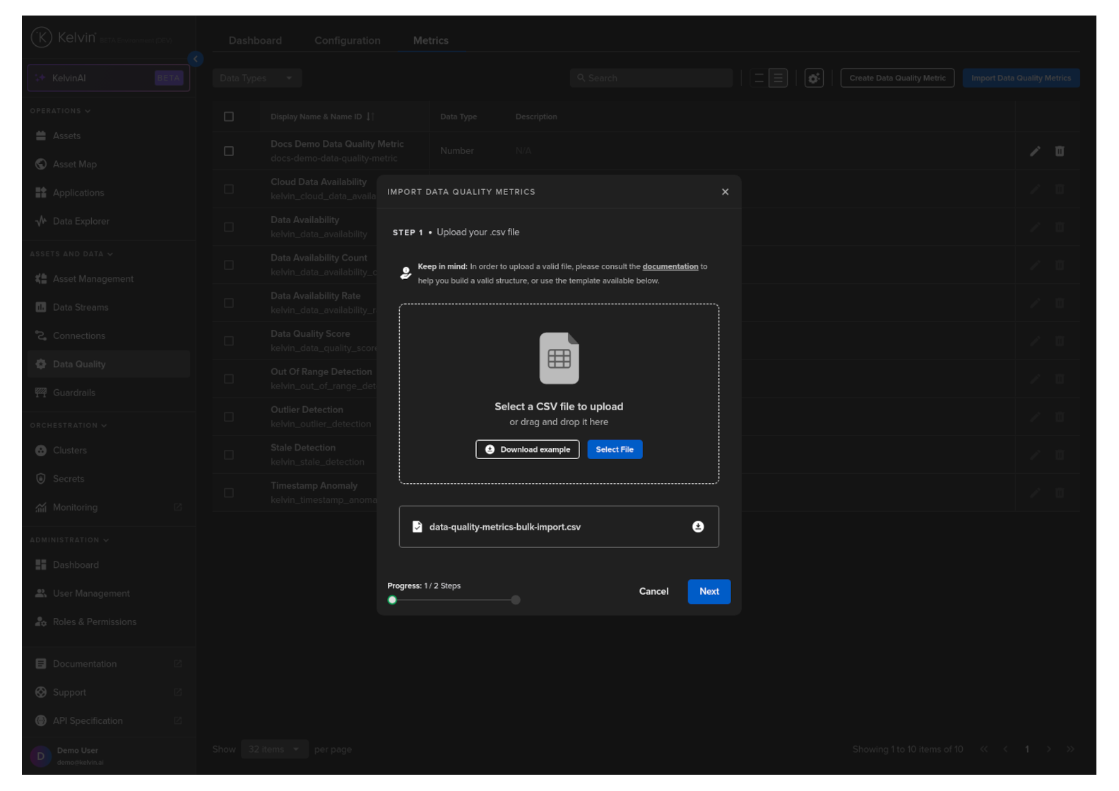 You can create Data Quality Metrics either individually or in bulk by importing a CSV file with the list of new Data Quality Metrics.