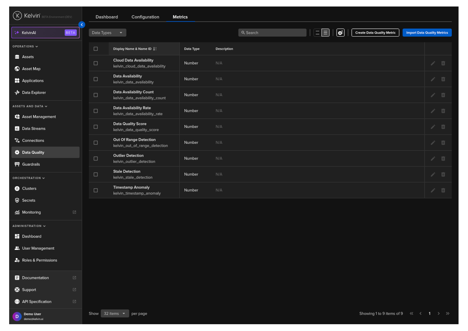 The metrics page shows all the types of Data Quality Metrics available.