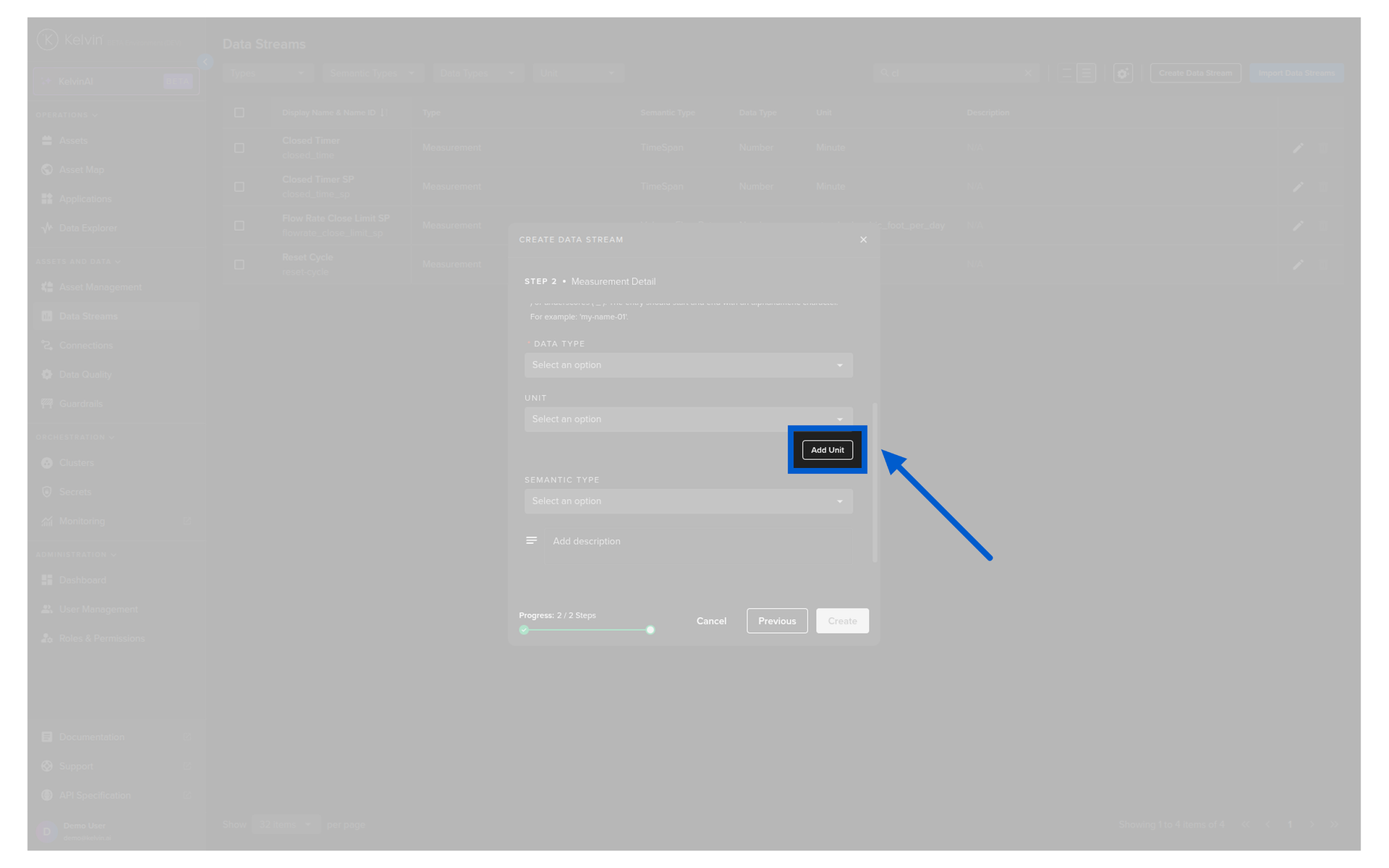 A popup will appear where you can create the new unit. Once created, you can then select it and click Create to create the new Data Stream.