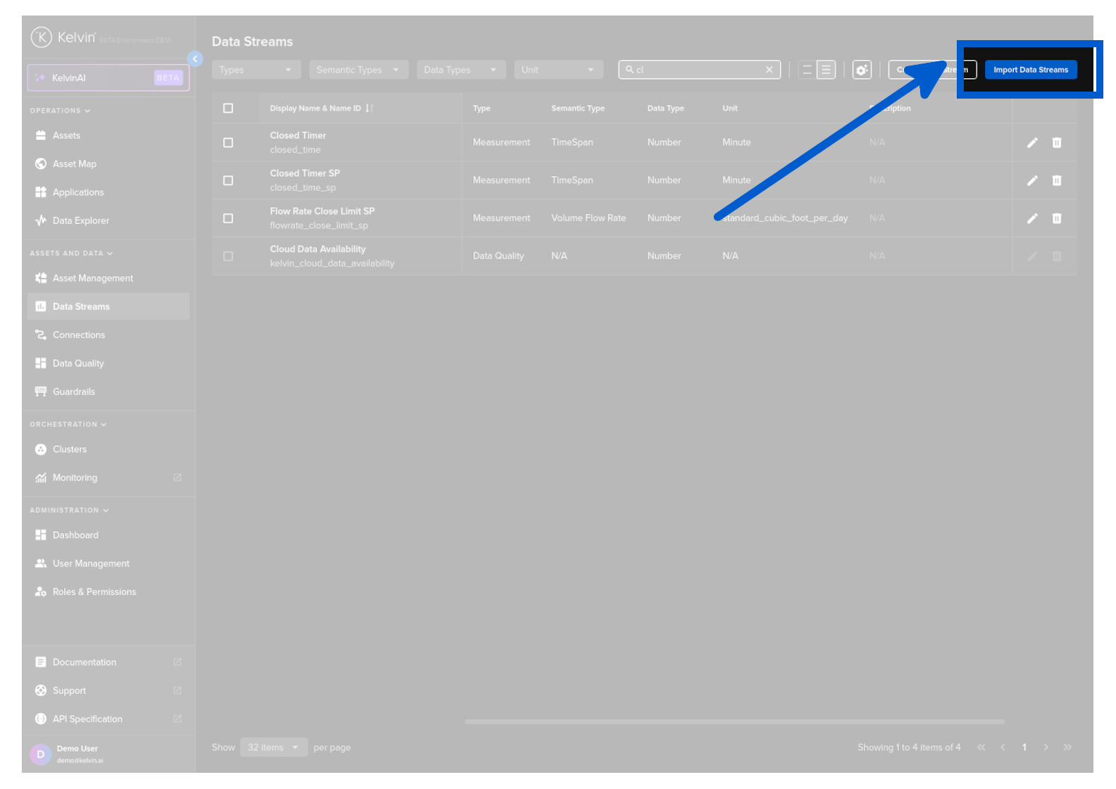 On the Data Streams page, click on the Import Data Streams button.