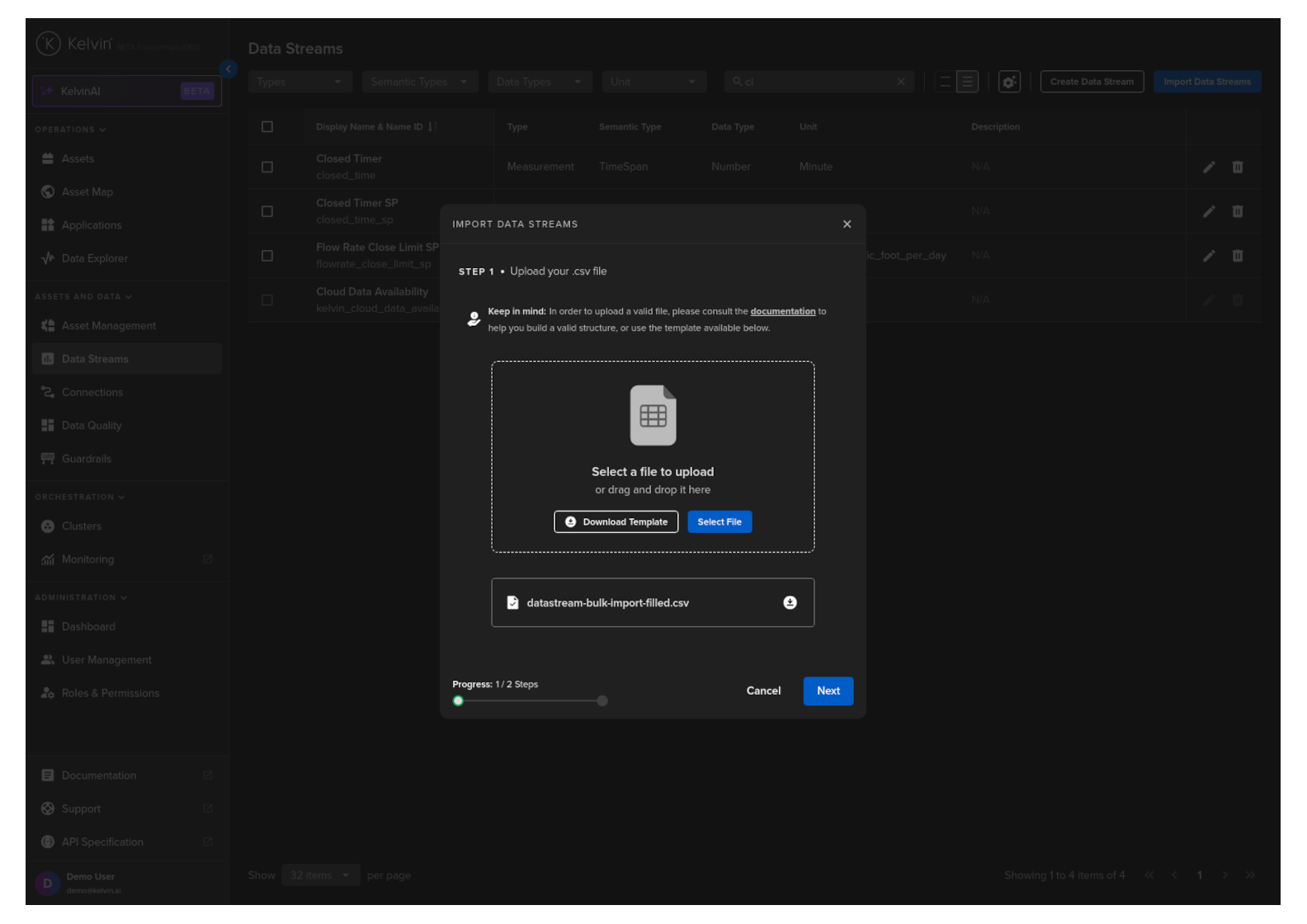 In Step 1, upload your CSV file that you created with all the new Data Stream names you want to create and then click Next.