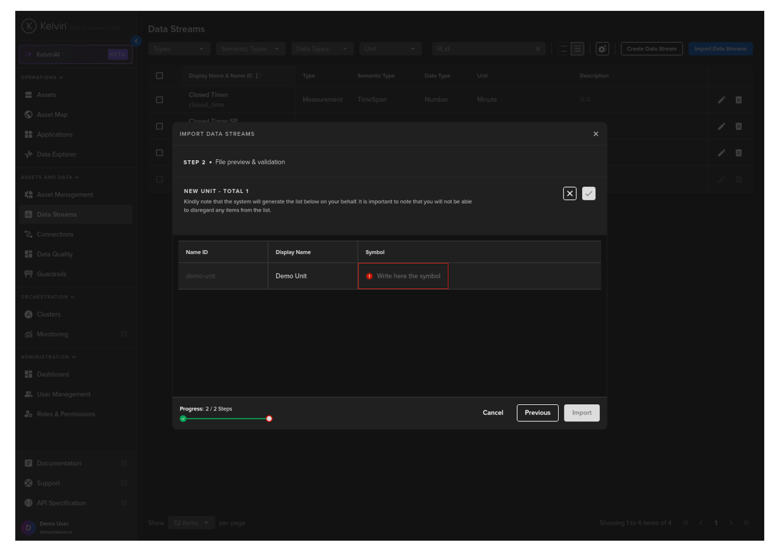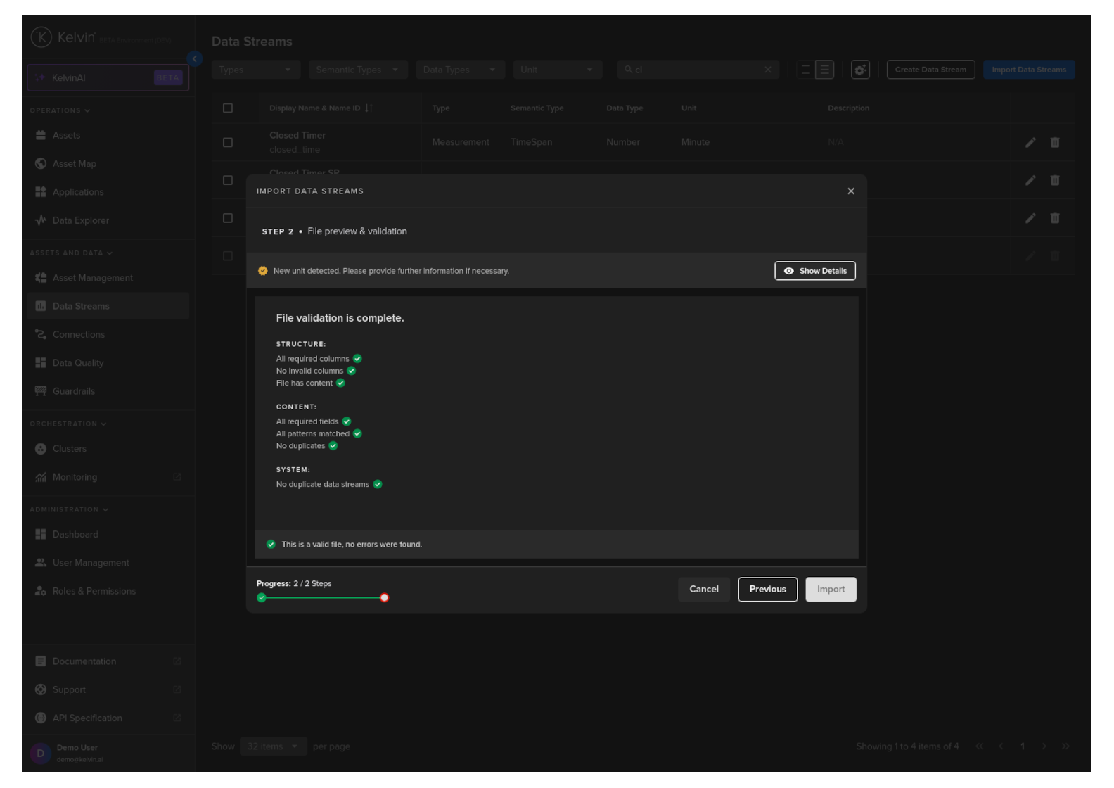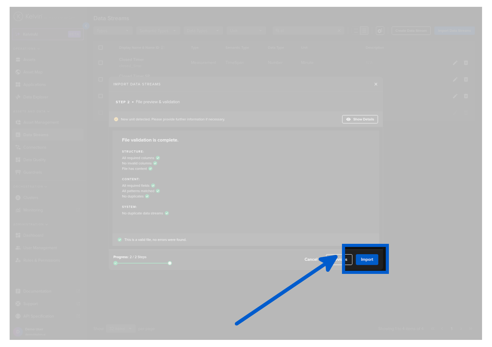 Once filled, then you can click on the tick button and then you will see the Import button is active. You can now click on Import and the Data Streams and Units will be created.