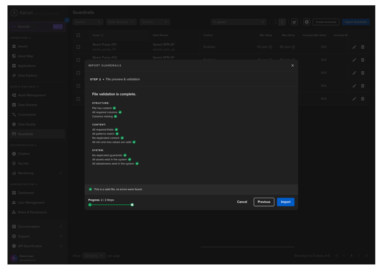 Congratulations, you have imported all your Asset / Data Stream pair guardrails.