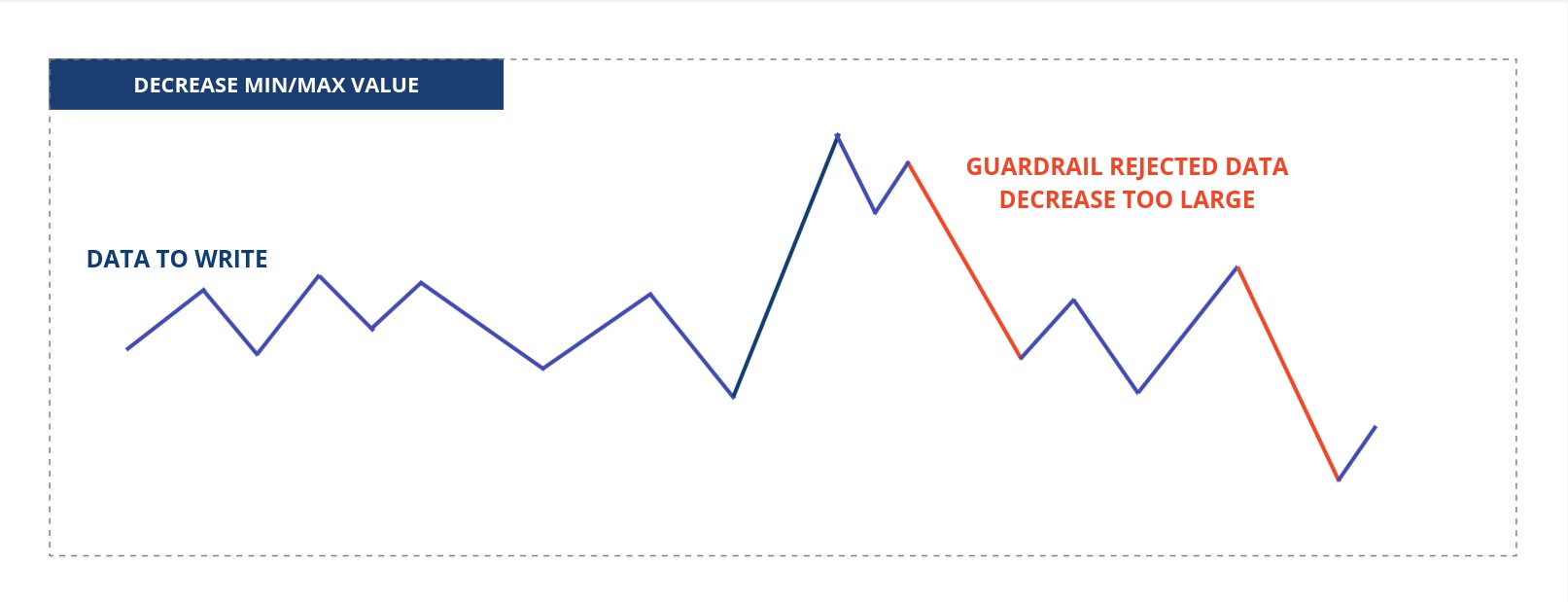 A minimum/maximum decrease limits where the change from the current value to the new value is outside the limits will be rejected by the Guardrail and not sent or written to the Asset.