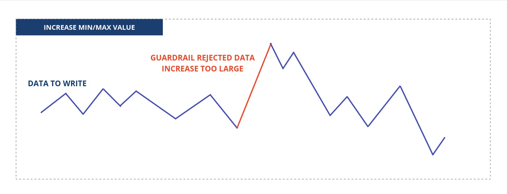 A minimum/maximum increase limits where the change from the current value to the new value is outside the limits will be rejected by the Guardrail and not sent or written to the Asset.