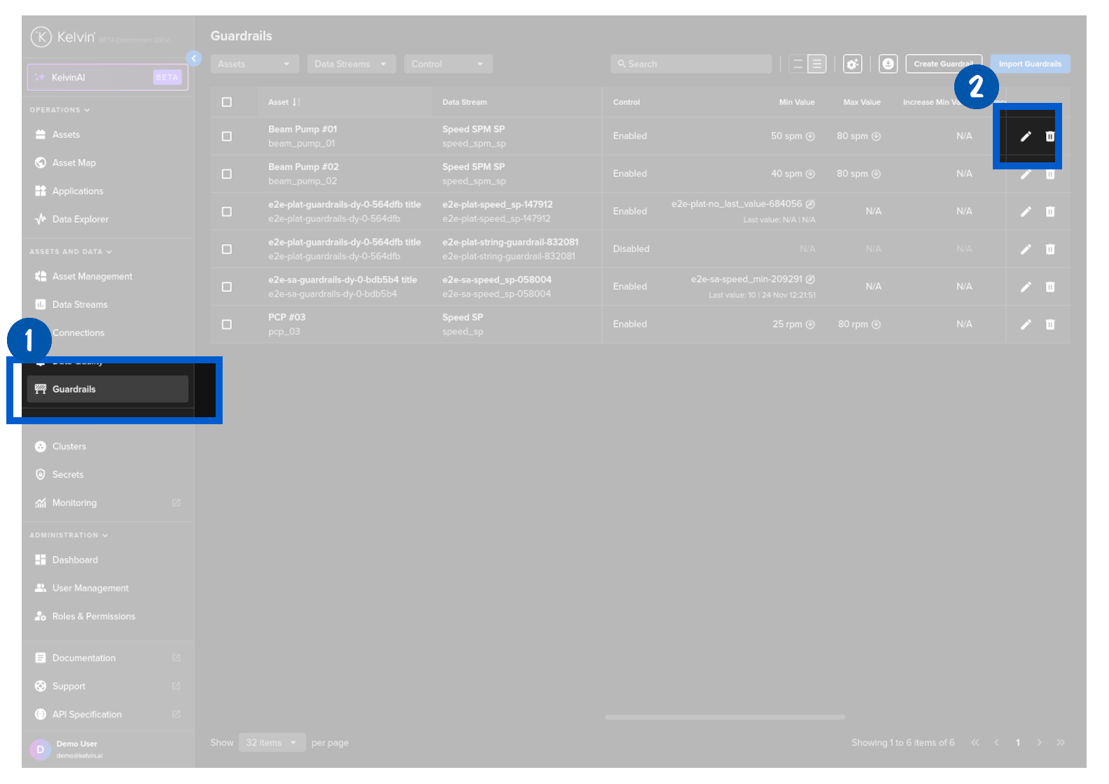 To start, click on Guardrails in the Contextualization section of the left side bar, find the Guardrail you want to update and click on the edit icon on that row.