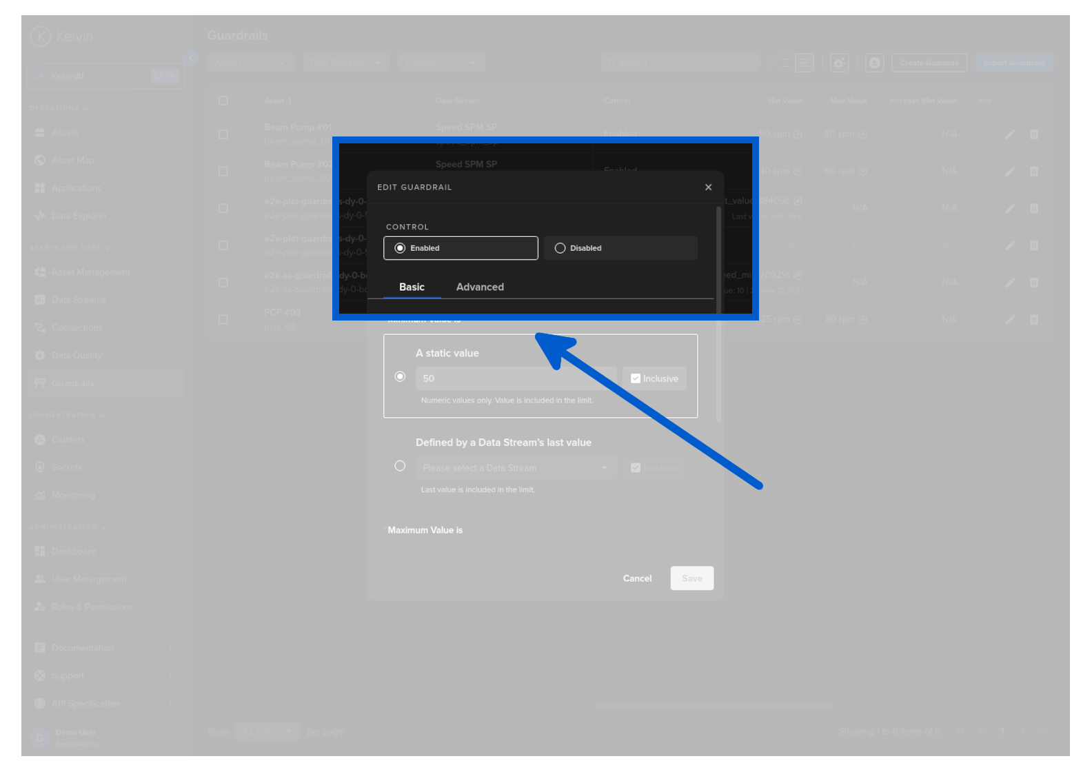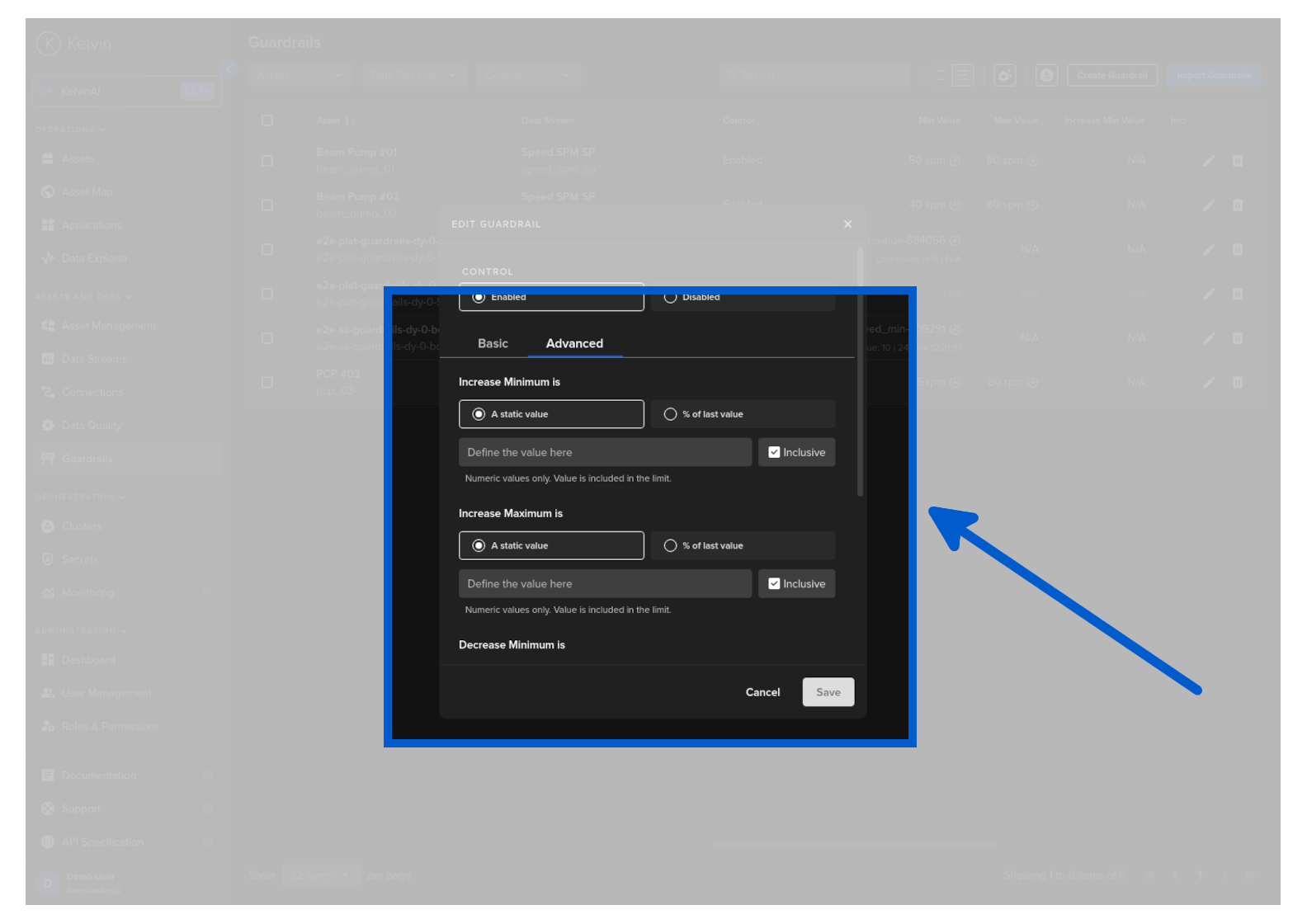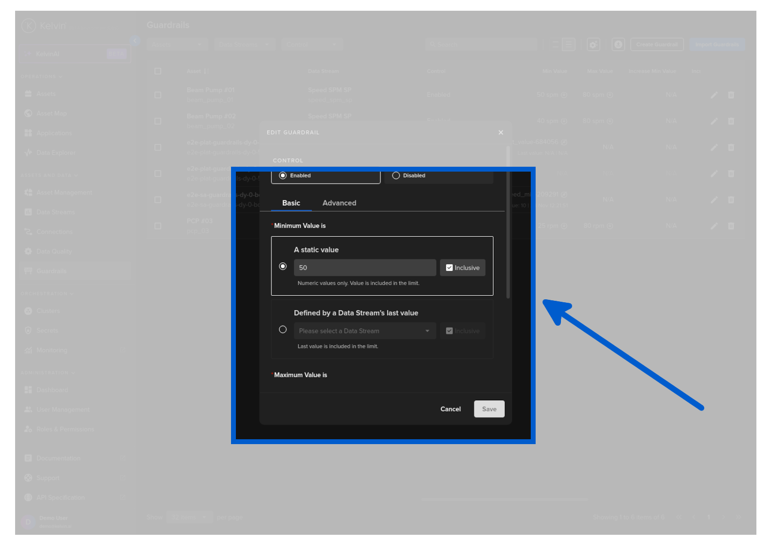 In Step 1 you can select whether to enable the guardrail immediately and set the minimum and maximum values allowed.