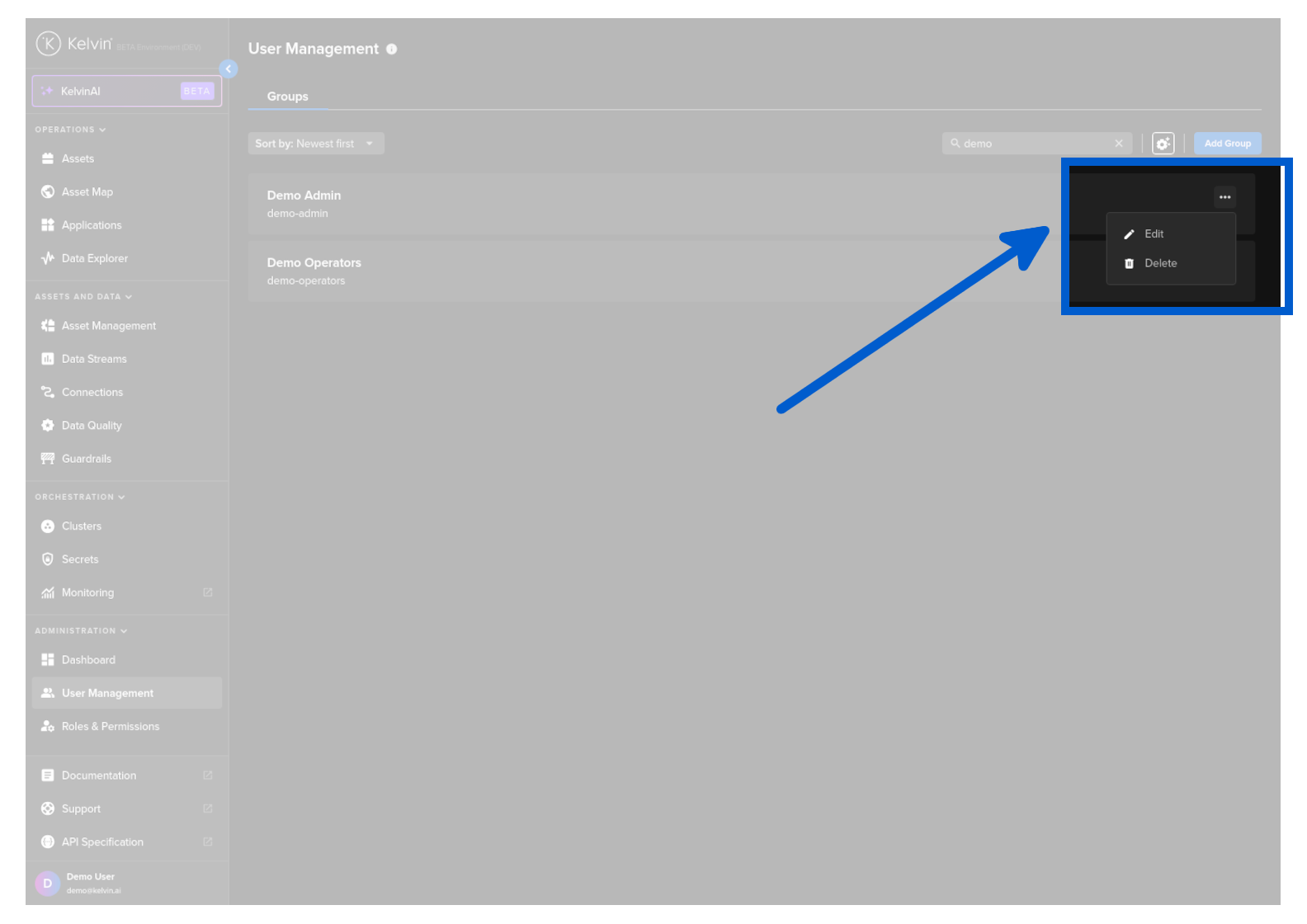 To edit the Group, click on User Management in the Administration section of the left side bar and then click on the options ... at the end of the row that you wish to edit, then click Edit.