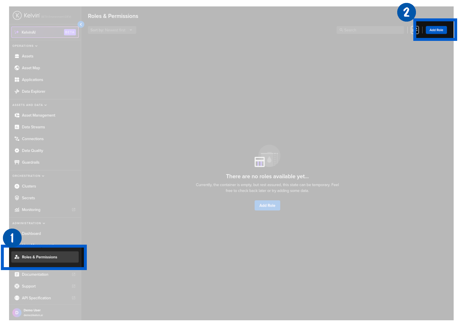 Once the user has access to the Kelvin Platform, the Administrators can assign what rights the user has through Permissions and Policies.