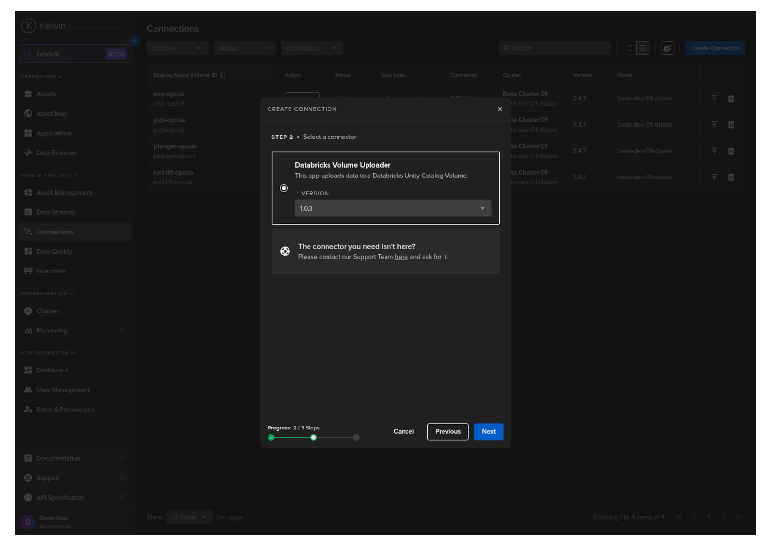 Select the custom Export Connector's name Databricks Volume Uploader option, select a Version and click Next.