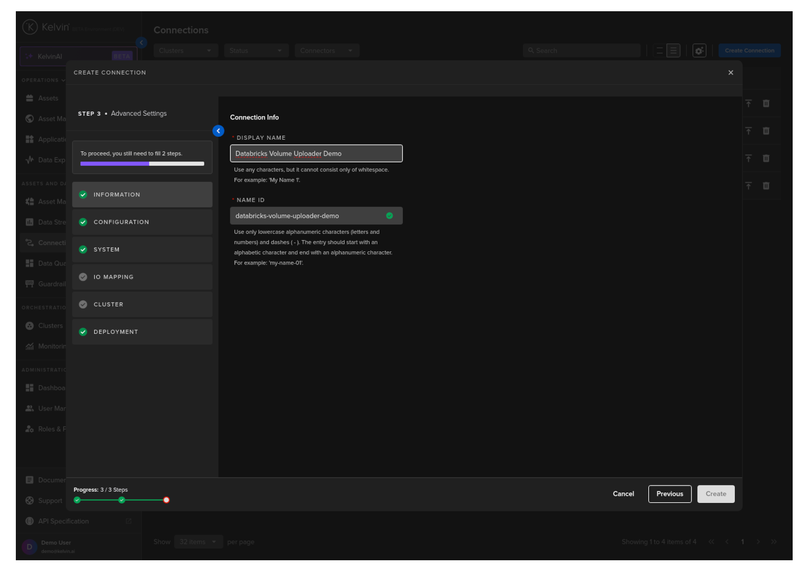 You can then see the status of the Connection in the Connections list going from Pending, Deploying to Running. It will start automatically, connect to the asset and start sending data to your Databricks Volume and Delta Table.