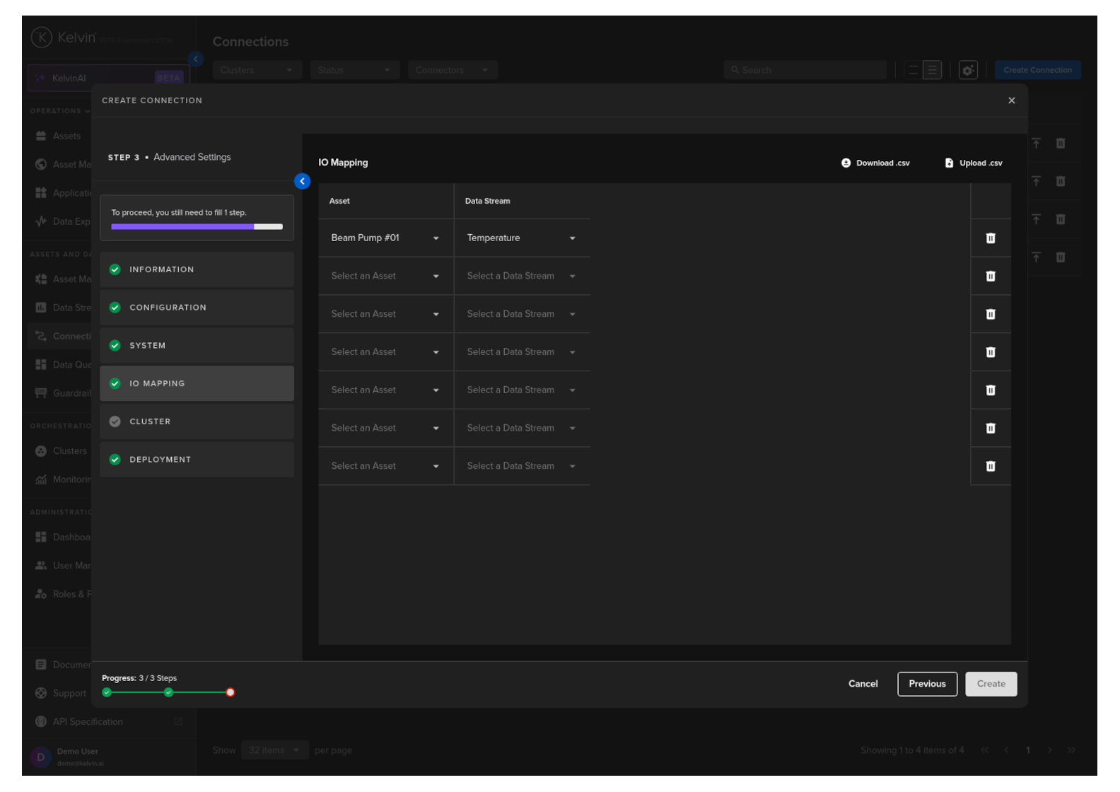 If you have many connection IO to fill in, you can save time with the download/upload csv file option in the top right hand corner of the popup.